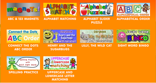 Choose one of the five cathegories of words to spell and click a picture to spell it.