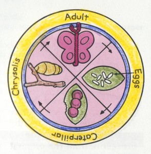 Butterfly life cycle wheels provide a wonderful visual demonstration to help kids explain how a caterpillar turns into a butterfly.All you’ll need is a white paper plate, a coloring sheet of the butterfly life cycle, crayons, glue and scissors.After teaching my children about the 4 different stages in the butterfly’s life cycle, they colored all of the stages. Then I let them cut around each picture, and glue them on to the paper plate themselve.