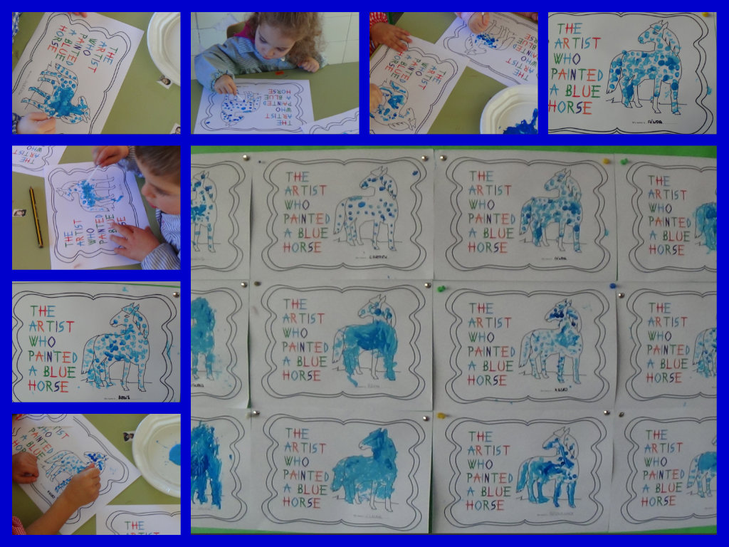 Further, we read the Eric Carle’s book called “The artist who painted a blue horse”. Looking inside, children discovered a child who paints a number of animals with unconventional colours and he declares “I am an artist…..”