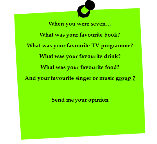 When I was seven, my favourite book was TEA STILTON. My favourite TV programme was Pokemon. My favourite drink was water. My favourite food was salad and my favourite