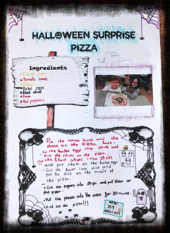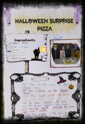 So, they were organized in groups of 3 or 4 based on the skill level of the students in order to make a Halloween pizza. First, they searched for images of Halloween pizzas on the internet and they chose the one they liked most for their recipes.Then, they decided what ingredients they are going to need and they wrote the recipes. Finally, they made the pizzas and the staff of our school canteen baked them into the oven following their instructions. They were spook-tacular!!!!