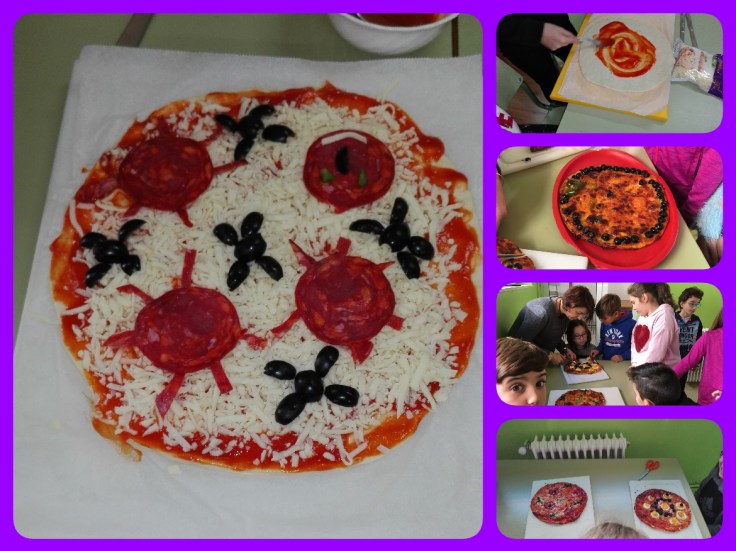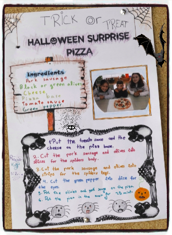 Organizouse a clase en grupos de tres ou catro alumnos con distintos niveis de destreza para facer unha pizza de Halloween. Primeiro buscaron na internet imaxes de pizzas de Halloween e escolleron entre todos cal era a que máis lle gustaba. Logo, decidiron que ingredientes ían necesitar (un bó momento para interactuar con eles sobre os seus gustos) e escribiron as receitas. Finalmente, as prepararon e o persoal de cociña quentóunolas. Estaban de morte!!!!!