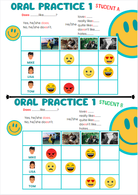 This is a pair work activity which students have to complete the missing information by asking a series of yes/no questions and giving information about people’s interest.