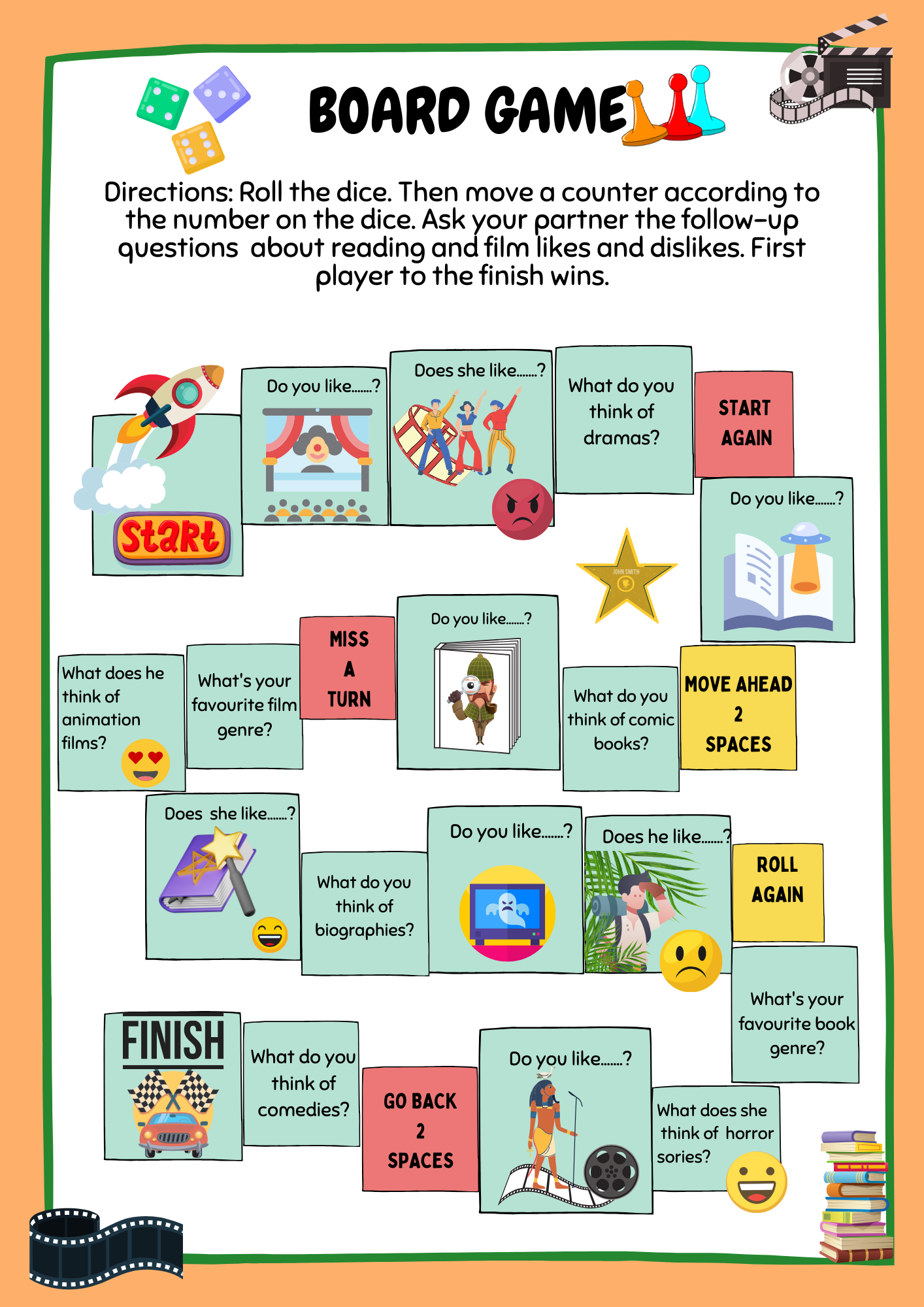 Here you have some games we use for revising vocabulary related to books and films genres. They are also perfect for practicing grammar(likes and dislikes), tenses and speaking and listening.