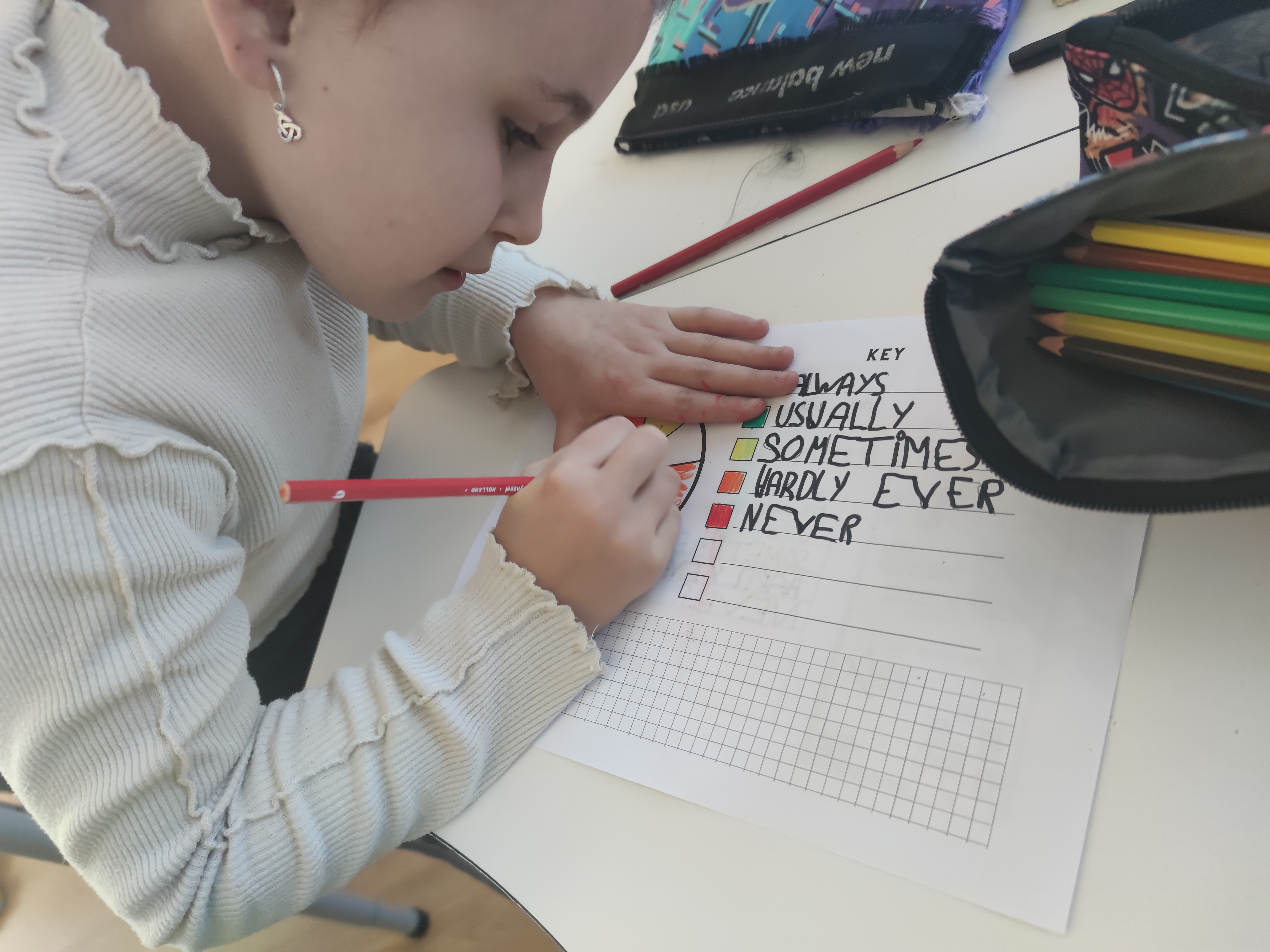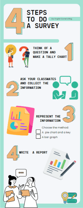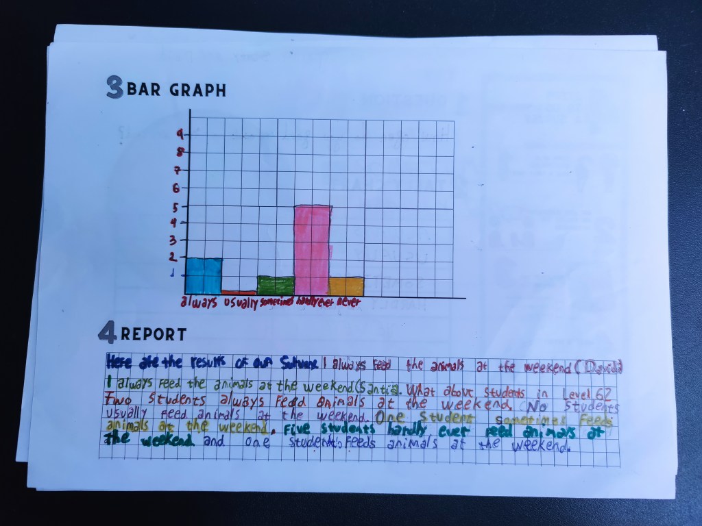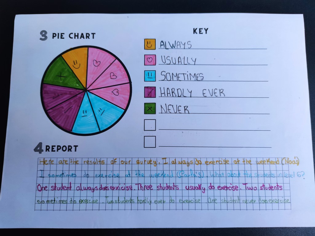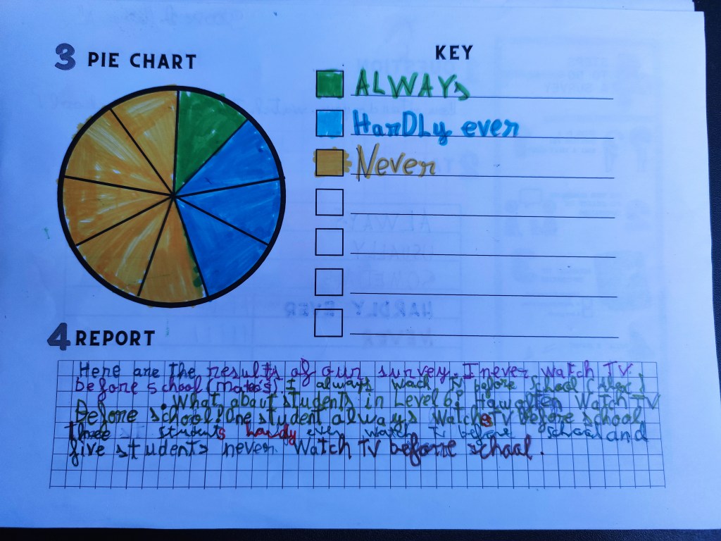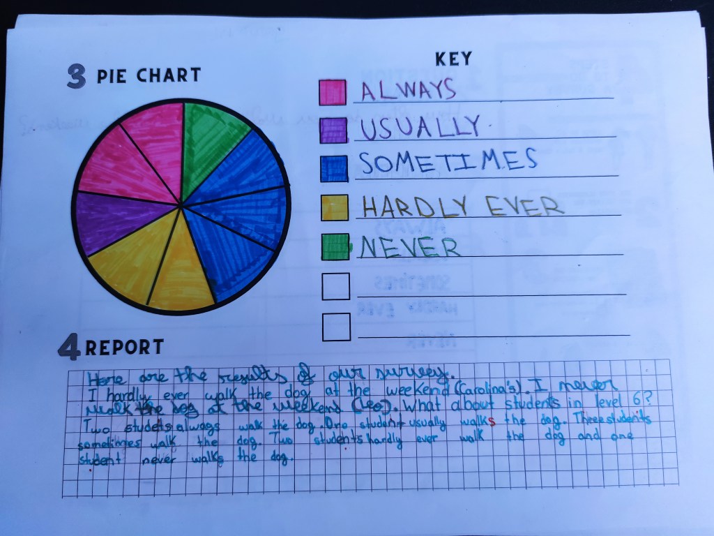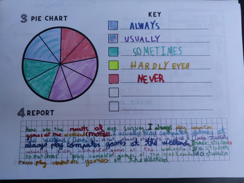 The main aim in this level was each pair to use their initiative to choose a survey topic and write the appropiate question.