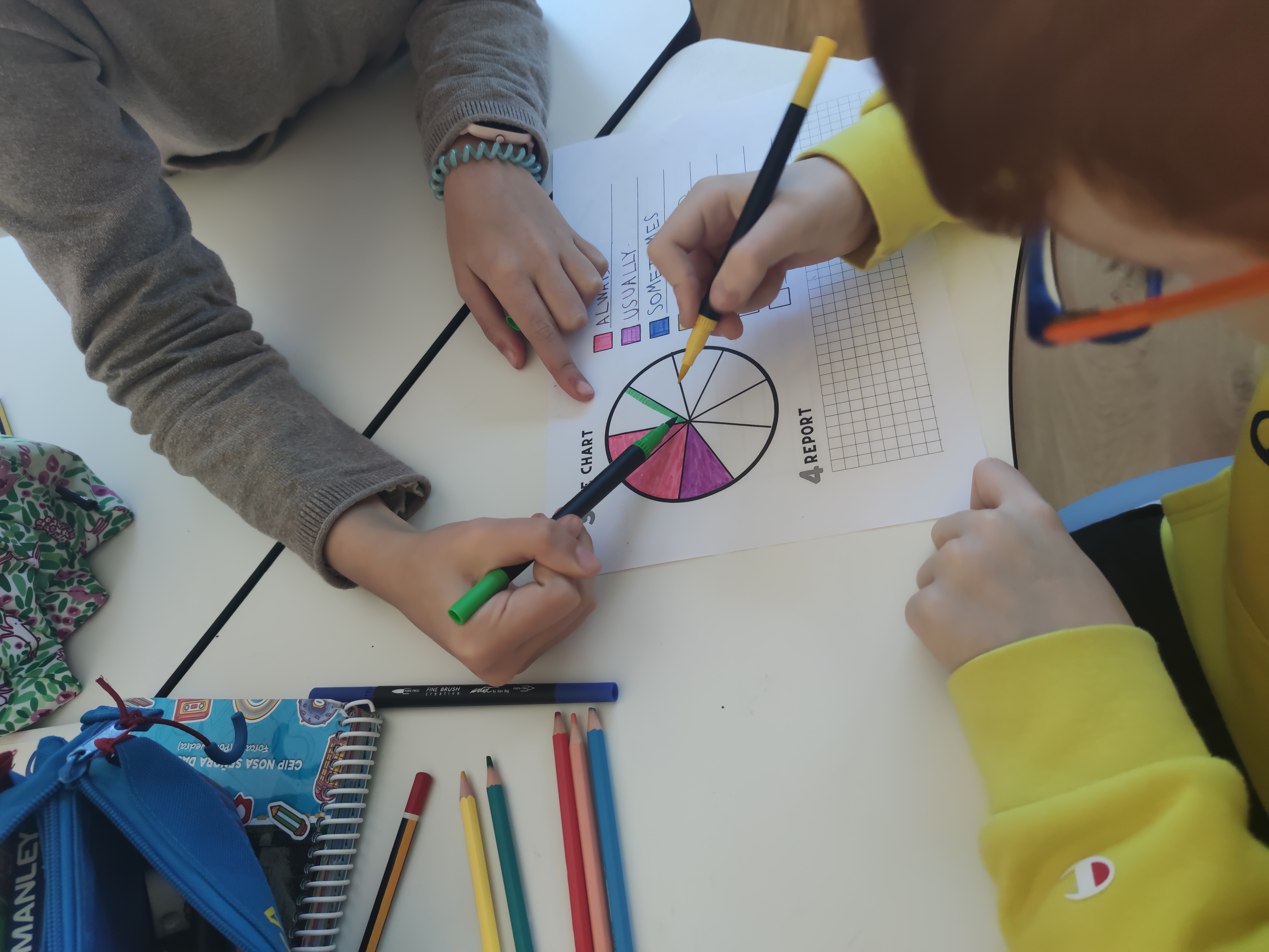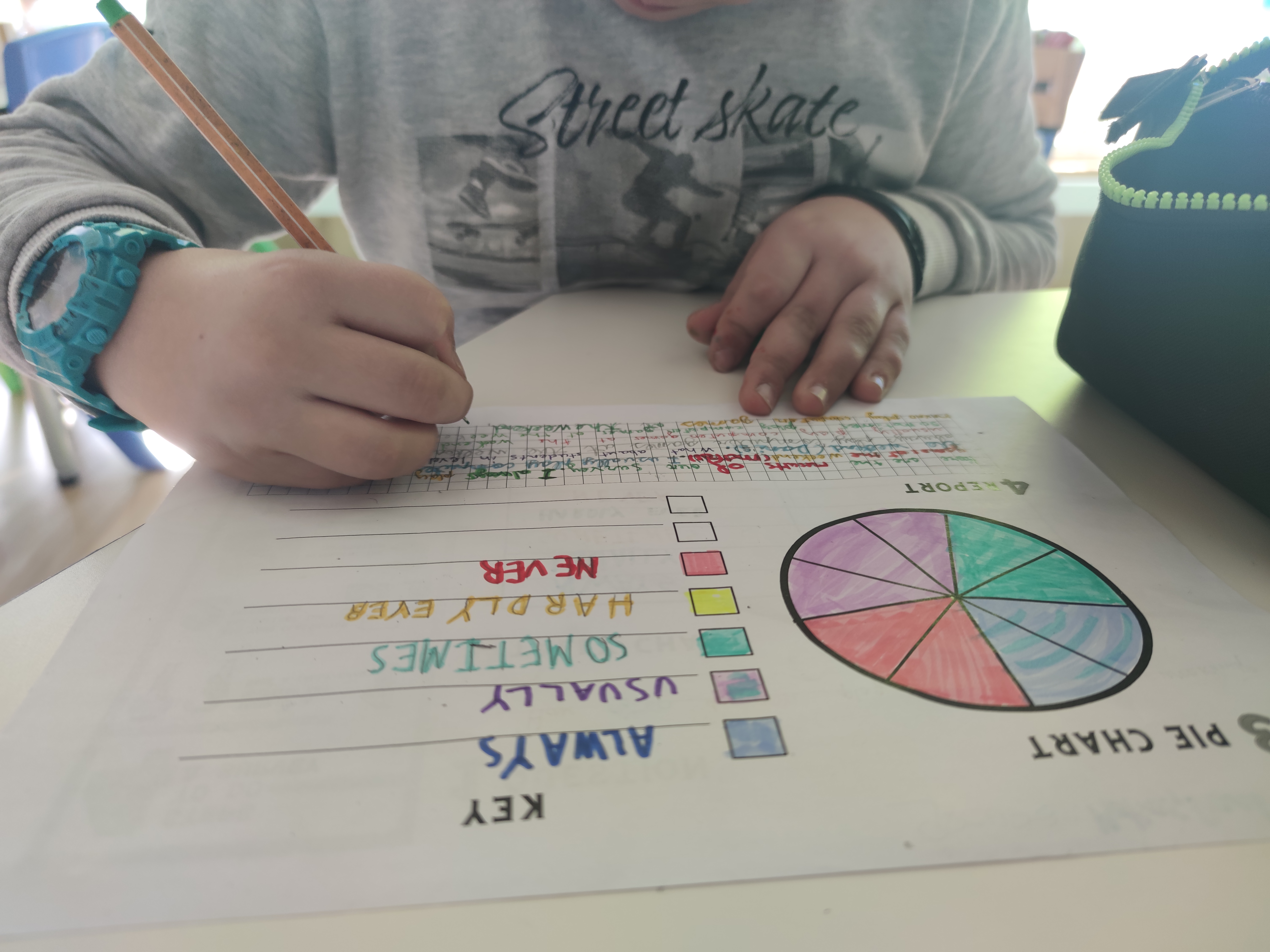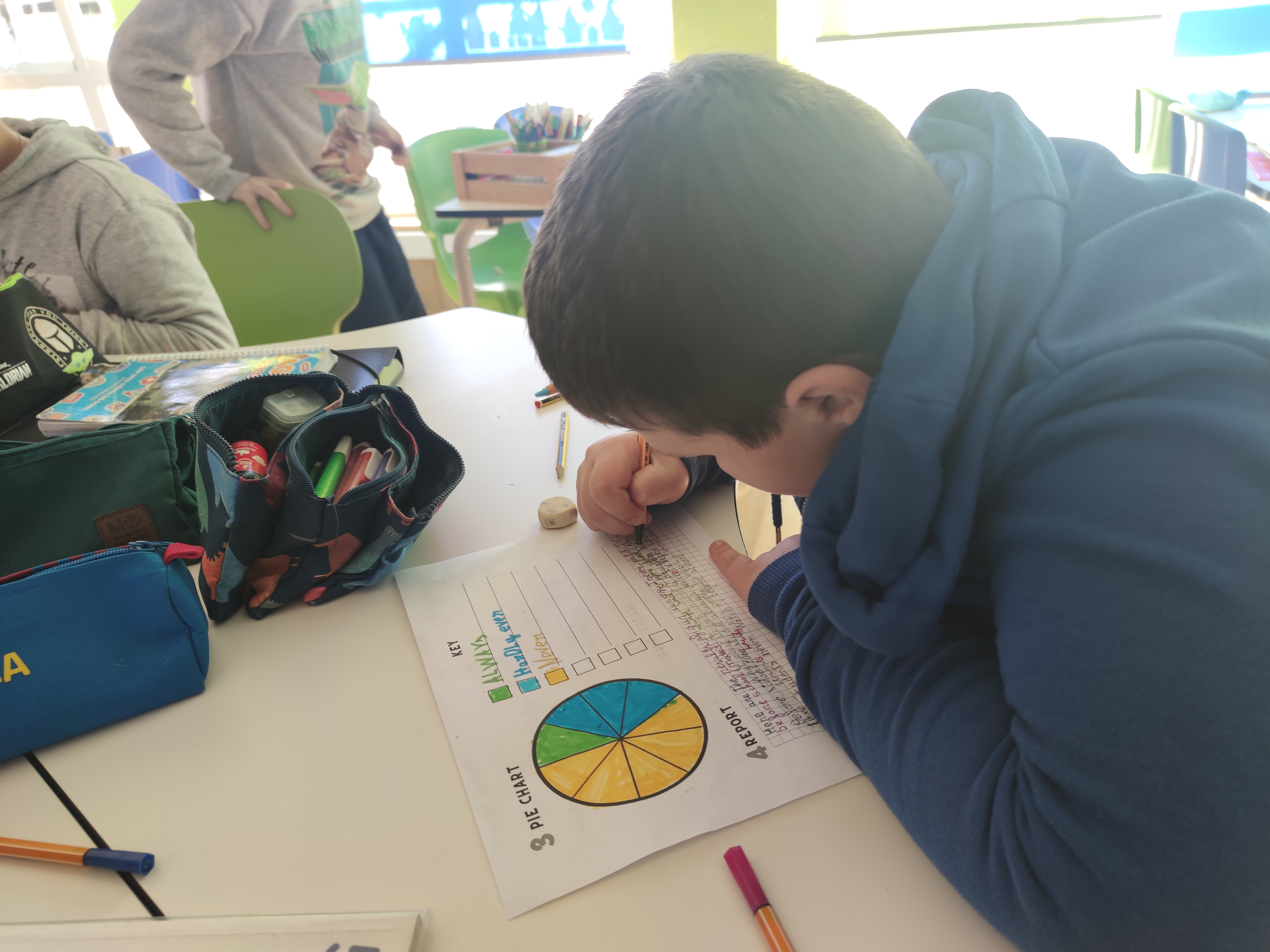 Students used a tally chart as a method to collect information they needed. Then, counting the tally marks , they had to represent the information using a pie chart or a bar graph as instruments to help us understand the information.
