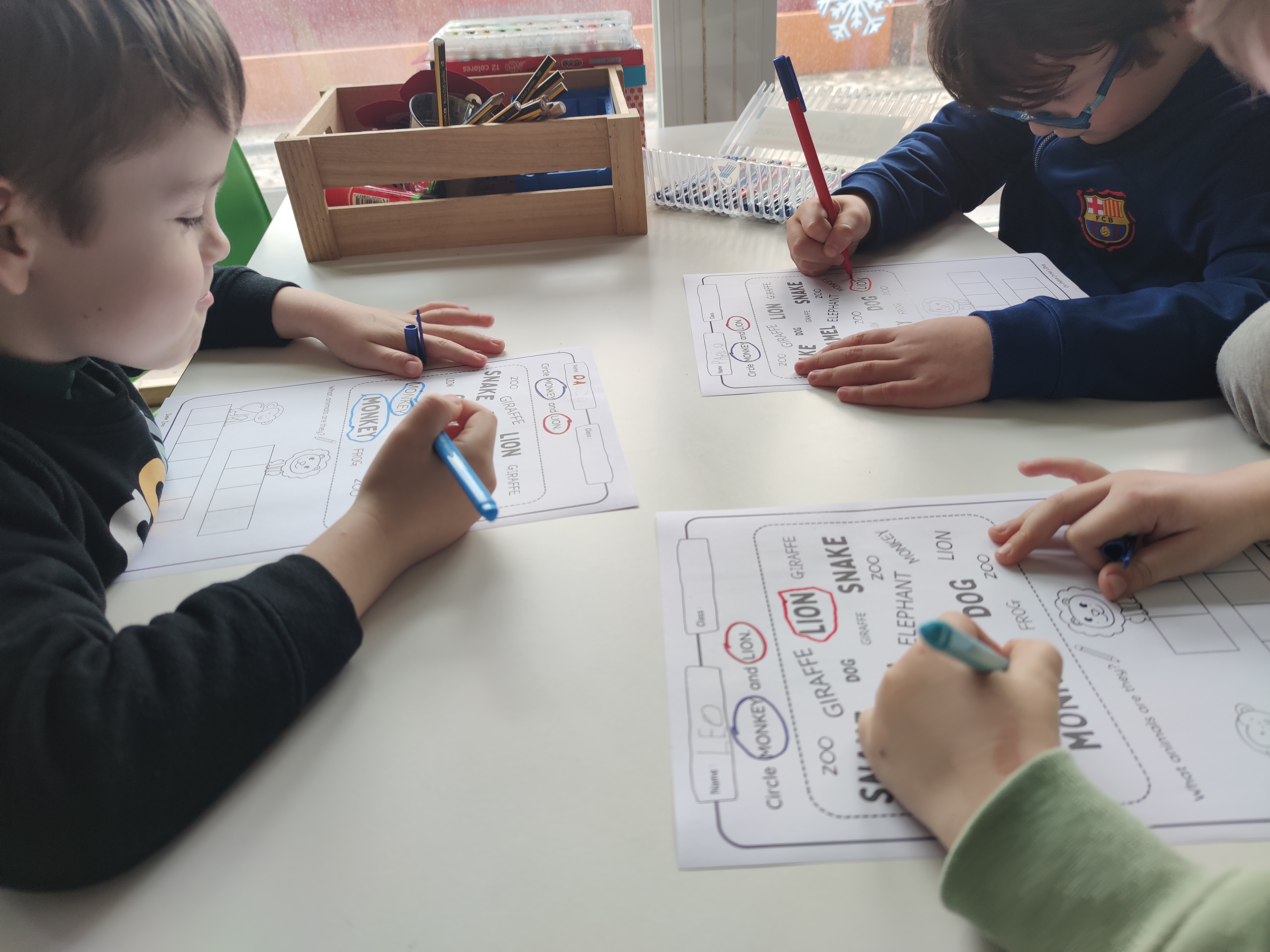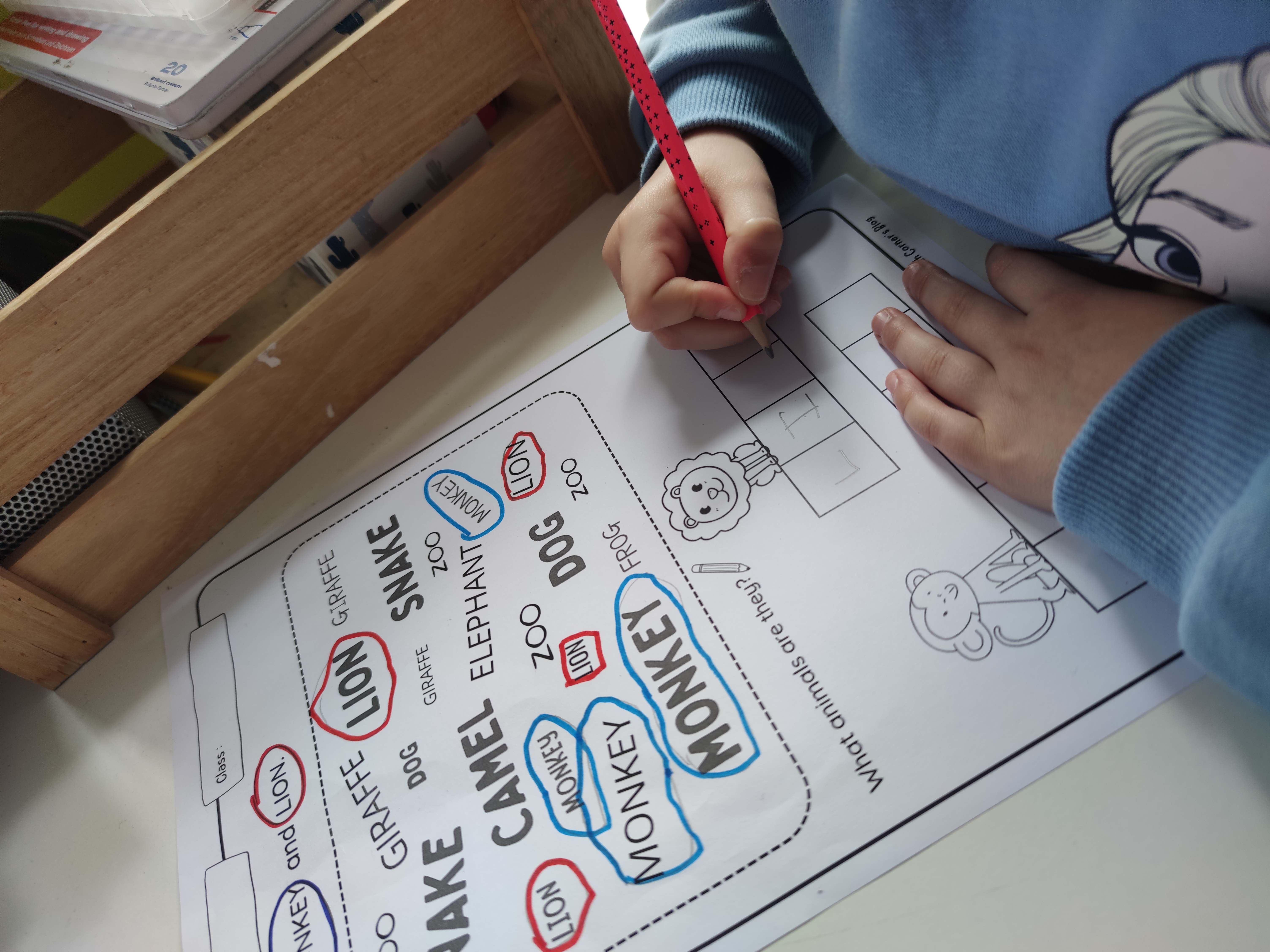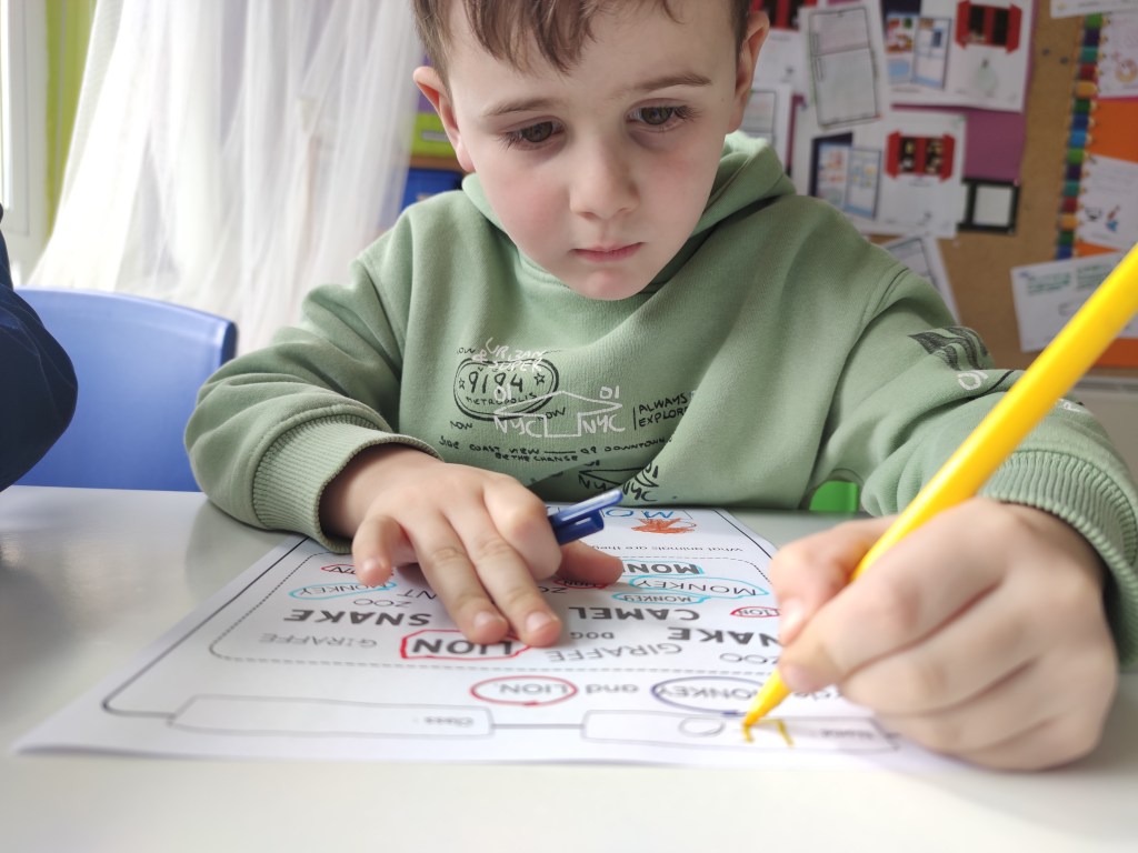Thirtly, because of the vocabulary that allows us to talk about. It provided not only the opportunity for learning animal words in a fun way, but practising colours and adjectives, comparing animals or making different conecctions. I read the book aloud, page by page and then I paused and asked children if they were able to name or point to something that was big or heavy or someone in the class who was tall or grumpy.