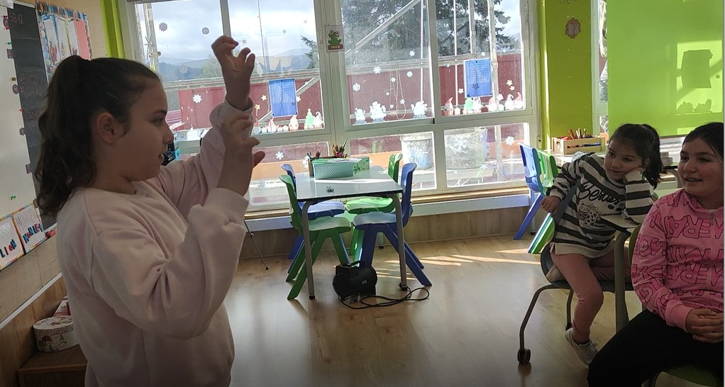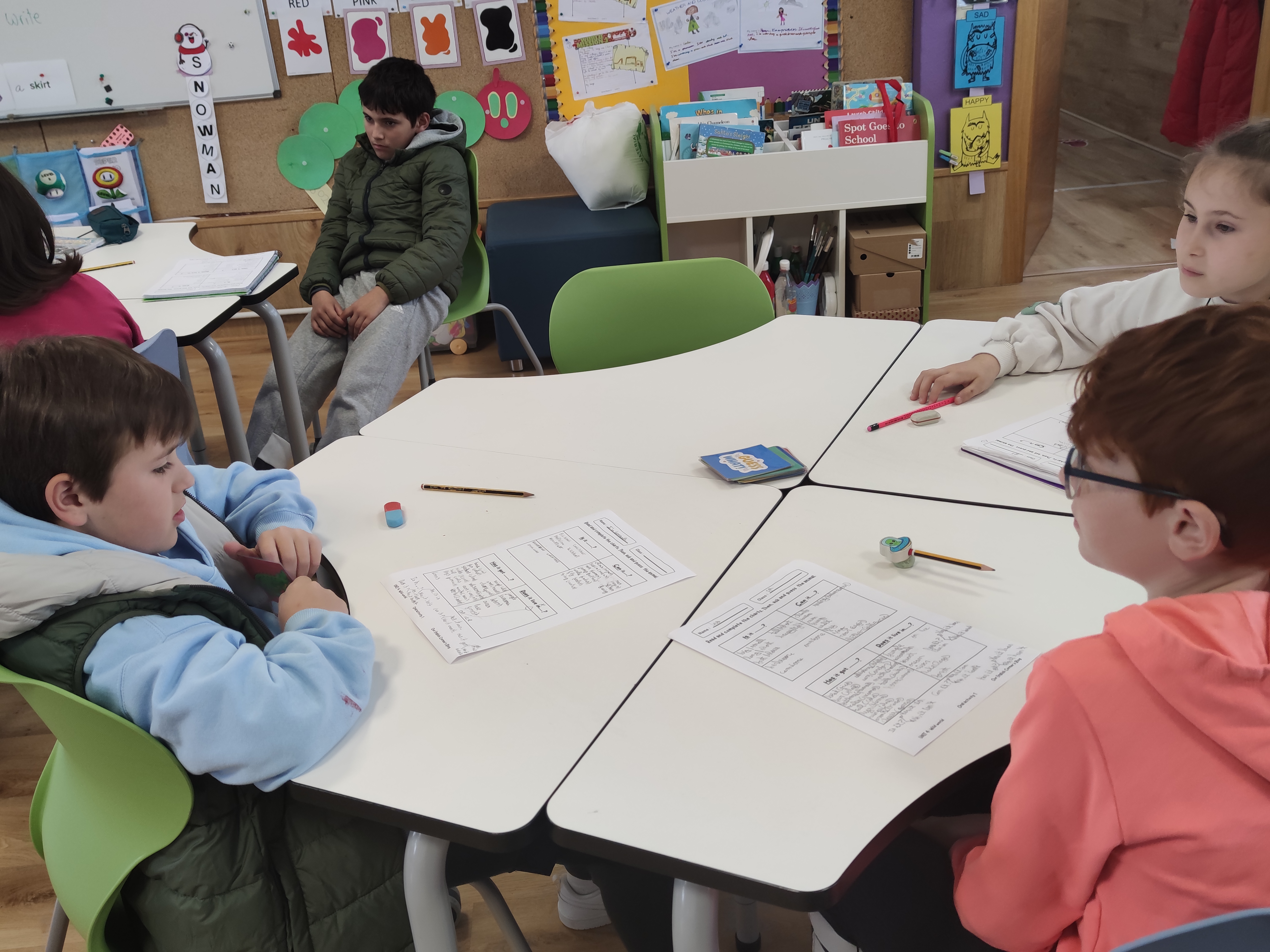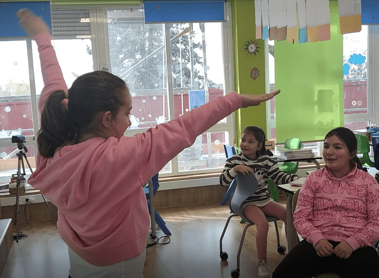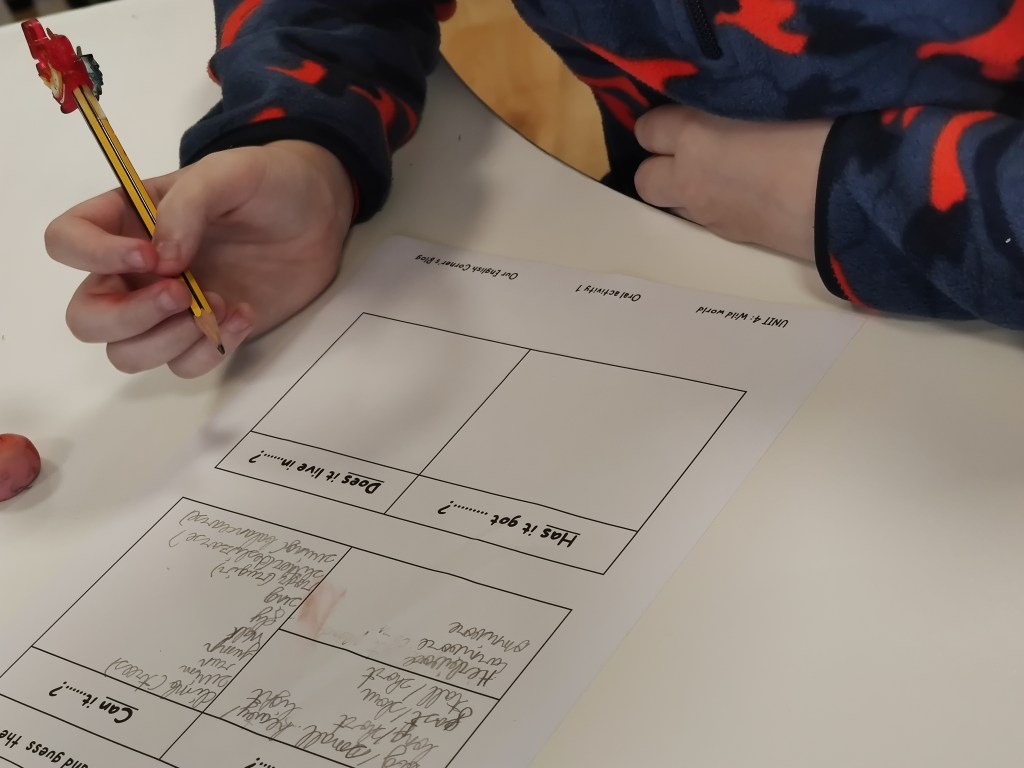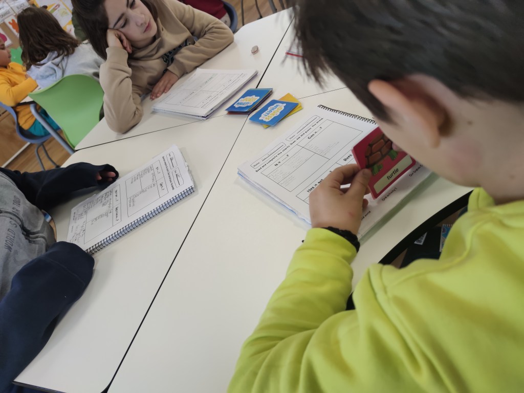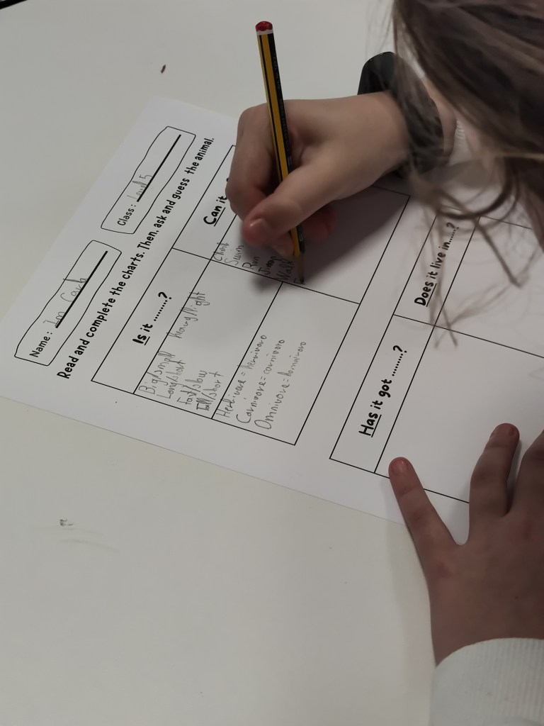 Na primeira sesión, comezamos xogando en gran grupo. En primeiro lugar, revisamos o vocabulario relacionado coas habilidades a través dun xogo de TPR en 3º e cunha choiva de ideas en 5º para refrescar o vocabulario relacionado coas accións, adxectivos, hábitats e partes do corpo.