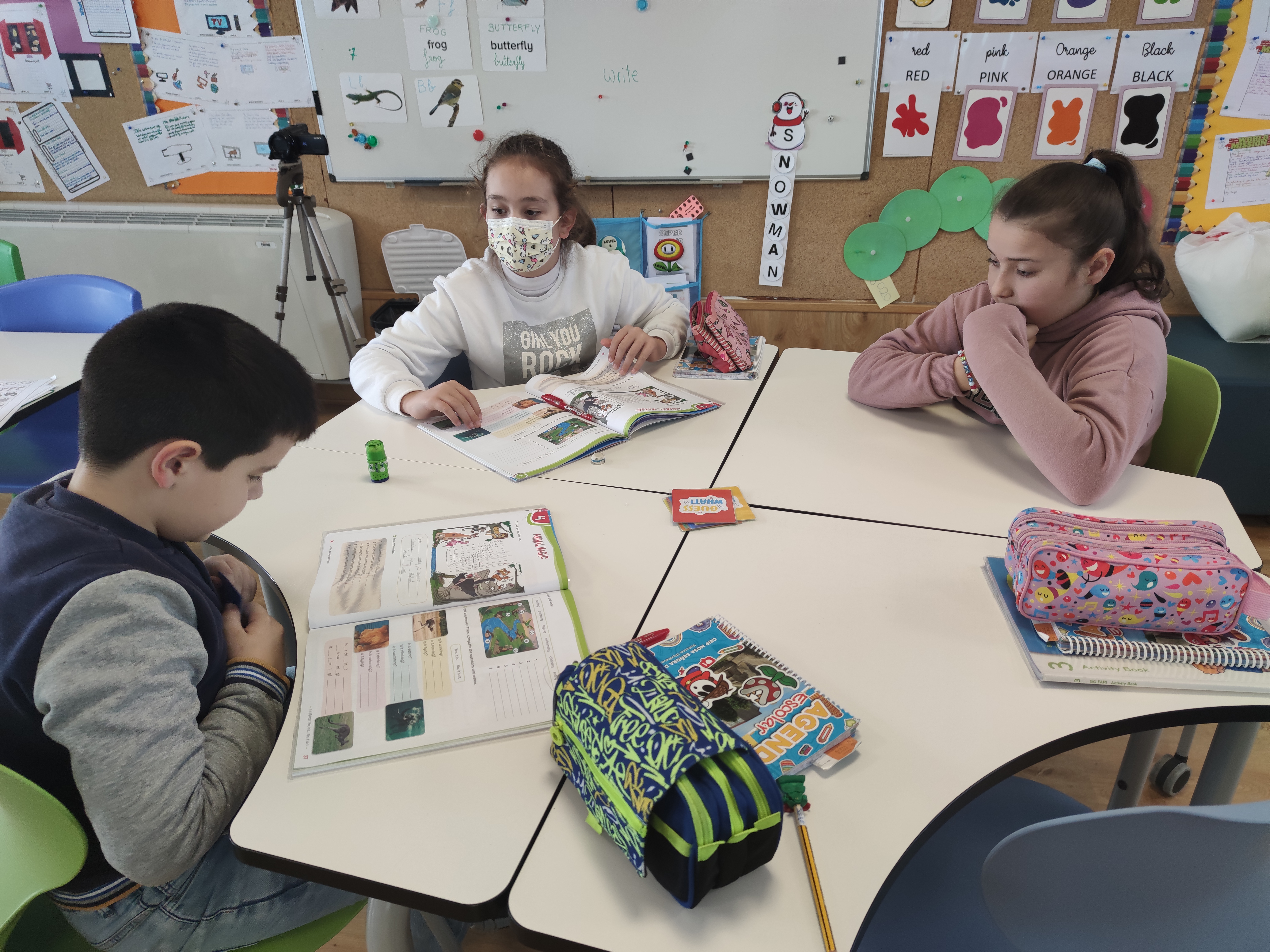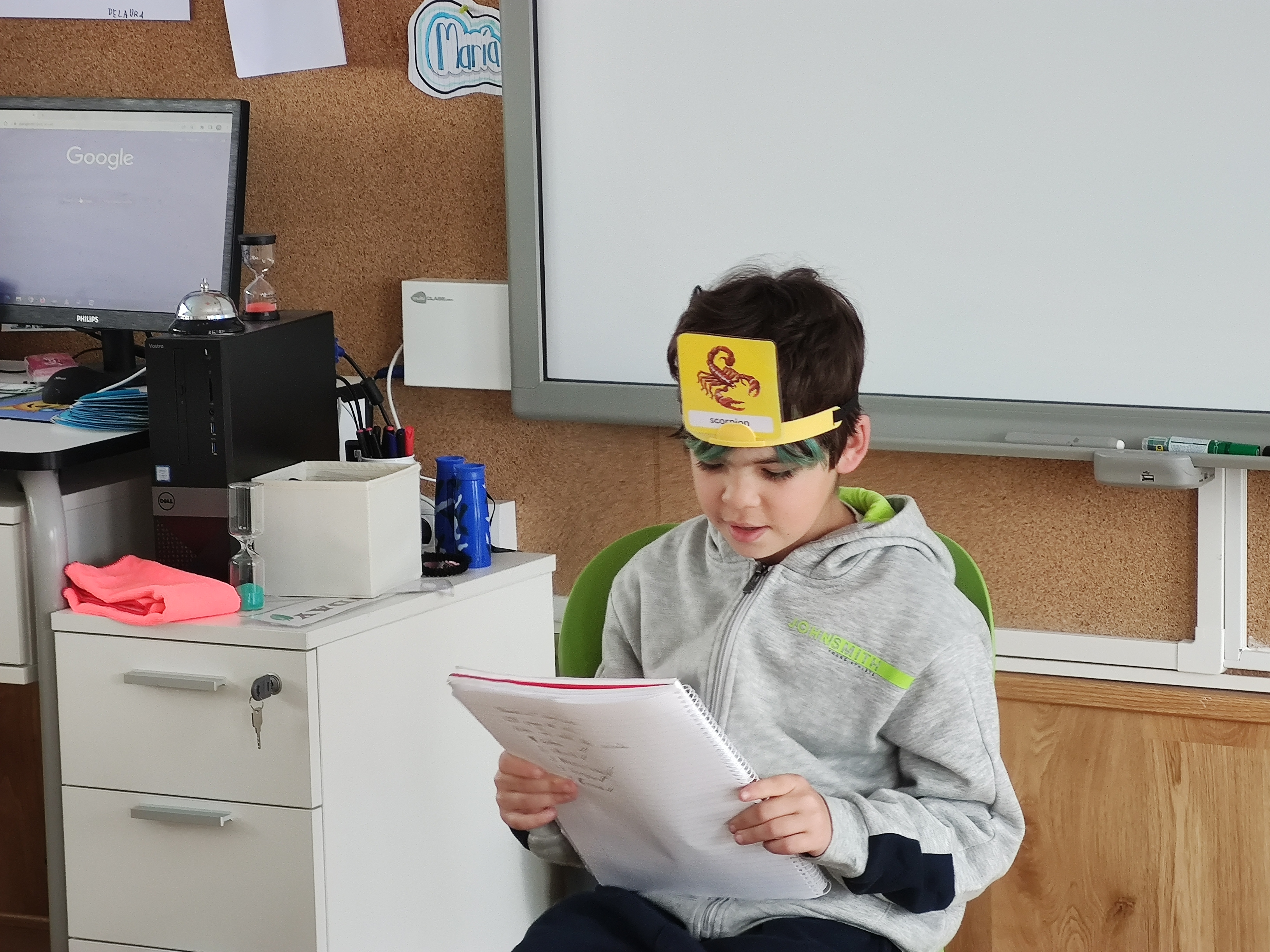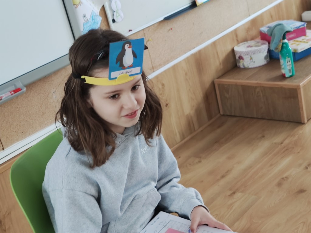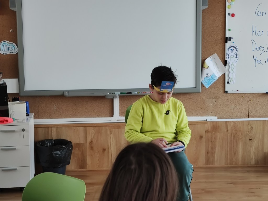 Then, in turns, a player put a color headband on the head. Then, one in the class had to close the eyes and selecte a card from the pile, and give it to the player, who helped to fix the card in the headband. The player had to guess the animal by asking the whole group.
