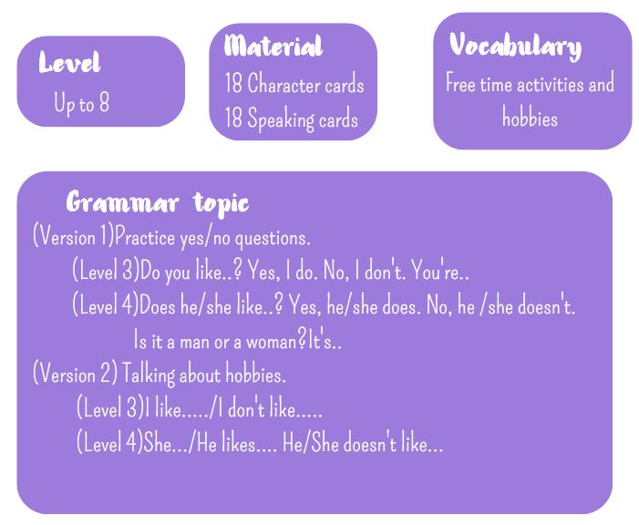 In version 2, kids listen to the description, then try to guess the right character. This game can be played in pairs, small teams or whole class.