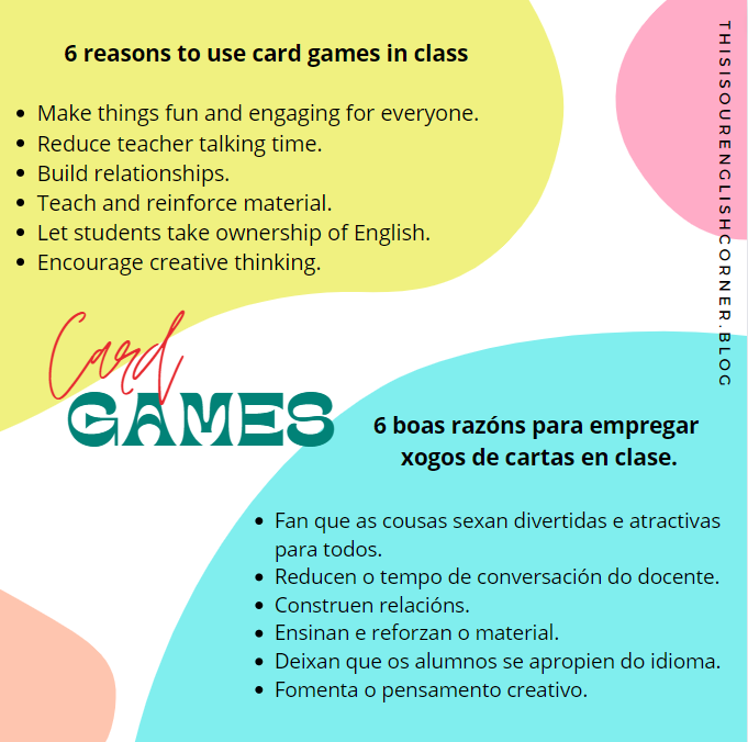 Aos rapaces encántalles xogar en clase. Os xogos de cartas son unha excelente maneira de facer que os estudantes falen e son incriblemente versátiles. Os xogos de cartas pódense xogar con practicamente calquera vocabulario, punto gramatical ou estrutura de oracións. Ter algunhas tarxetas de xogo a man tamén pode ser moi útil cando a lección non sae como estaba planeada.
