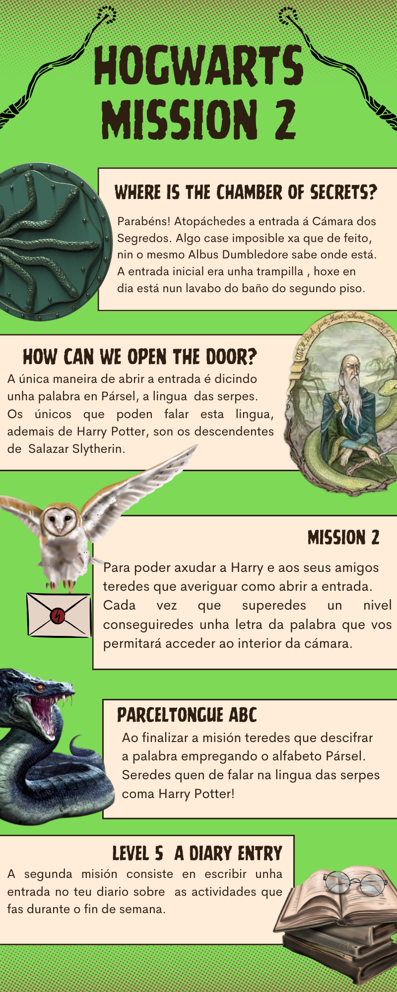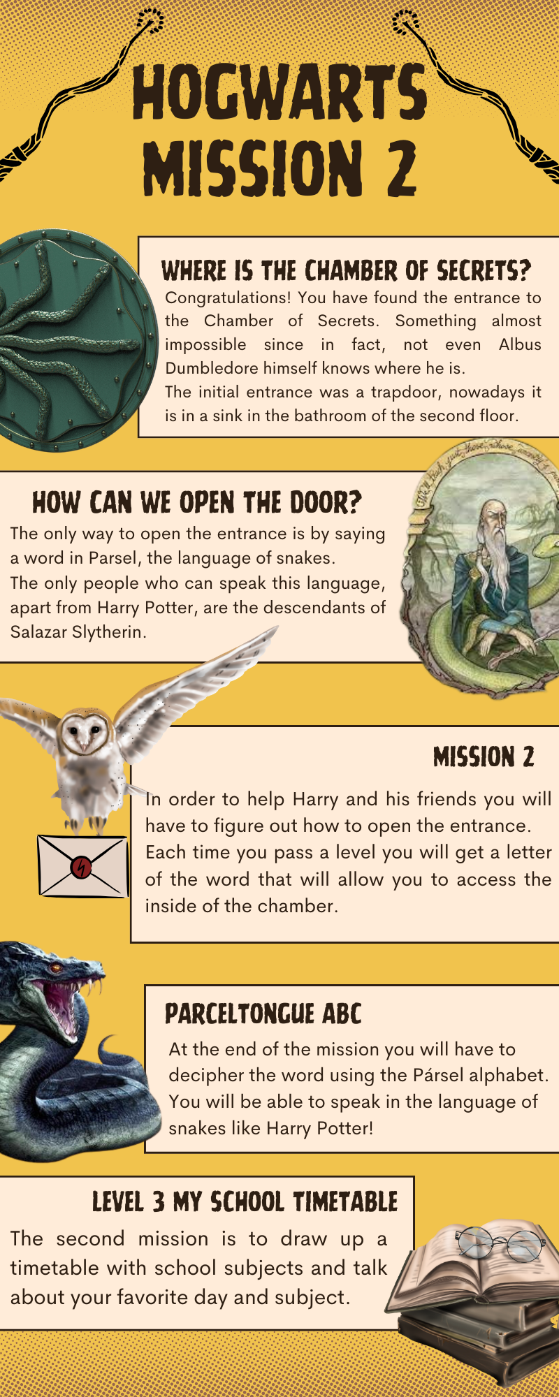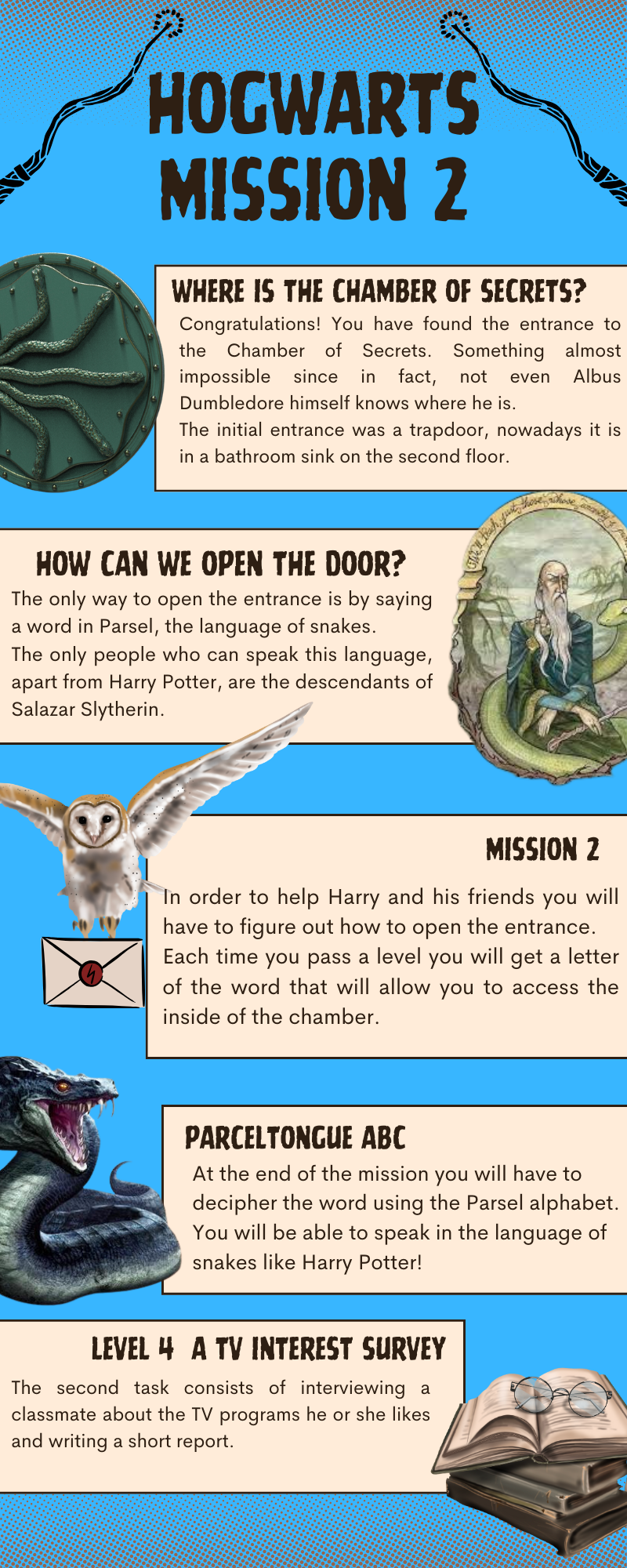 Congratulations! You have found the entrance os the Chamber of Secrets, but now you will have to figure out how to open it. At the end of this mission you will be able to speak Parsel, the language of snakes as Harry Potter does.