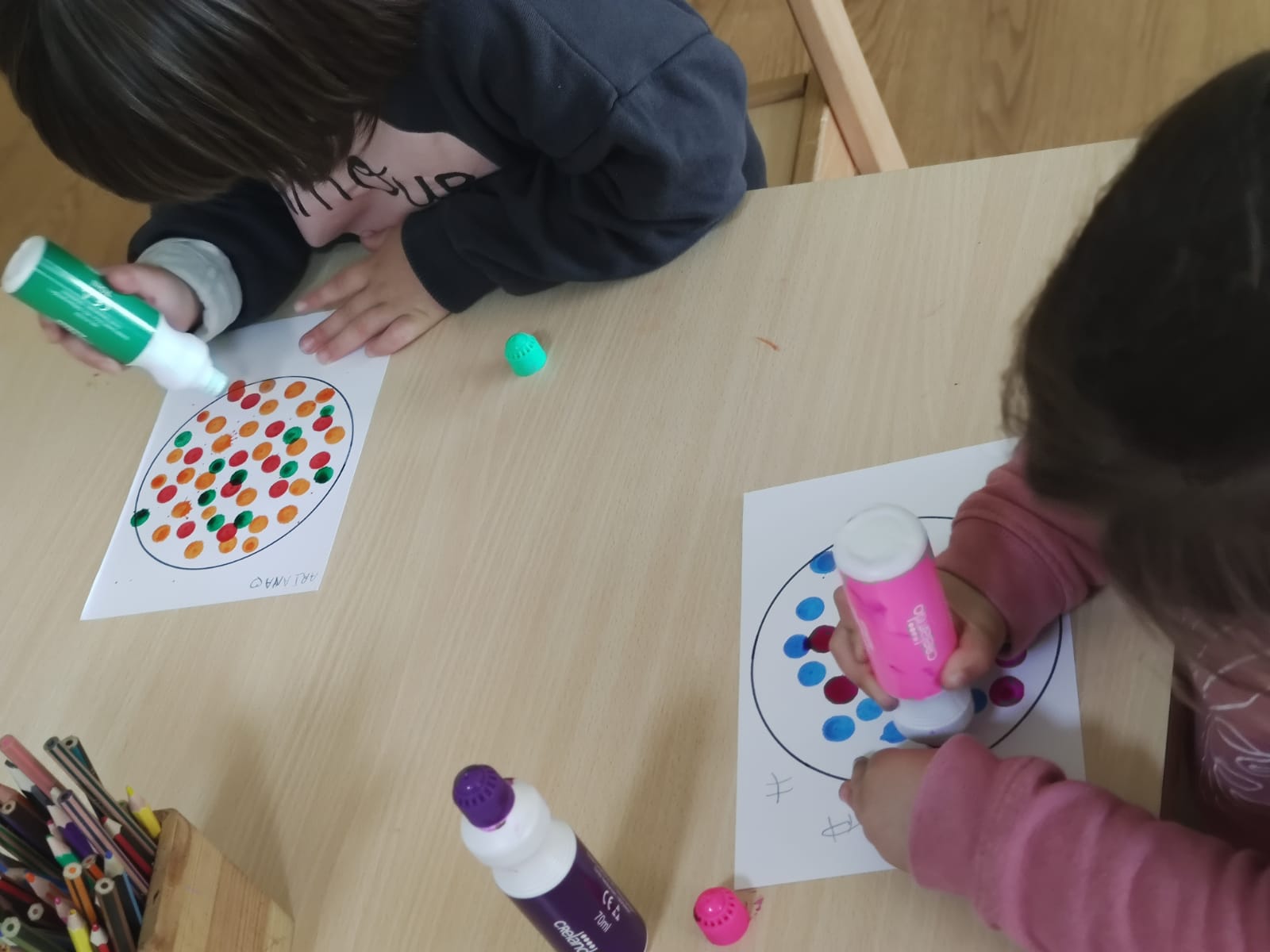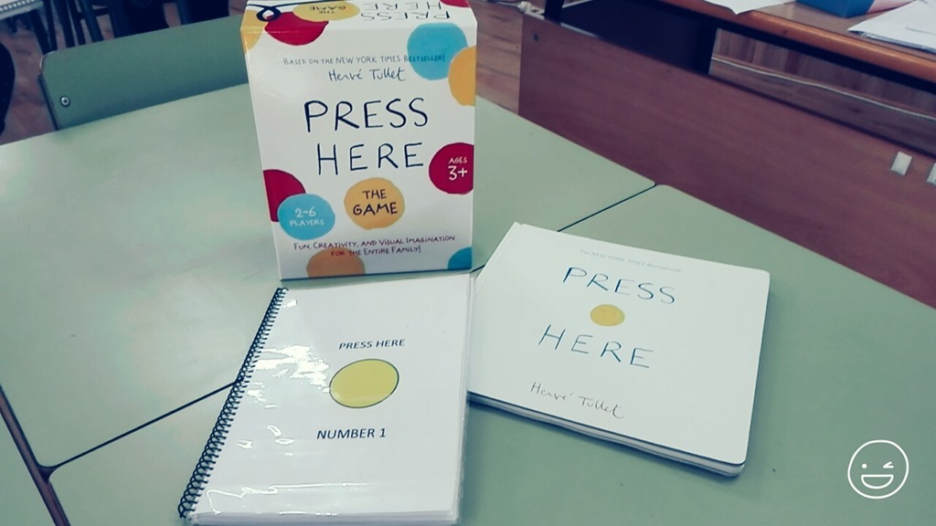 Despois de ler o libro e traballar coas nosas versións, xogamos a Press Here. Os nenos por turnos tiveron que completar secuencias de cores colocando pezas vermellas, azuis e amarelas nun dos vinte e cinco taboleiros de xogos fabulosamente deseñados.