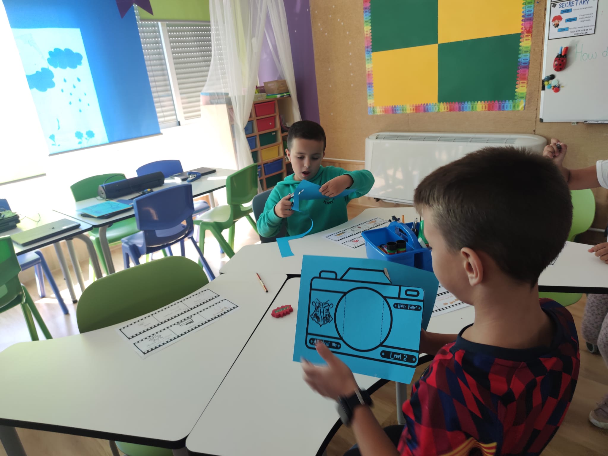 O proxecto central, All About Me, consistiu nunha manualidade na que cada estudante deseñou a súa propia “cámara fotográfica.” Dentro da cámara, os nenos crearon un “carrete fotográfico” que se desenrola e no cal engadiron diferentes datos persoais. En cada “fotograma” do carrete, os estudantes incluíron información como o seu nome, idade, cor favorita, …….. Cada imaxe representaba un aspecto único da súa personalidade. Este formato creativo permitiulles aos estudantes presentarse de maneira visual e oral, practicando inglés e conectando cos seus compañeiros a través dos seus intereses e gustos.