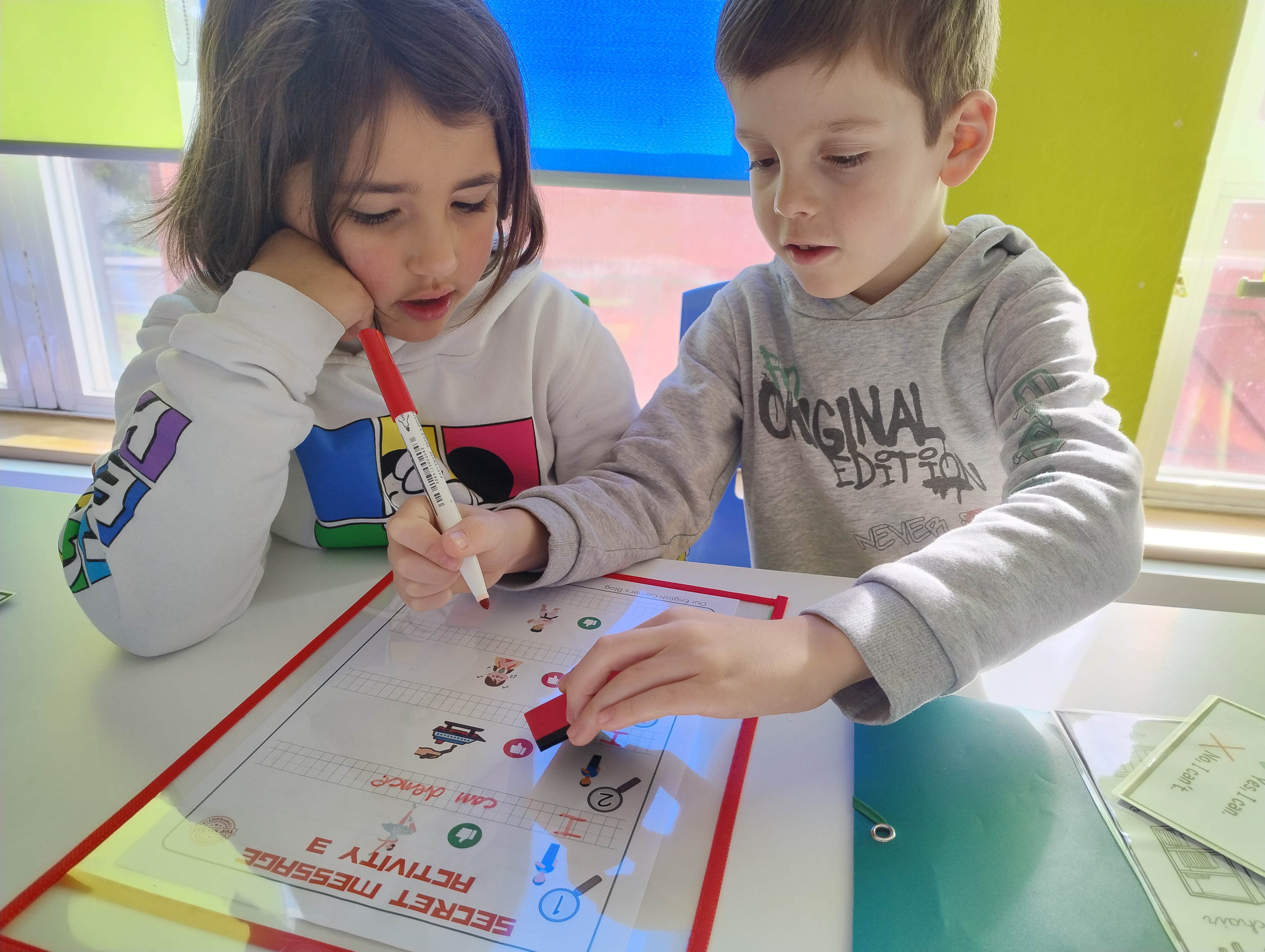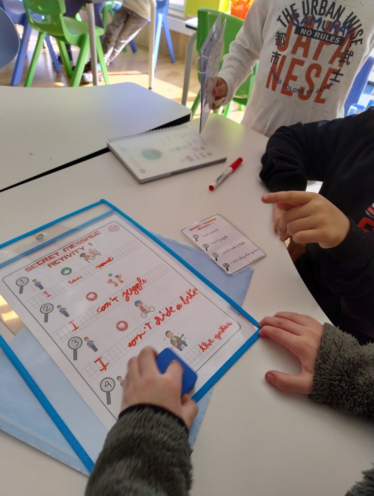 Traballamos en pequenos grupos para resolver un misterio. Cada grupo recibiu mensaxes secretos escritos cun código especial. As mensaxes dicían cousas como “I can swim” ou “I can’t play the guitar”.