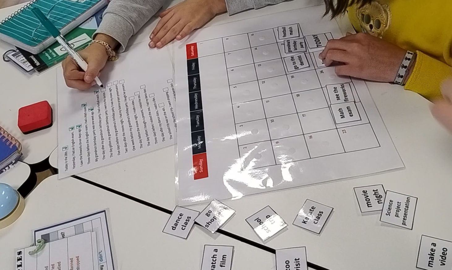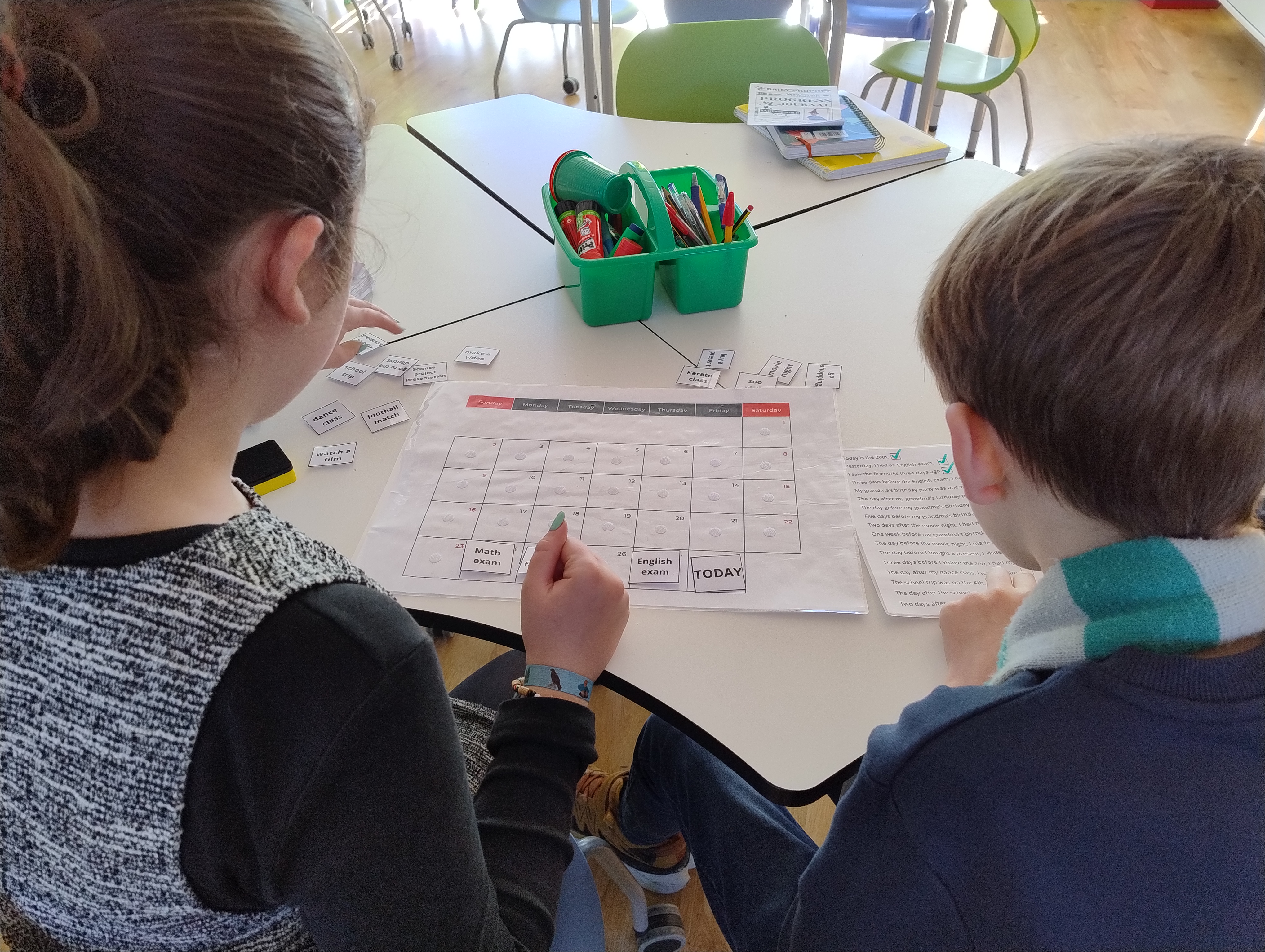 - Reading Instructions: Each group read the instruction sheet together. The clues were things like, “Yesterday, I had an English exam.” “I saw the fireworks three days ago.”