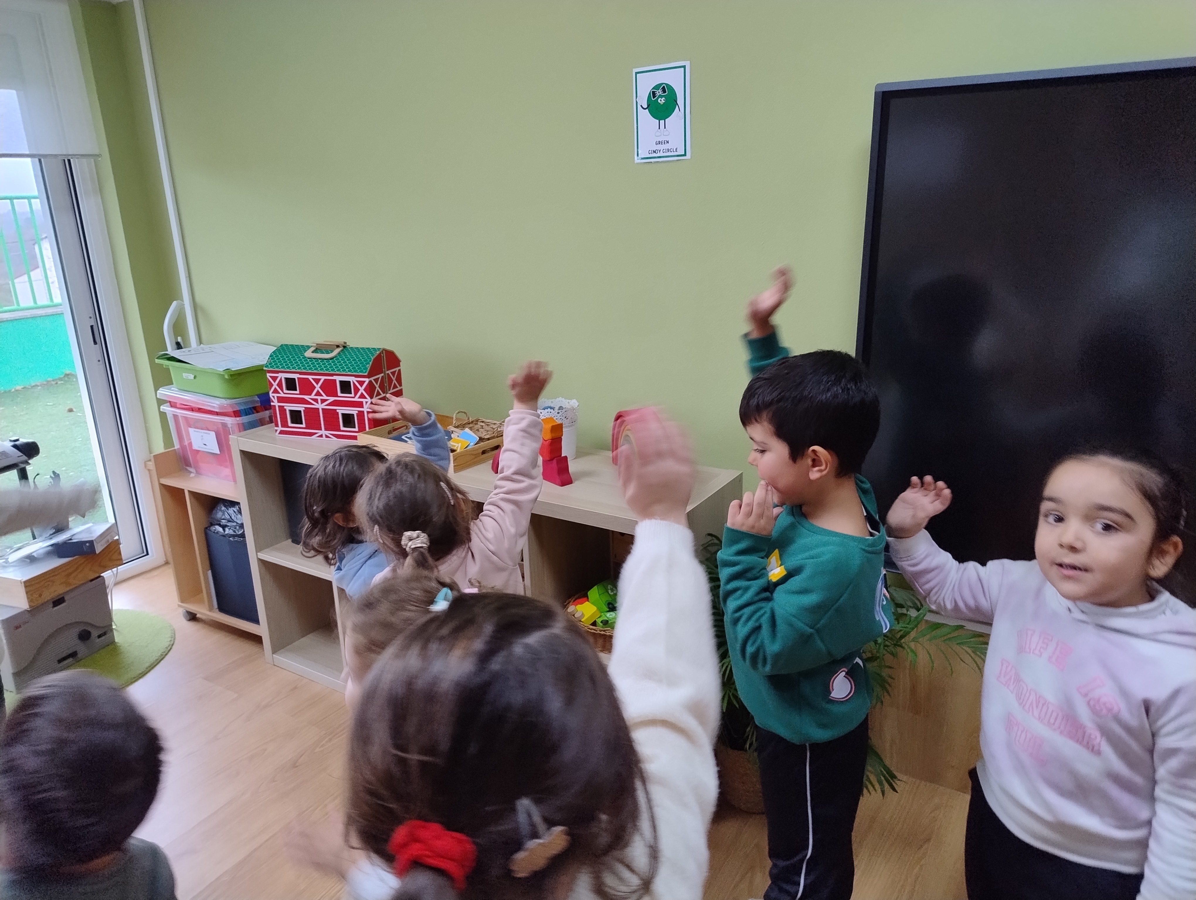 Cindy has friends of different colors! Using flashcards, we introduce colorful circles to the children. Simple instructions like “Find the red Cindy Circle” or “Point to the blue Cindy Circle” guide them to locate these shapes around the classroom. Each time, we recite Cindy’s rhyme before giving instructions, building memory and excitement.