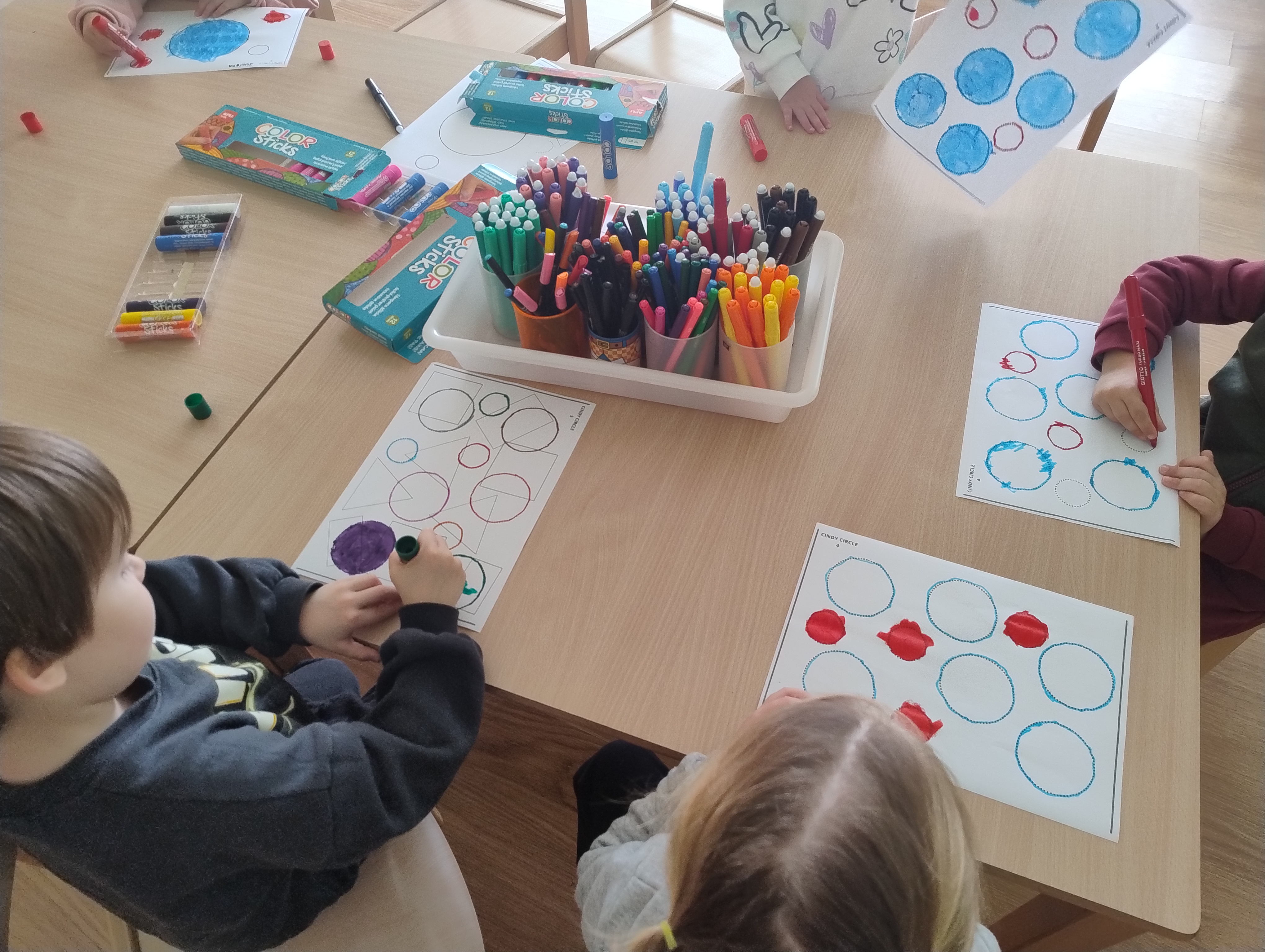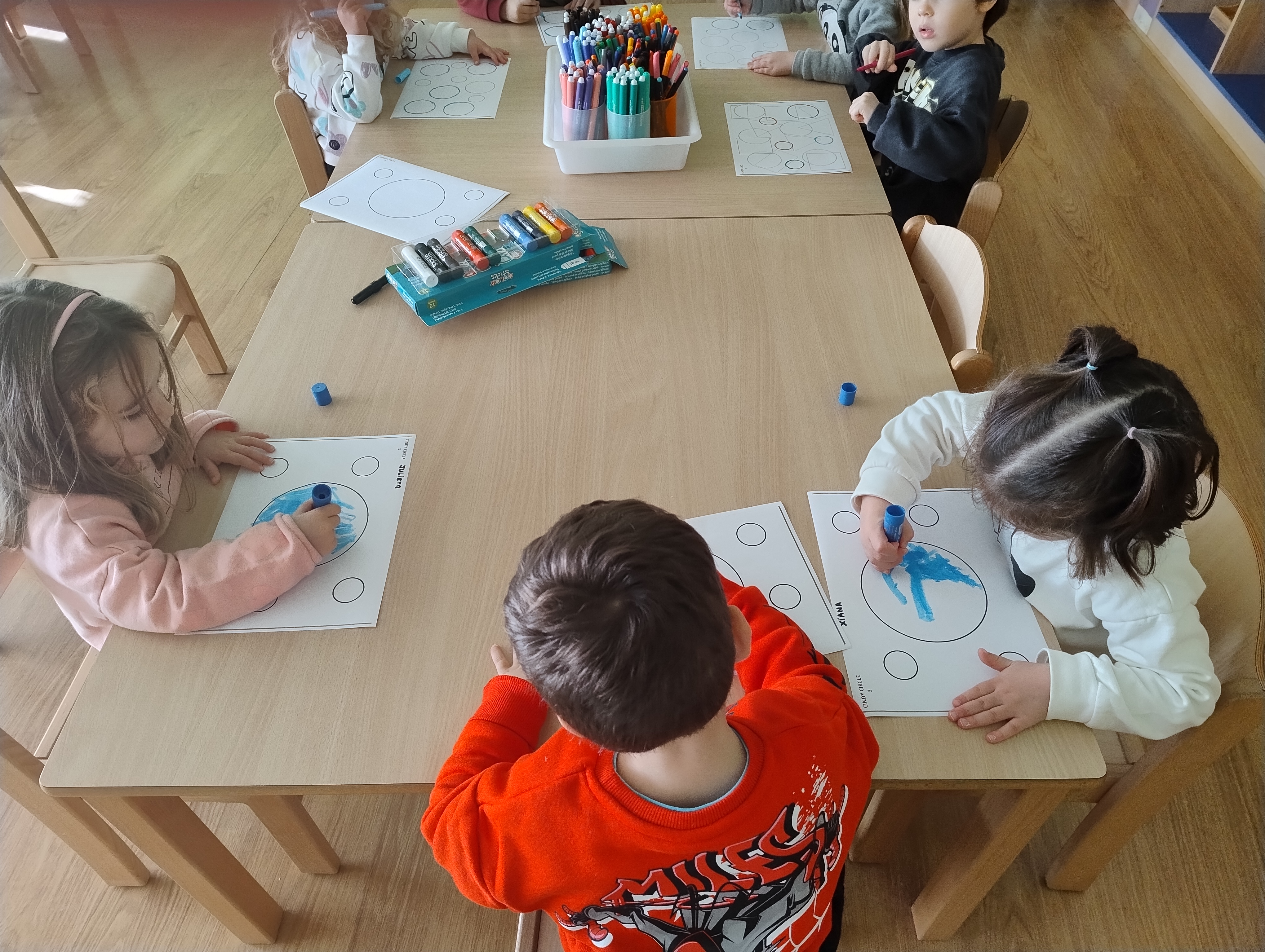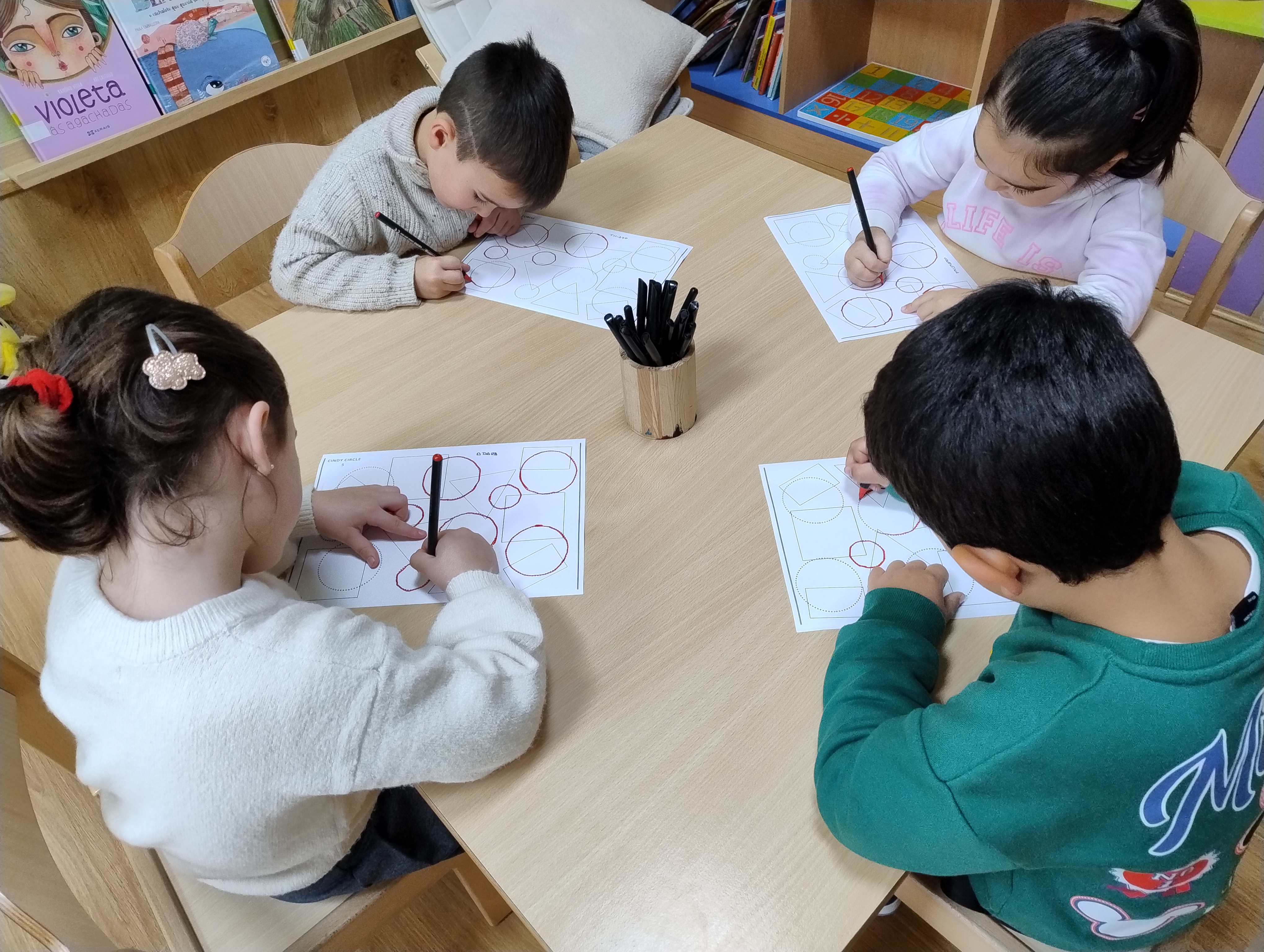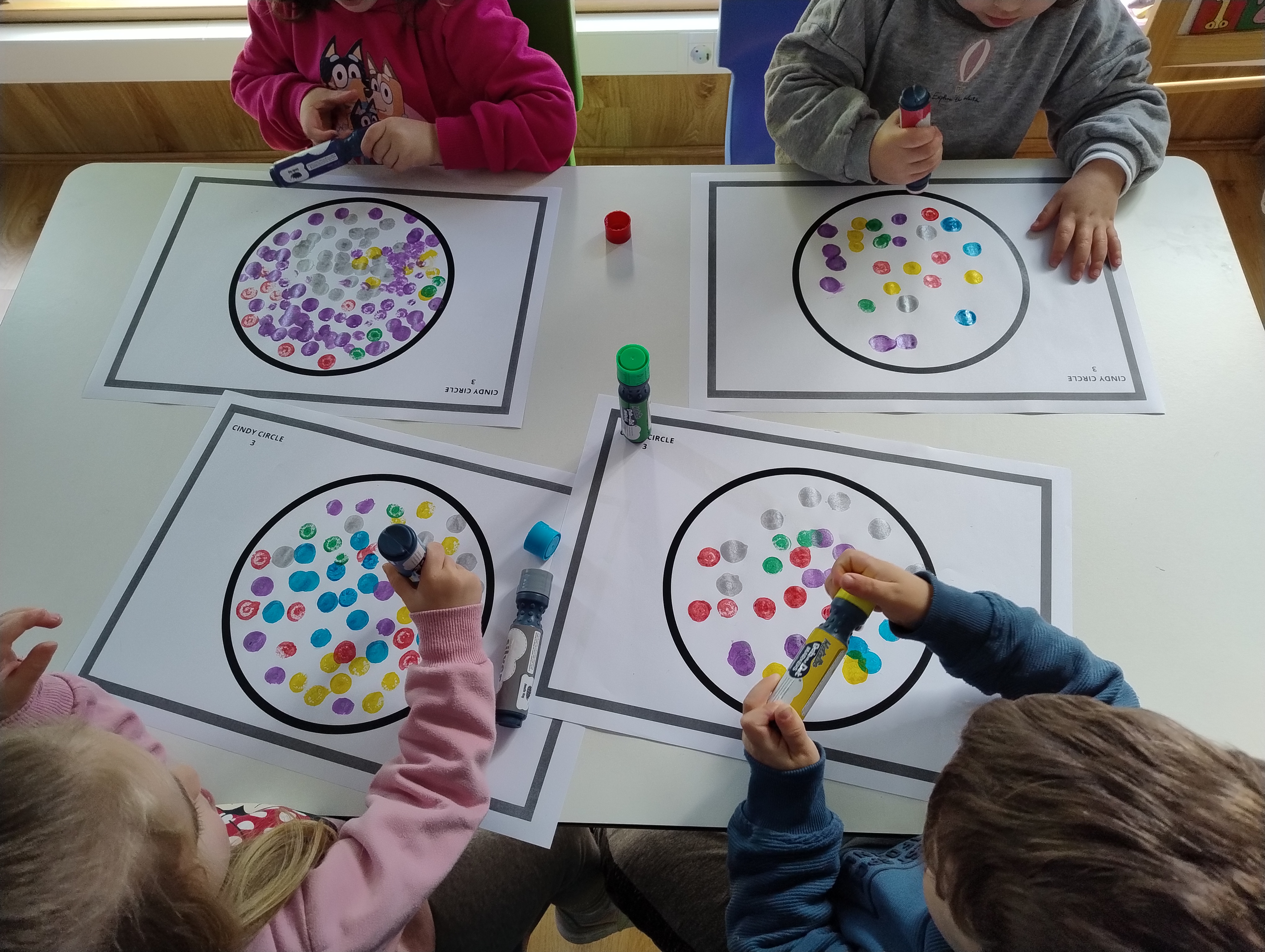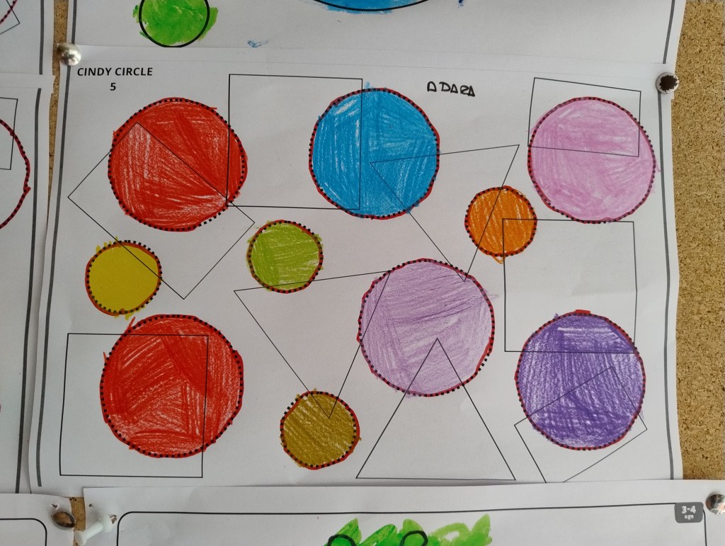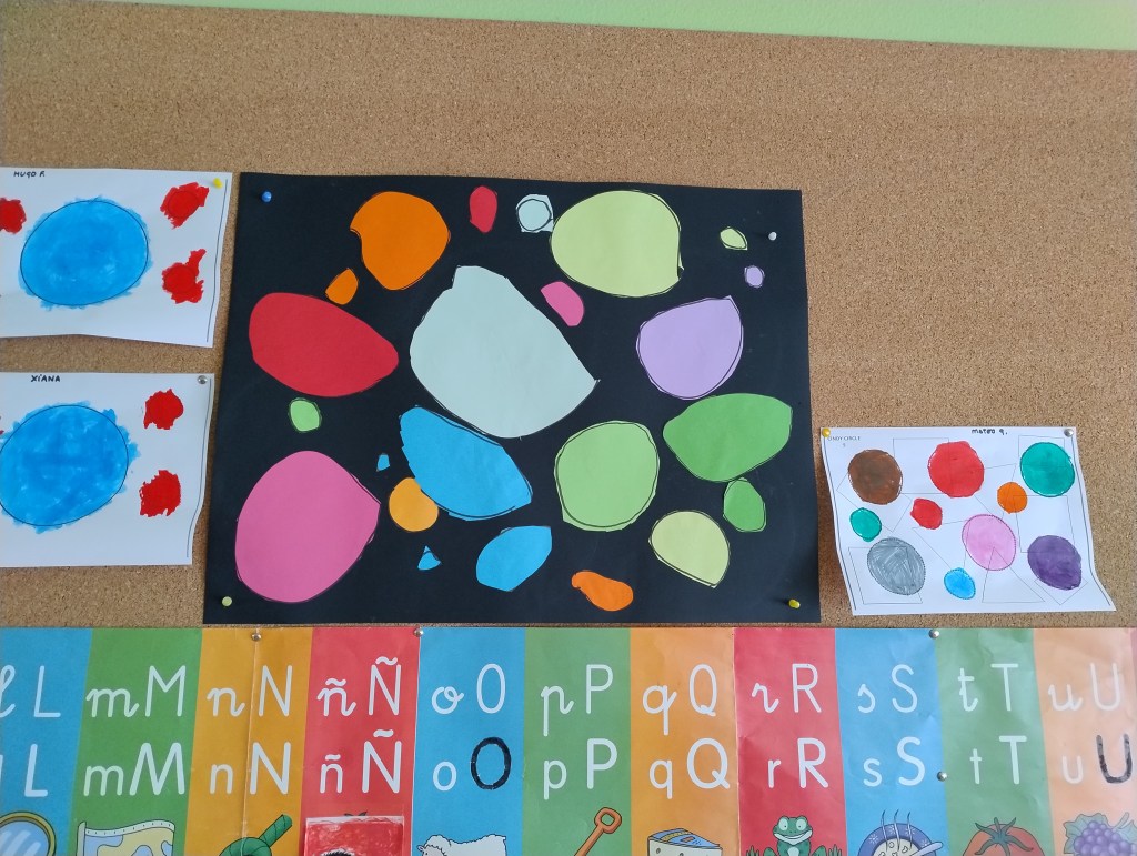 - Creación de mural de círculos: Os nenos decoran un mural grande con círculos de varios tamaños e cores. Esta actividade colaborativa fomenta a creatividade e o traballo en equipo.