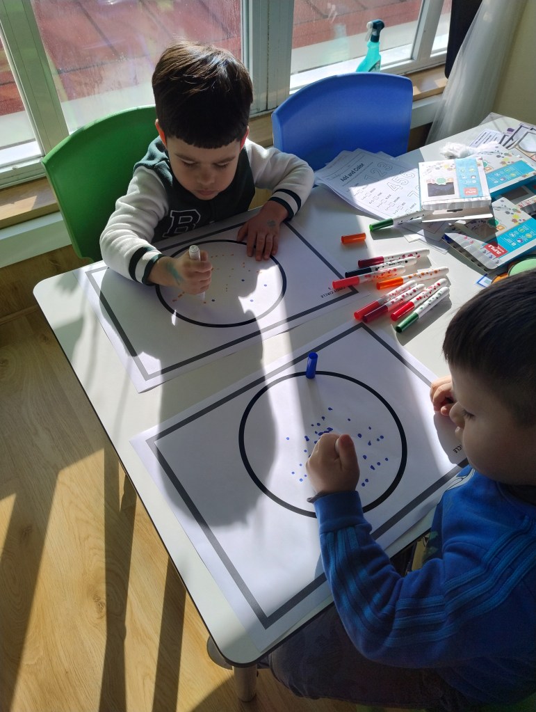 - 3-year-olds: Use stamps to fill circles, focusing on the concept of “inside”.