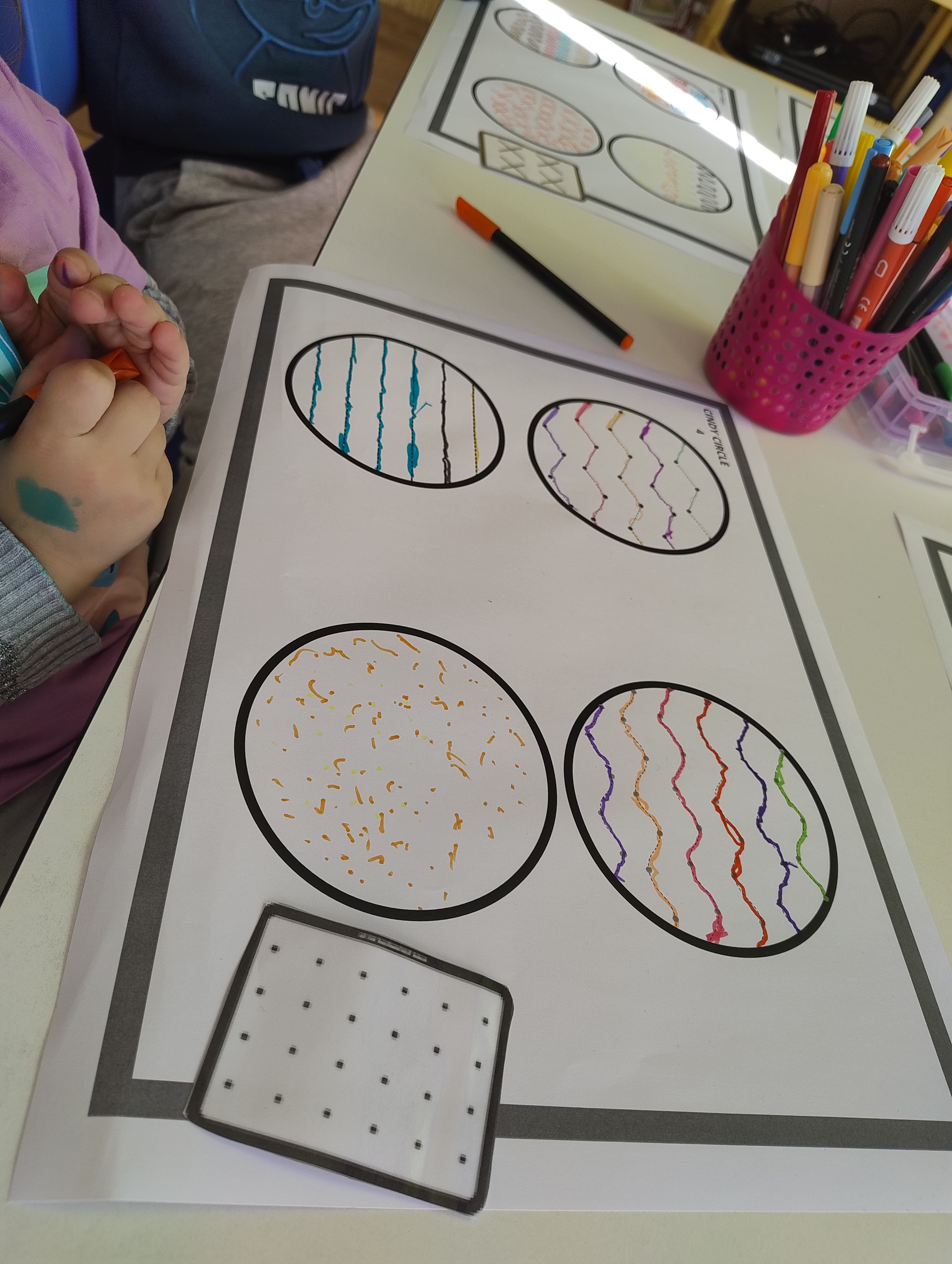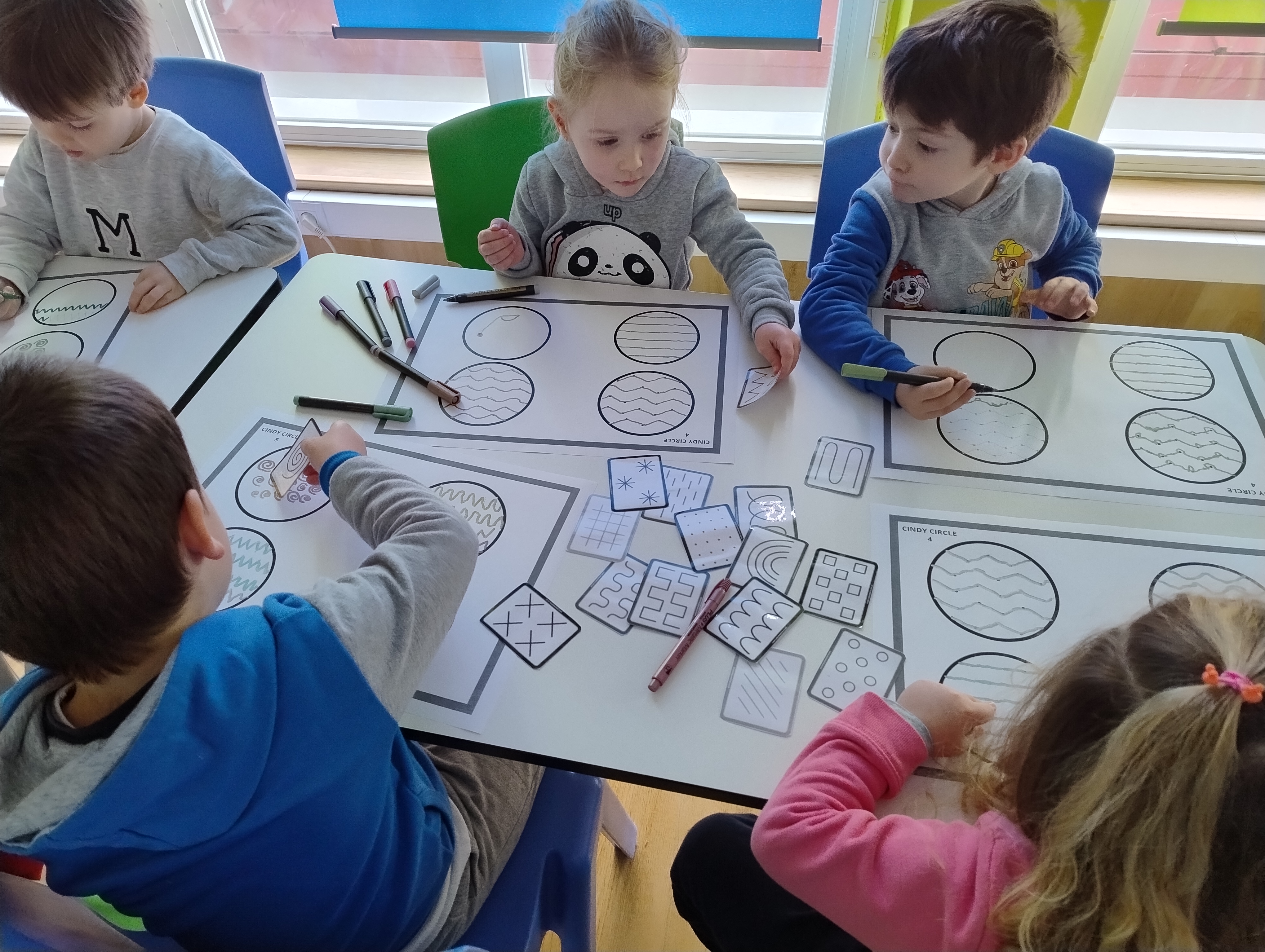 - 5 anos: Trazar e recrear patróns a partir de carteis de exemplo. Os nenos maiores tamén teñen liberdade para crear os seus propios deseños.