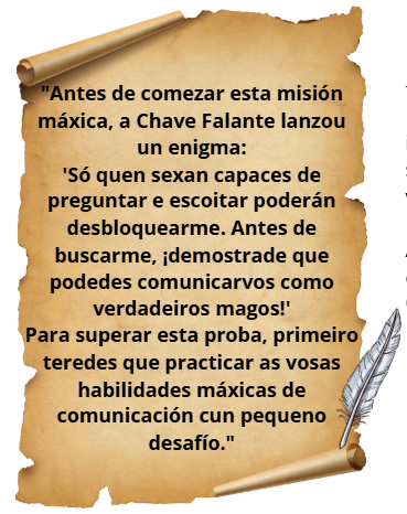 “¡Noraboa, aprendices de magos! Demostraste que es capaces de facer preguntas e organizar o que aprendiches. Agora estades listos para enfrentar o desafío real: axudar a desbloquear a Chave Falante cunha entrevista completa. ¡Imos a por ela!”
