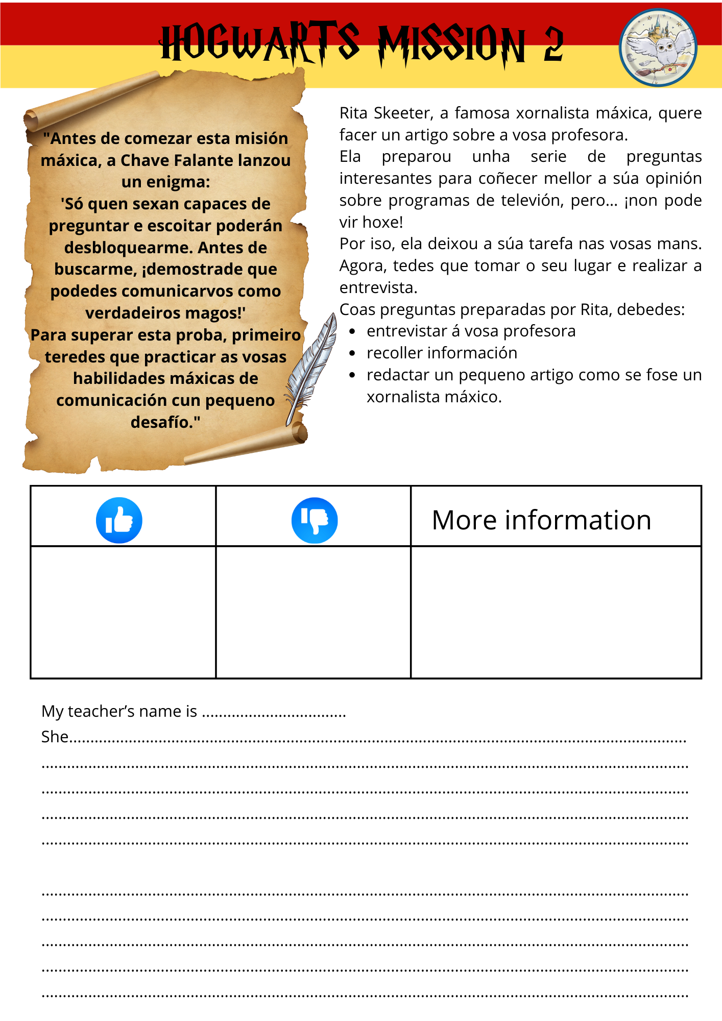 - Fai a pregunta ao teu mestre/mestra e anota a resposta no teu pergamiño máxico (unha folla de papel decorada, portfolio da misión ou un caderno).