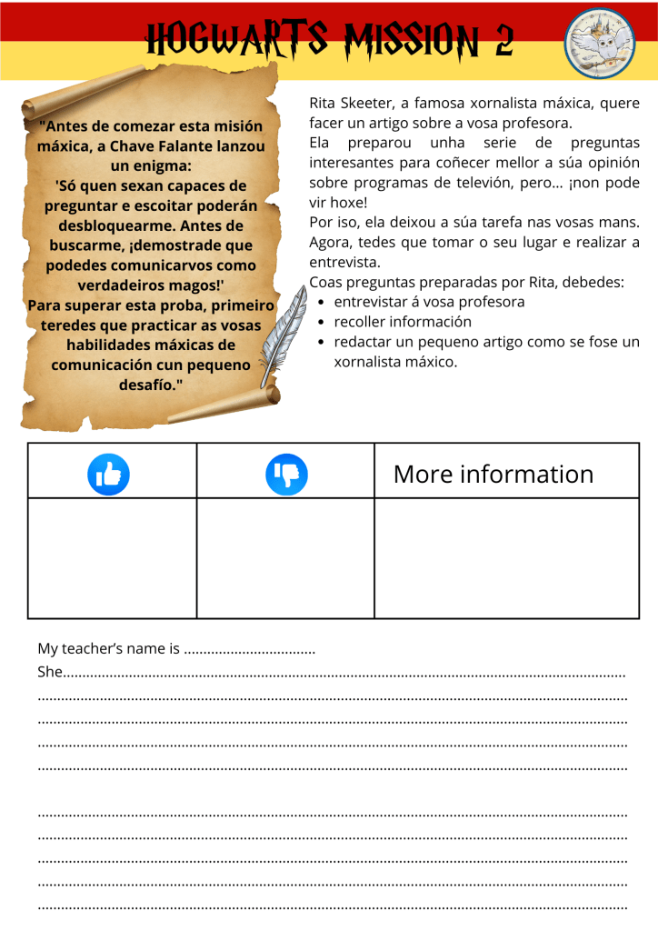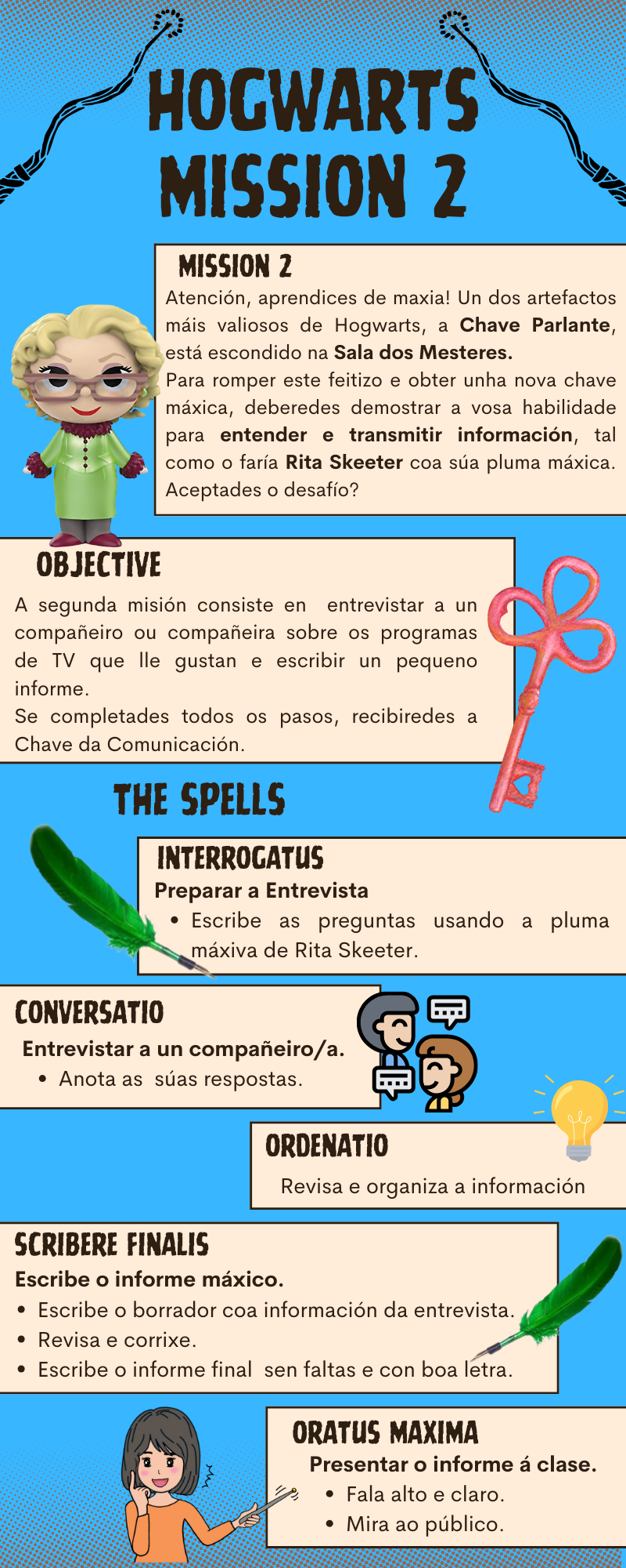 Antes de comezar a entrevistar aos nosos compañeiros, puxémonos na pel de Rita Skeeter, a famosa xornalista do Profeta Diario. Coa súa pluma máxica e a súa habilidade para descubrir segredos, inspirounos para convertirnos en reporteiros máxicos por un día.