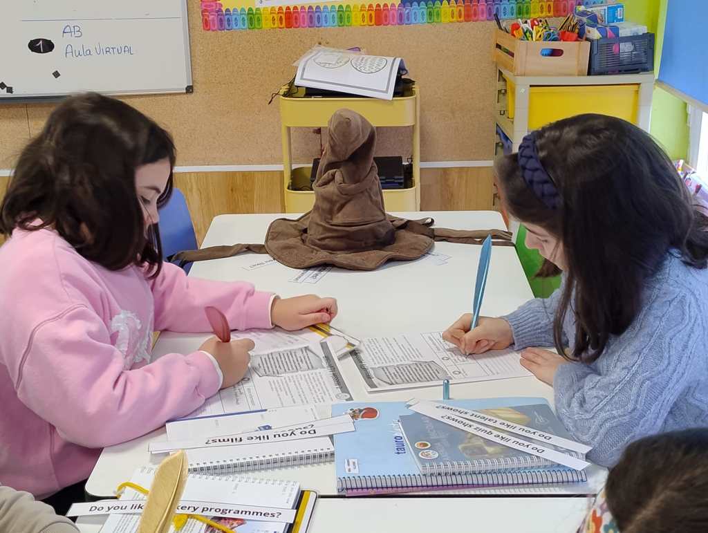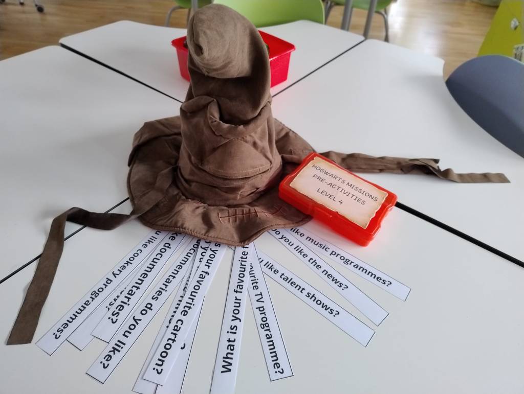 - Un sombrero (ou imaxe do Sombrero Seleccionador) e anacos de papel con preguntas sinxelos relacionadas cos gustos e preferencias.