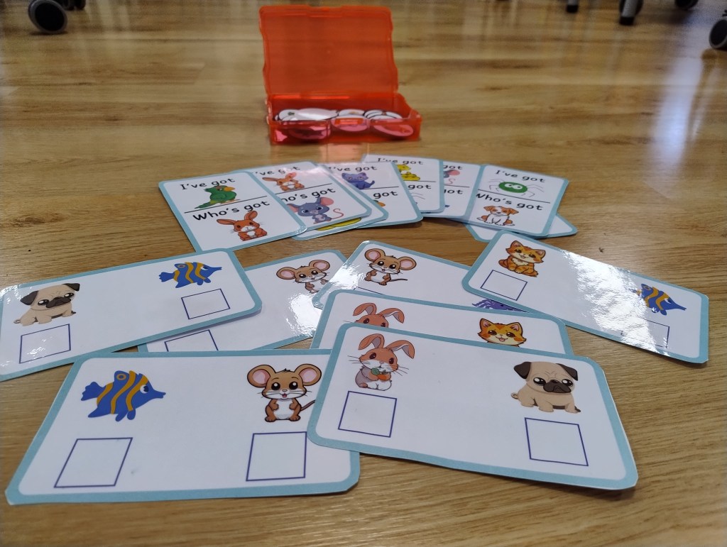 - I’ve got a… Who’s got the…?: Cada alumno recibe unha tarxeta cun animal e debe dicir “I’ve got a…” mencionando o seu animal, seguido de “Who’s got the…?” pedindo por outro animal da clase. O xogo continúa ata que todos os alumnos participen, promovendo a fluidez na expresión oral.