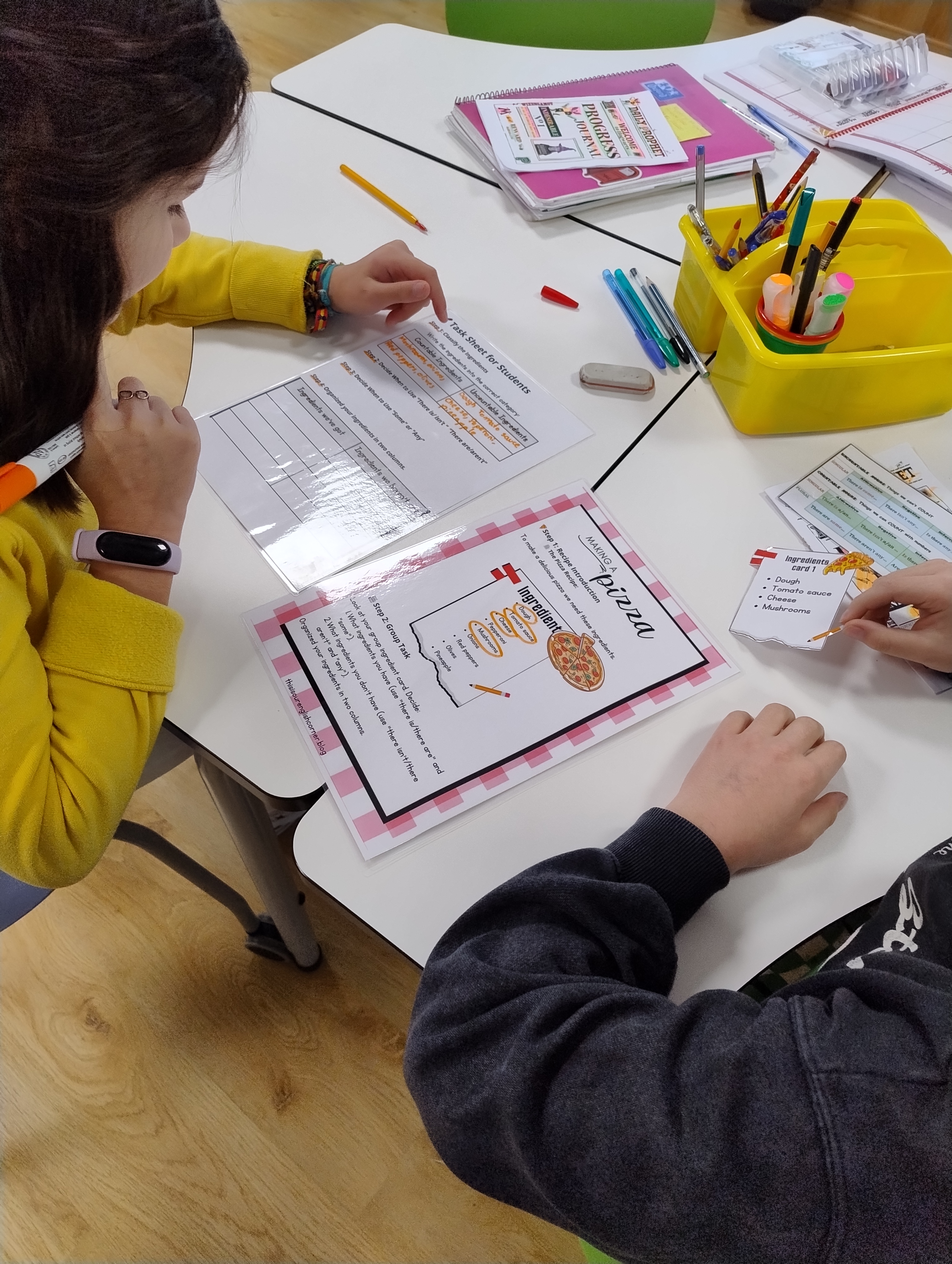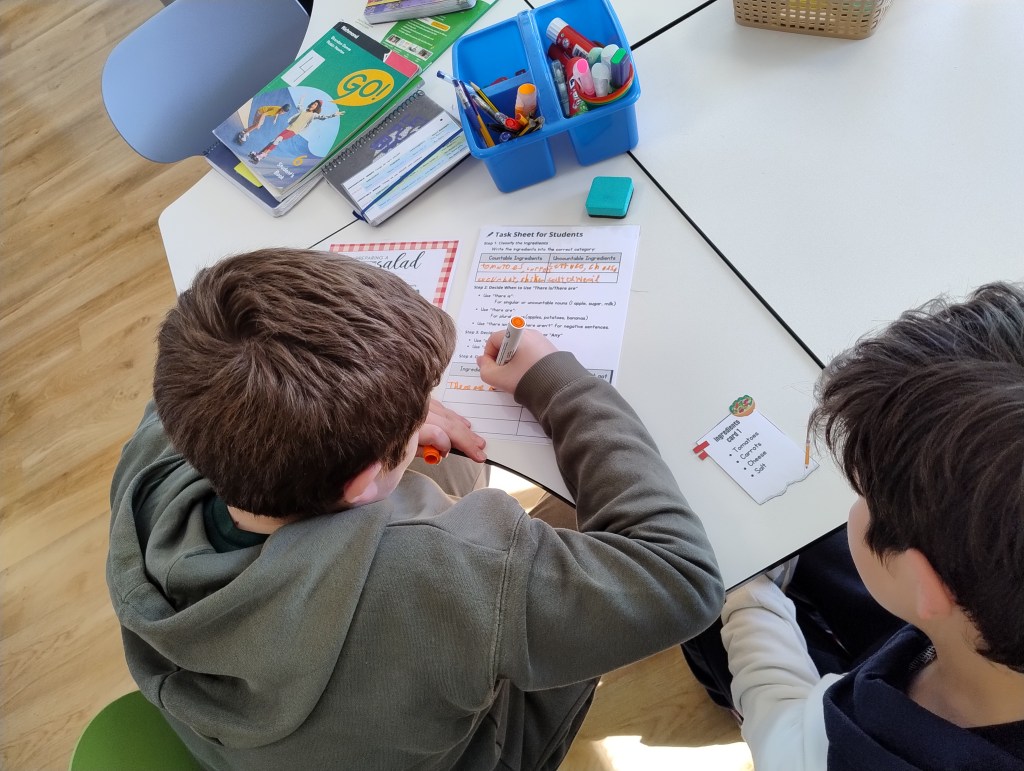 In their groups, students discussed and filled out a table listing the ingredients they had (“There is some flour.”) and the ones they didn’t have (“There isn’t any jam.”). This encouraged teamwork, conversation, and critical thinking as they applied their knowledge in a meaningful context.