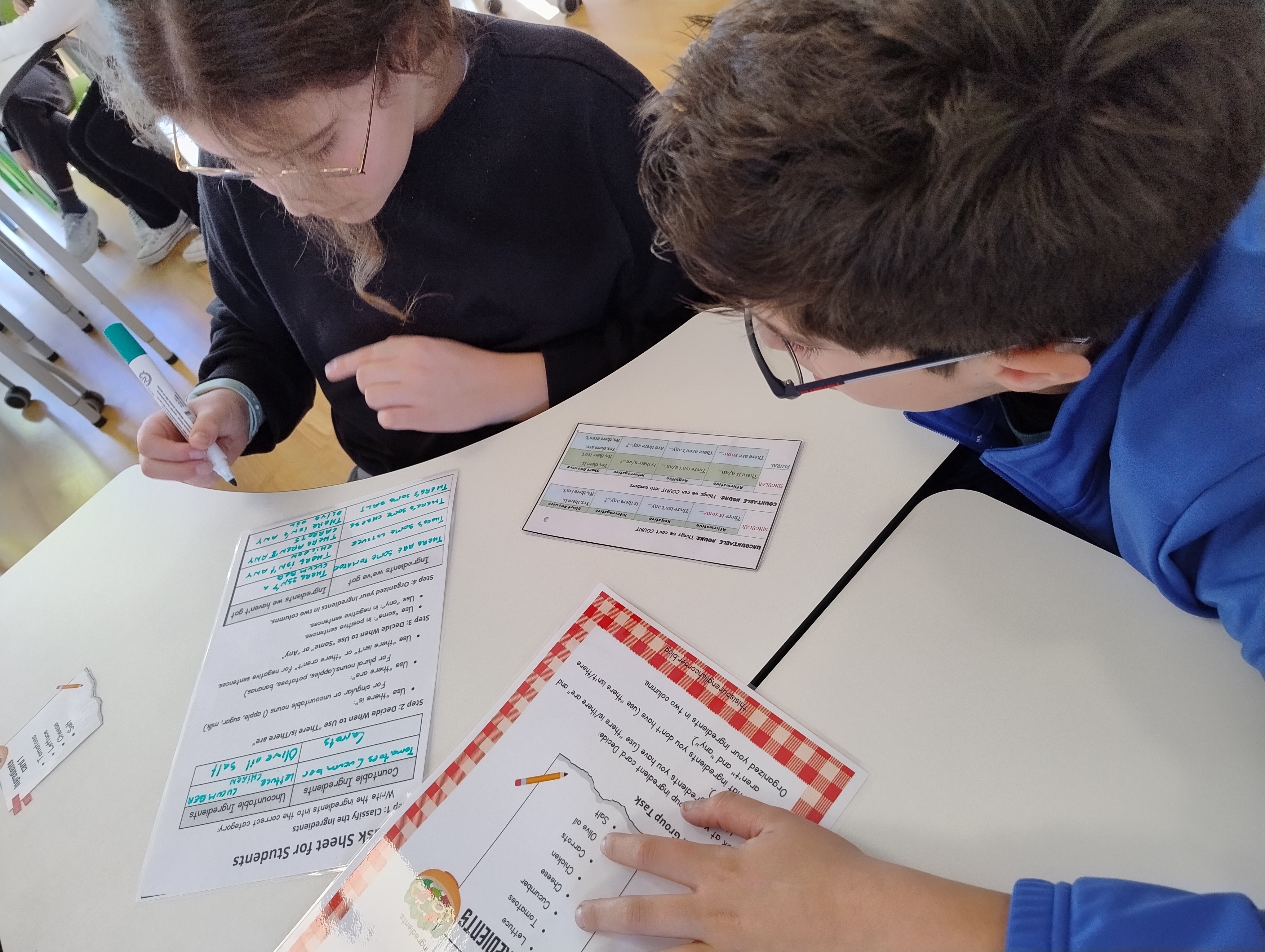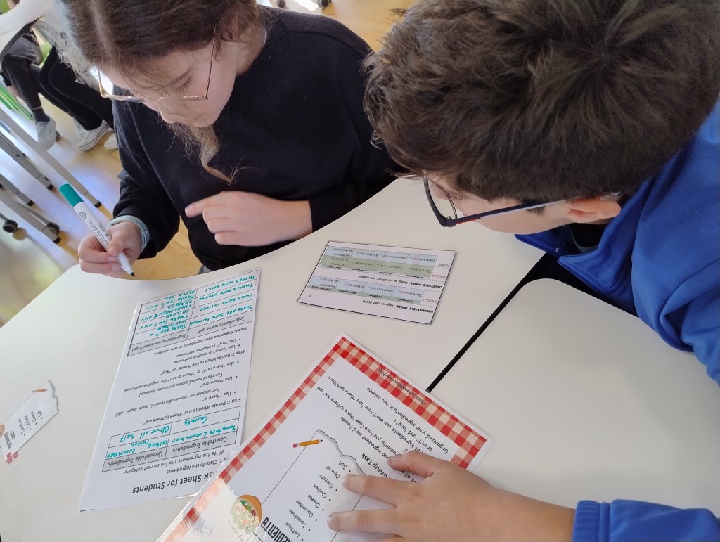 Nos seus grupos, os alumnos discutiron e cubriron unha táboa listando os ingredientes que tiñan (“There is some flour.” ) e os que non (“There isn’t any jam.” ). Isto fomentou o traballo en equipo, a conversación e o pensamento crítico mentres aplicaban os seus coñecementos nun contexto significativo.
