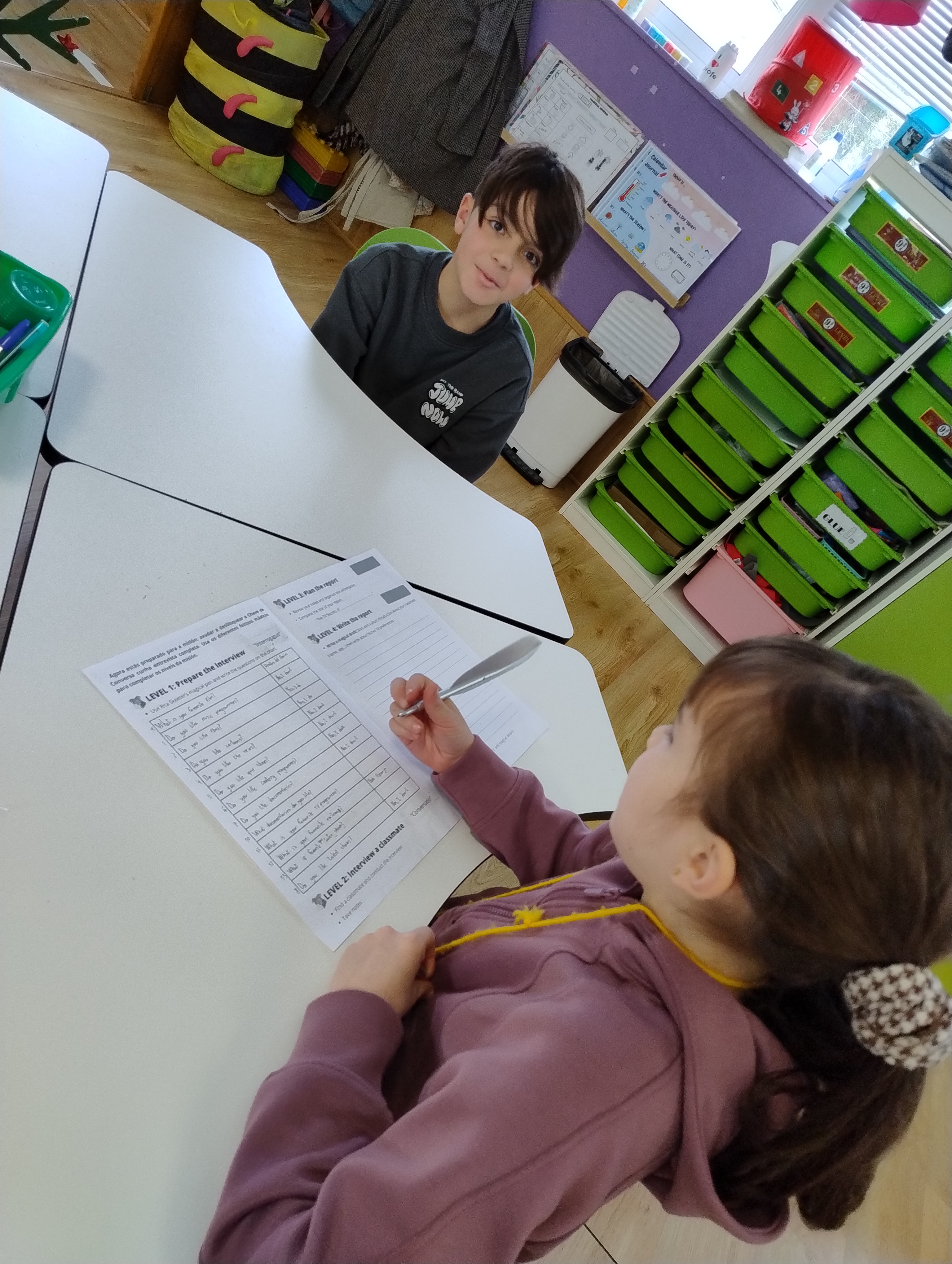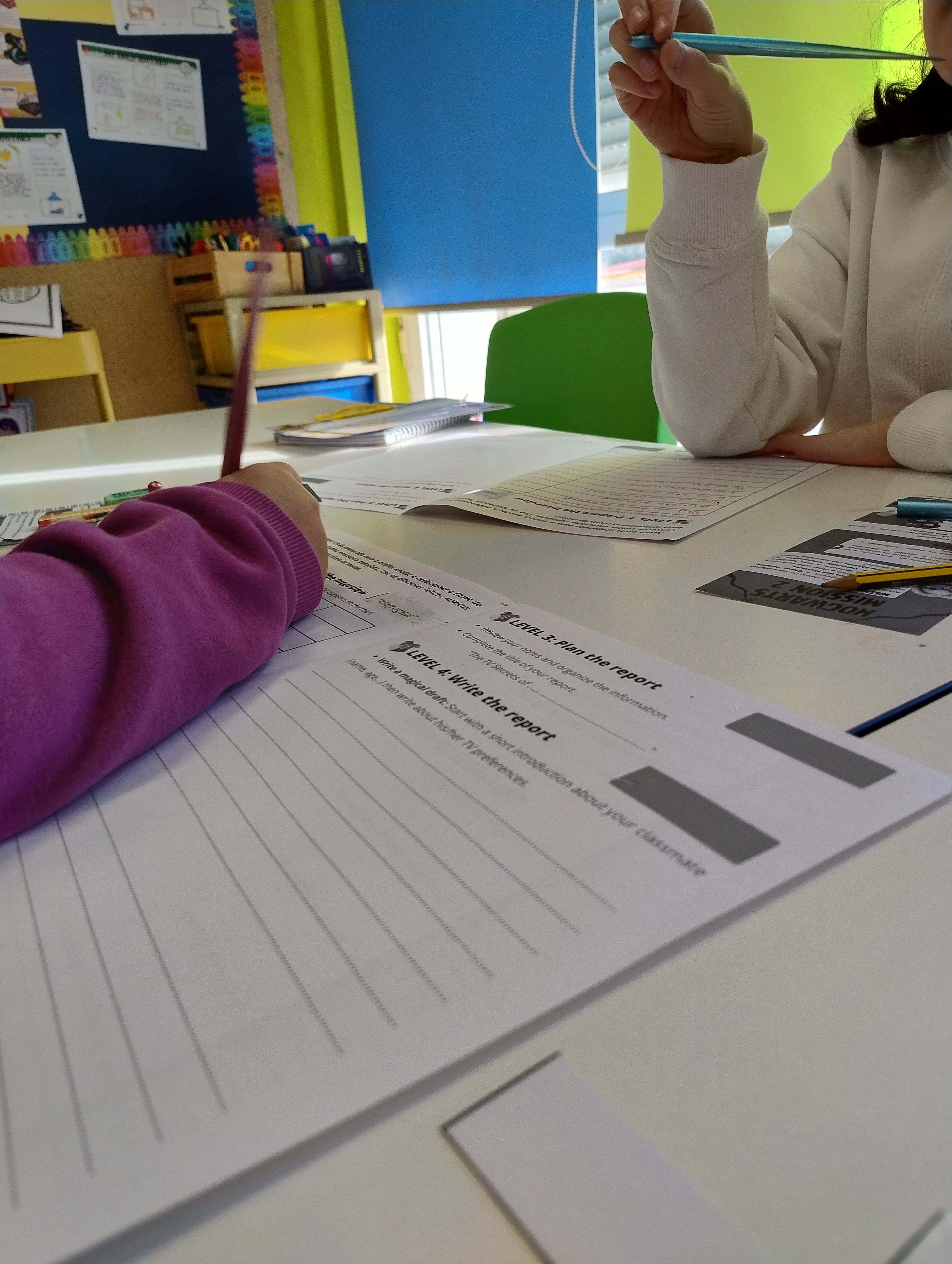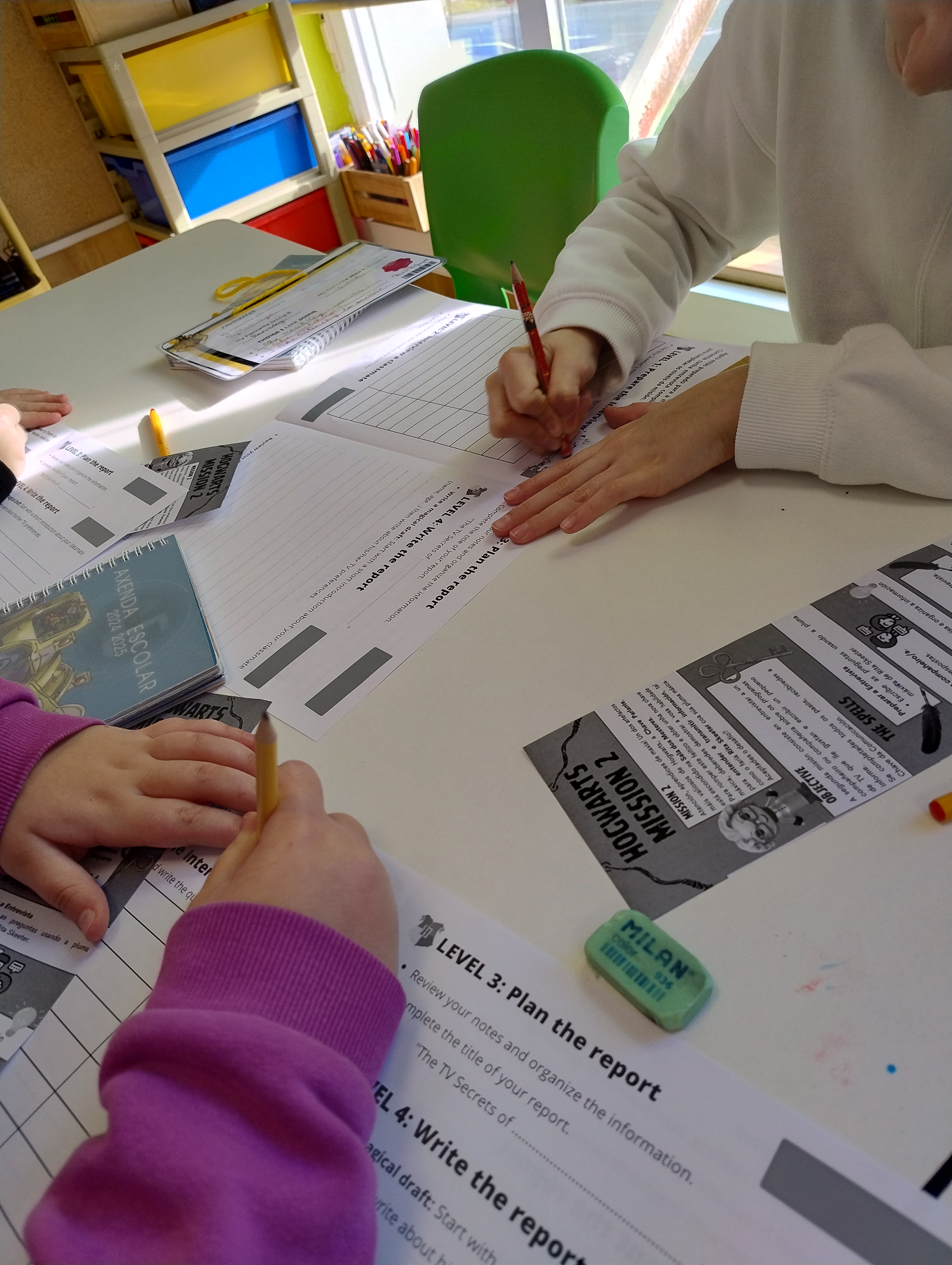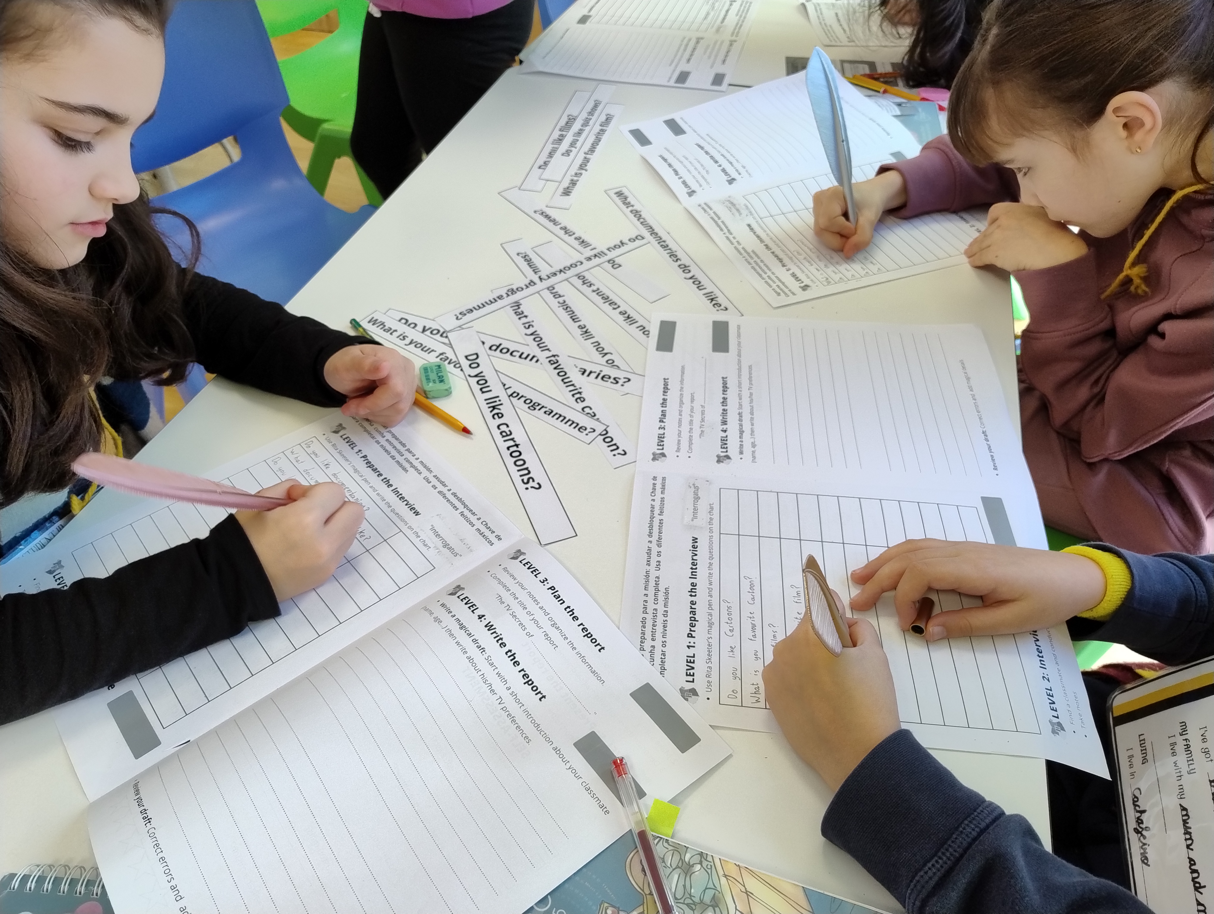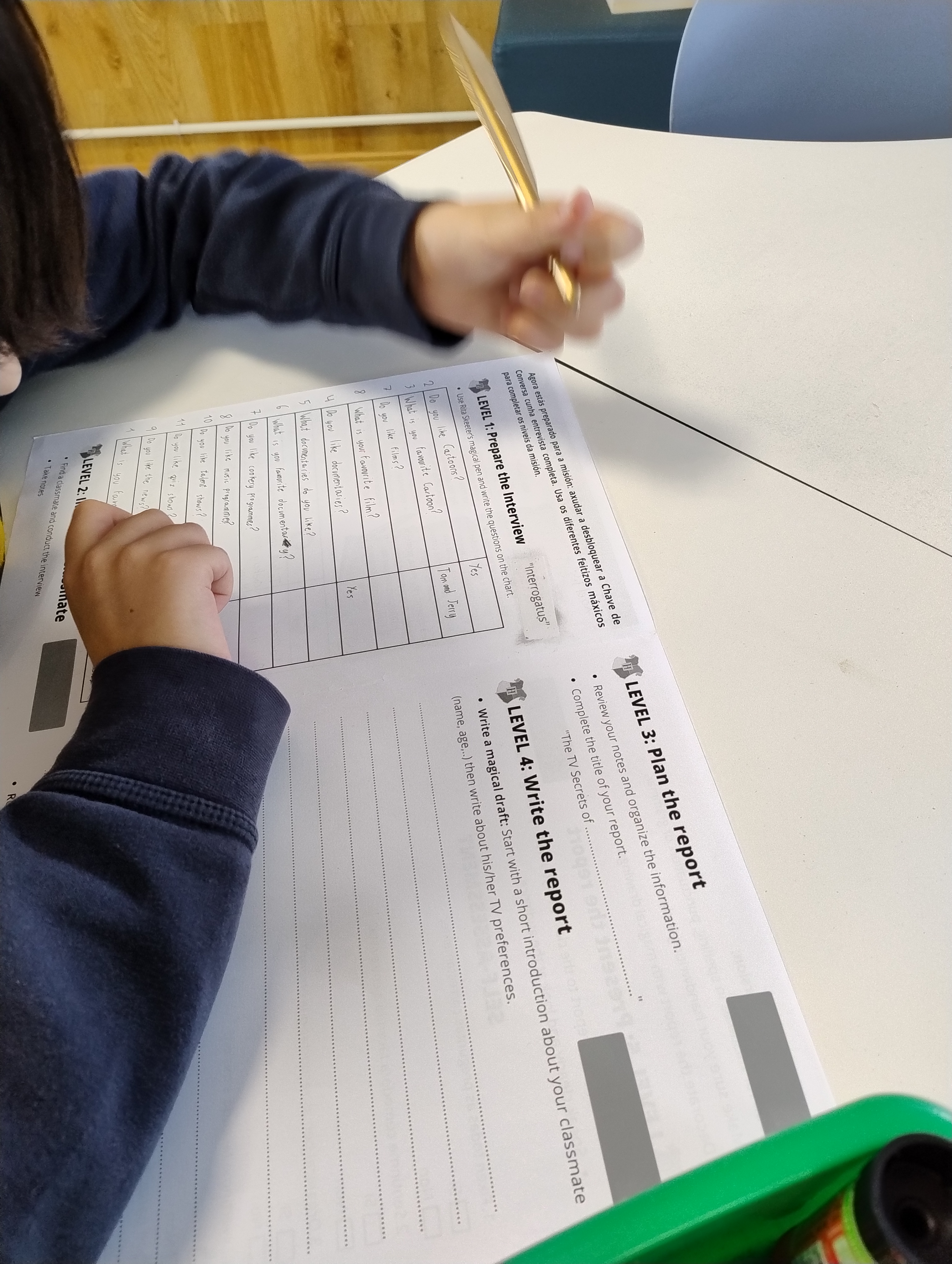 A súa tarefa? Entrevistar a un amigo de 6º de primaria sobre os seus programas de televisión favoritos e escribir un informe para presentar na clase. Fixeron preguntas, tomaron notas e crearon fantásticos informes sobre os gustos televisivos dos seus compañeiros.
