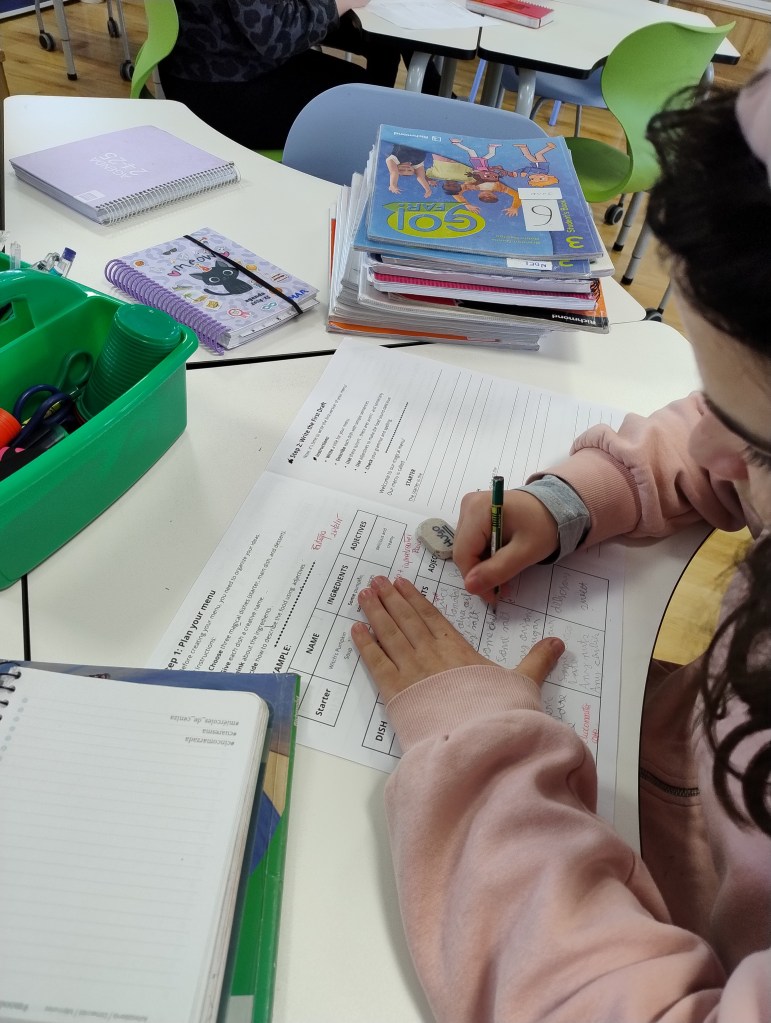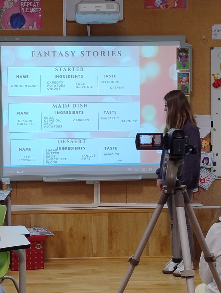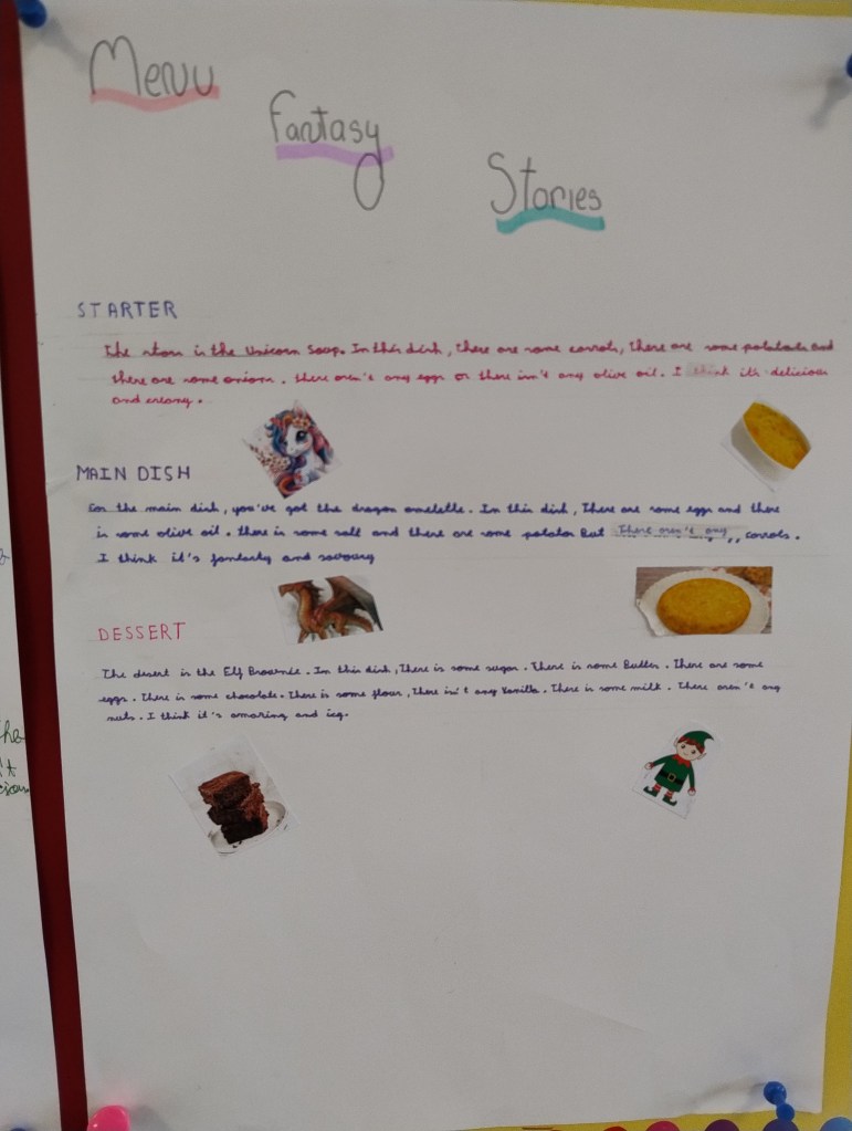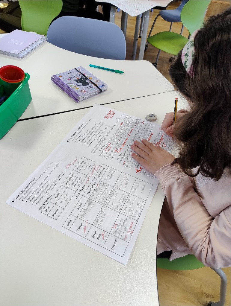 Students thought of magical dishes (starter, main course, dessert, and drink), named them creatively, and wrote down ideas. - Writing the draft