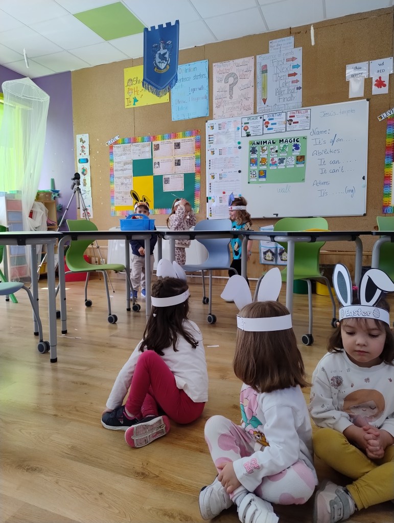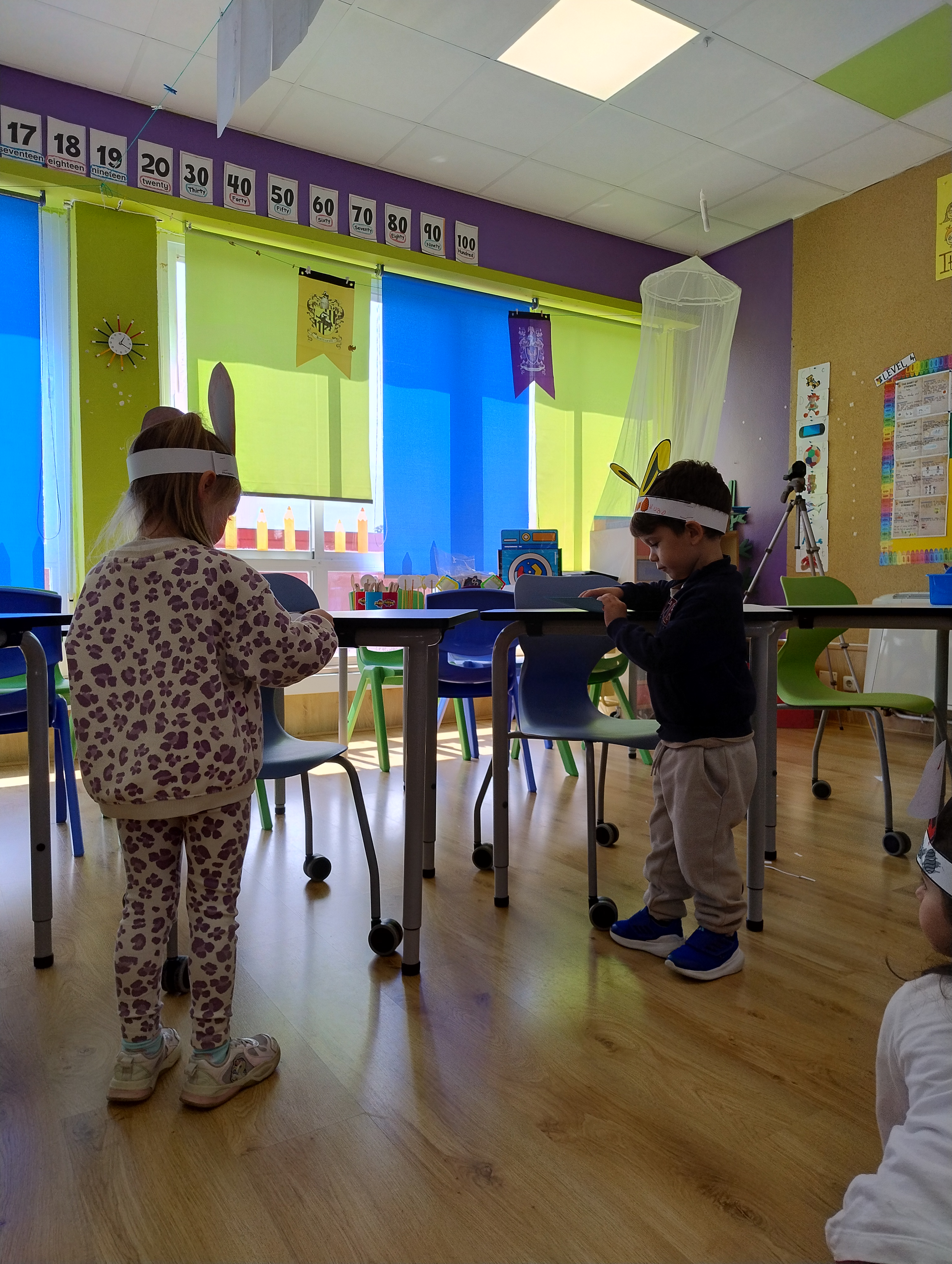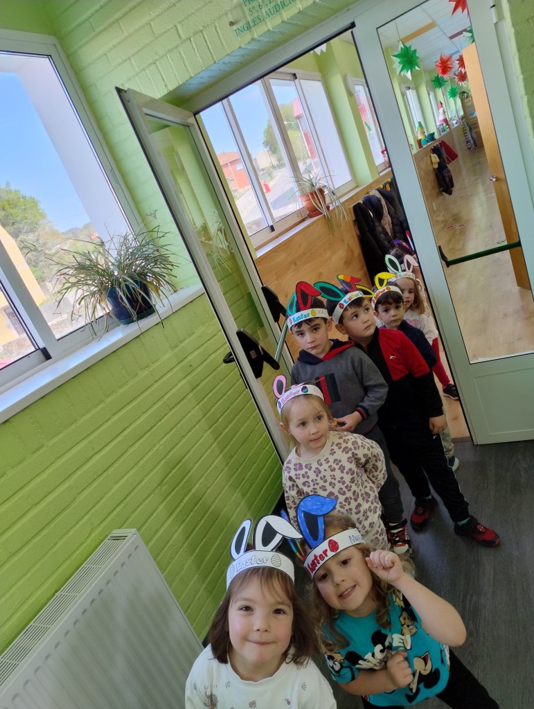 As coroas coas orellas de coello e as cestiñas de papel sacámolas da web Aula en Juego, un recurso moi útil para profesorado creativo. Ambientamos a clase con música, lanternas e ovos de chocolate para crear unha experiencia chea de maxia.