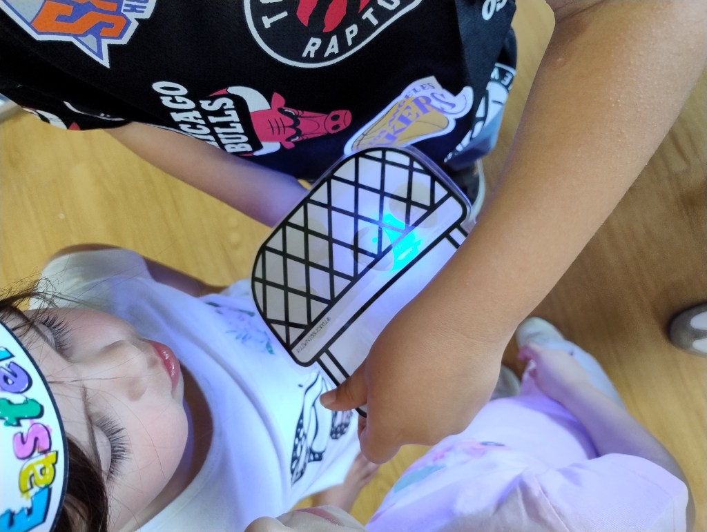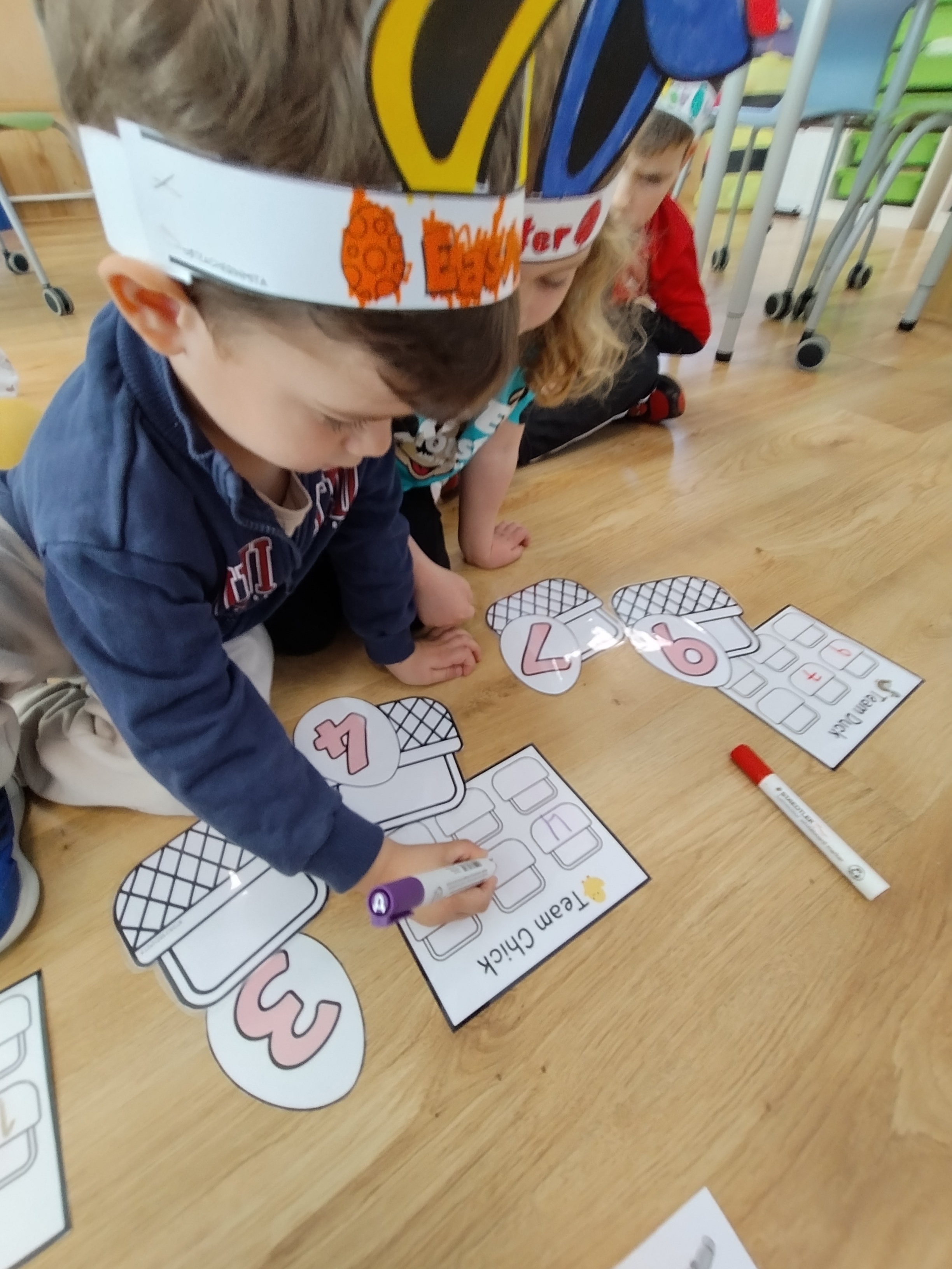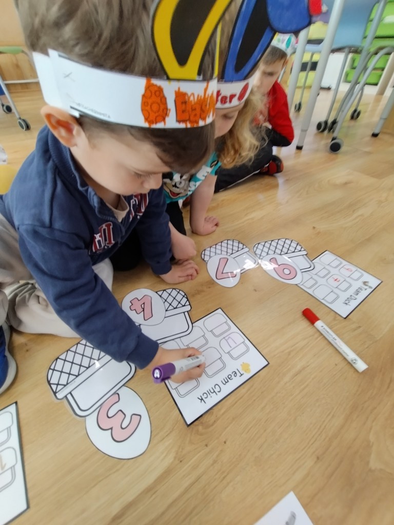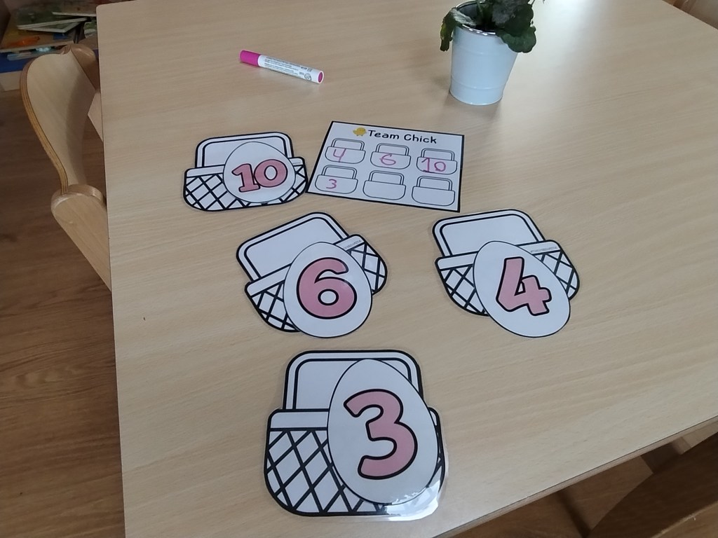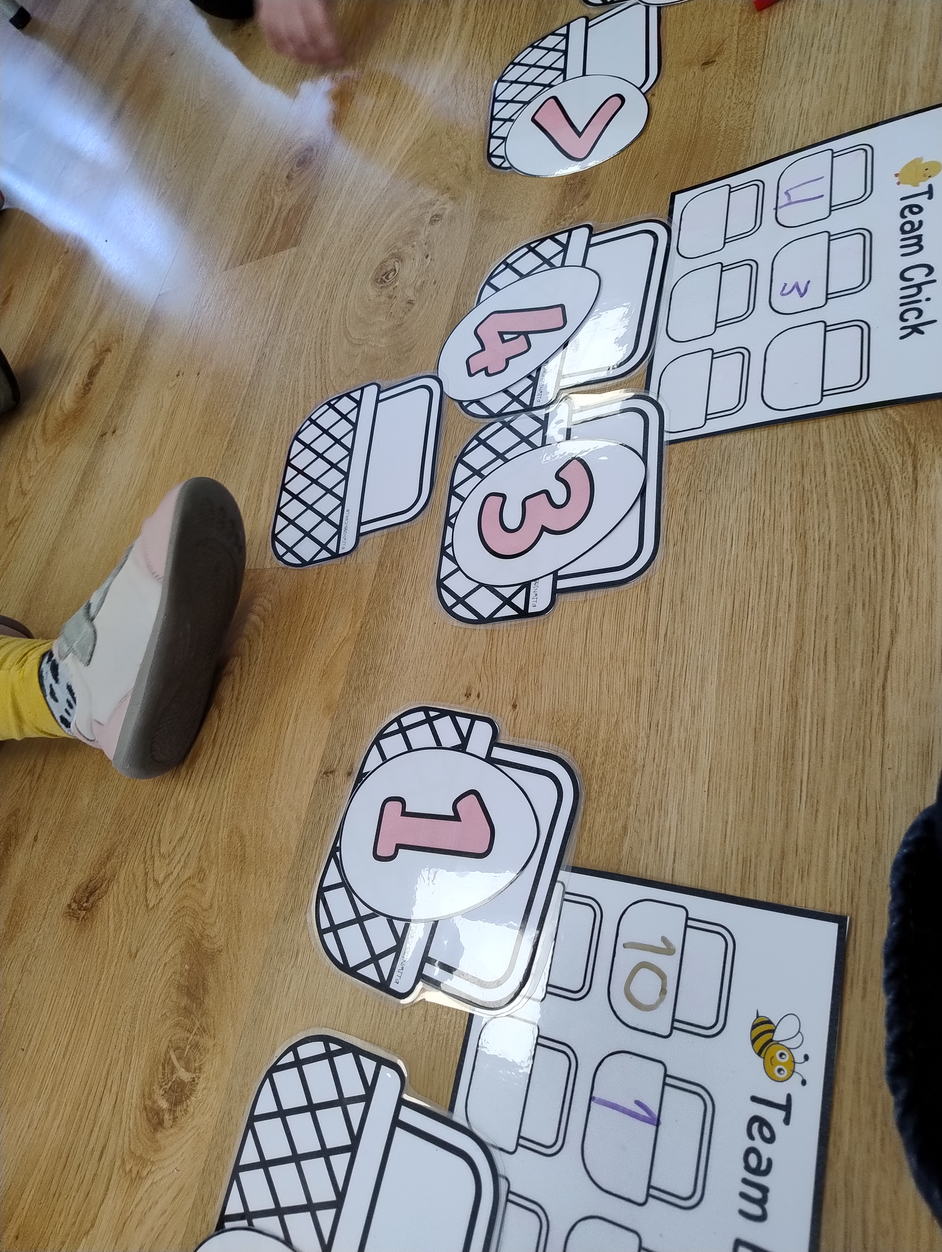 We focused on oral production in English through counting: The children counted out loud in English while searching for the matching basket and number.