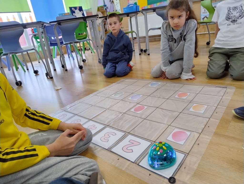 Cada grupo recibía unha misión secreta, como “Find the yellow egg” ou “Go to number six”. Tiñan que programar o Bee-Bot para chegar á casiña correcta. Se se equivocaban, analizaban o erro e volvían tentalo xuntos.