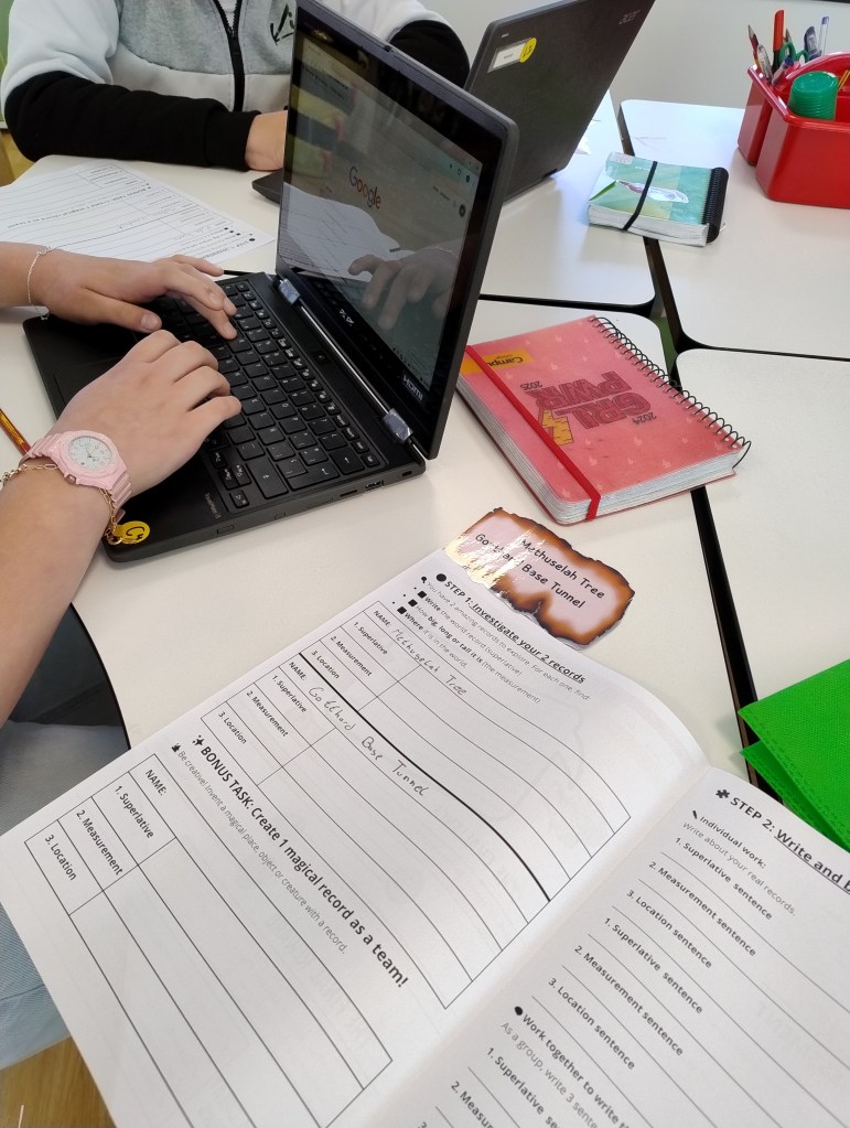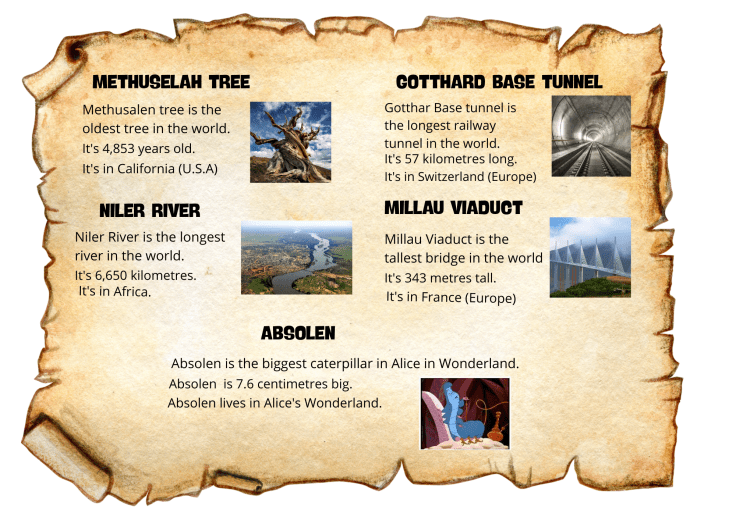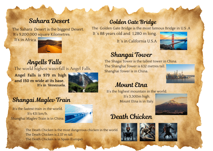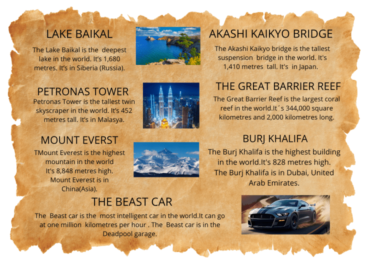 Cada alumno/a investigou dous récords reais e escribiu tres frases para cada un: superlativo, medida e lugar.