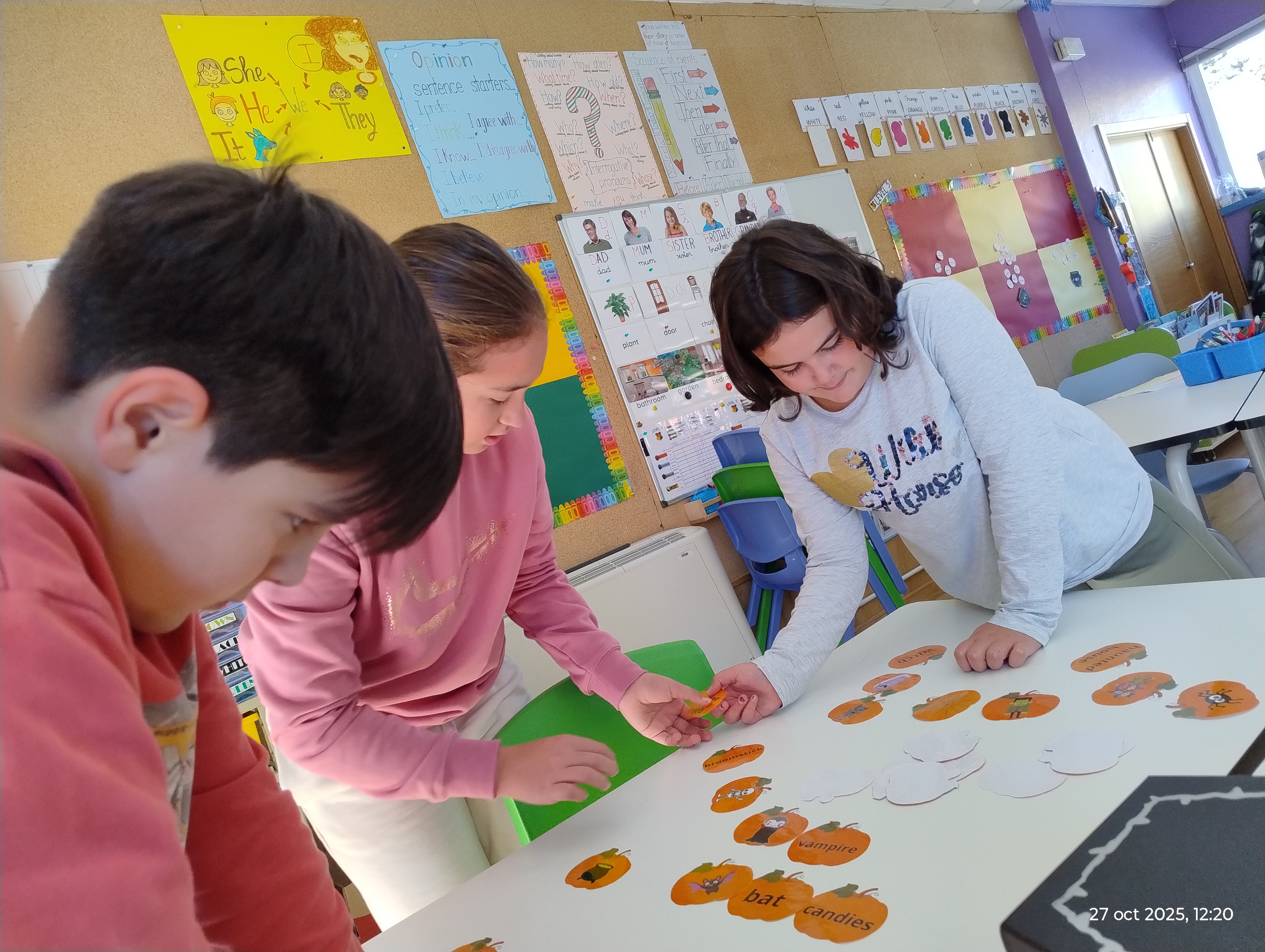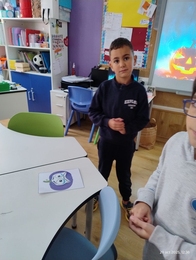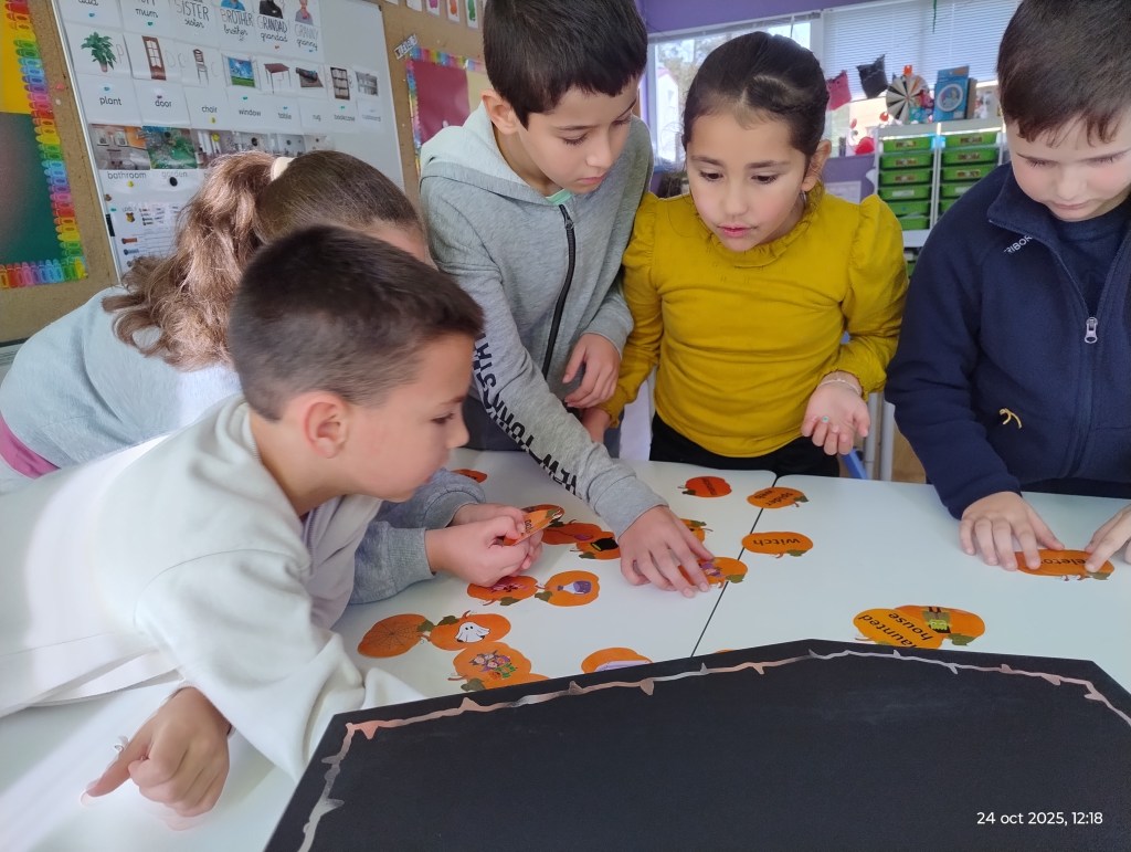 - Os máis maiores tiveron que emparellar cabazas desordenadas, unhas con imaxes e outras con palabras, para traballar o vocabulario de Halloween.