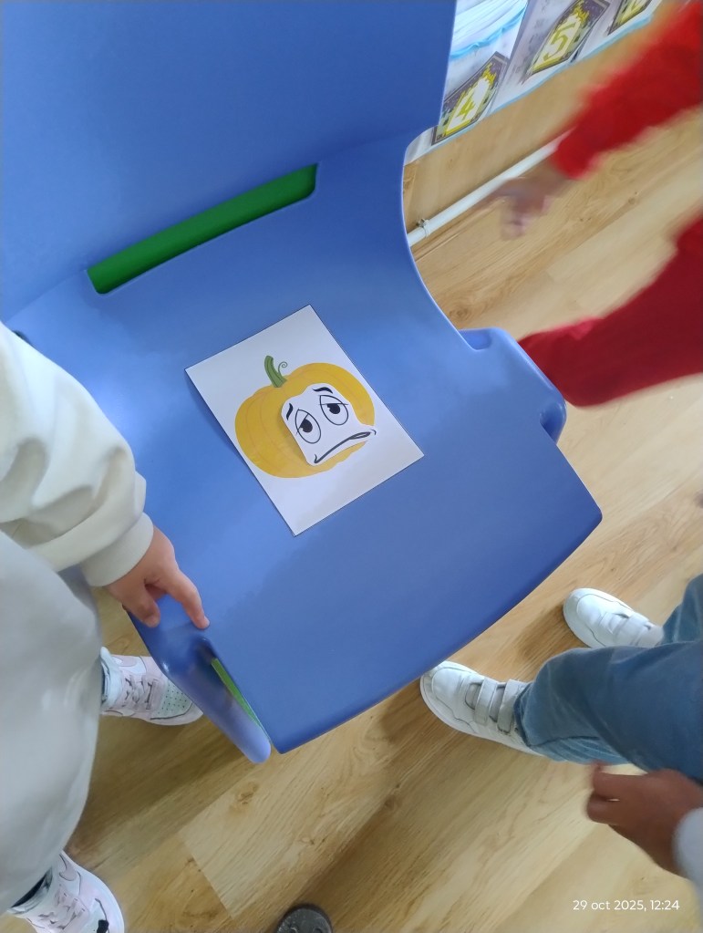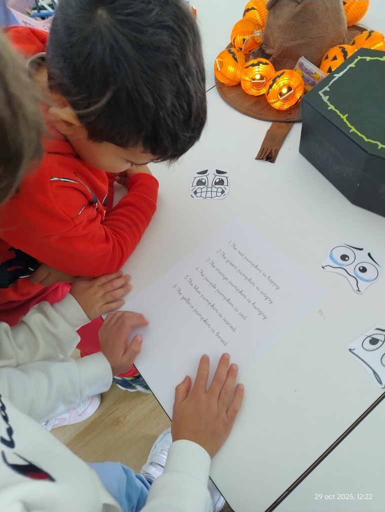 - The younger children put faces on pumpkins (happy, sad, scared, angry, hungry…) following simple instructions in English.