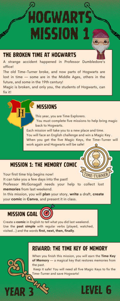In the first mission, The Memory Comic, students become Time Explorers and create a comic in English about what they did last weekend, using the past simple tense.
