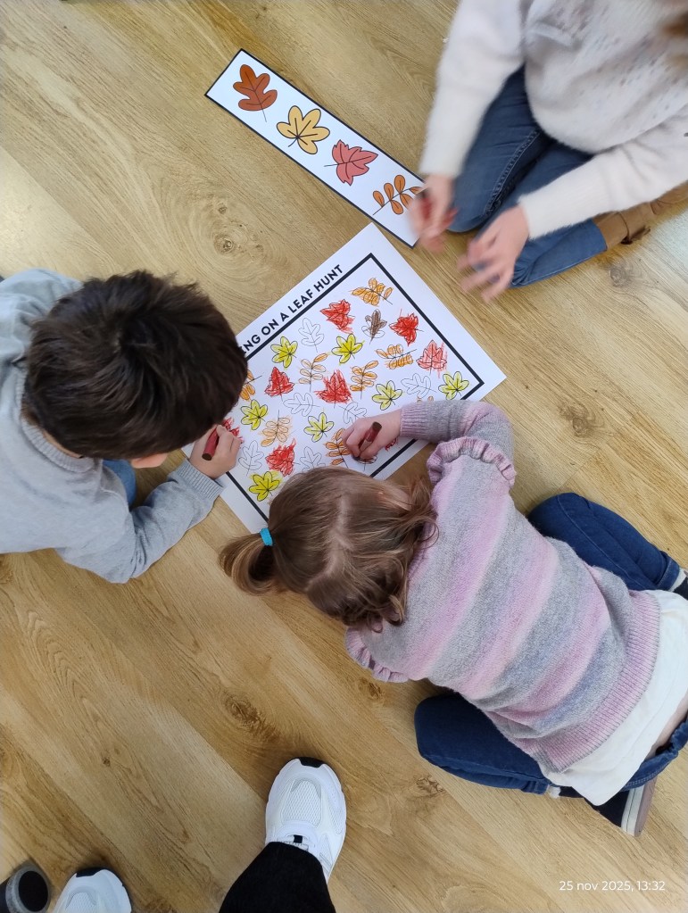 The children looked for these leaves and coloured them on a giant class poster, practising:
