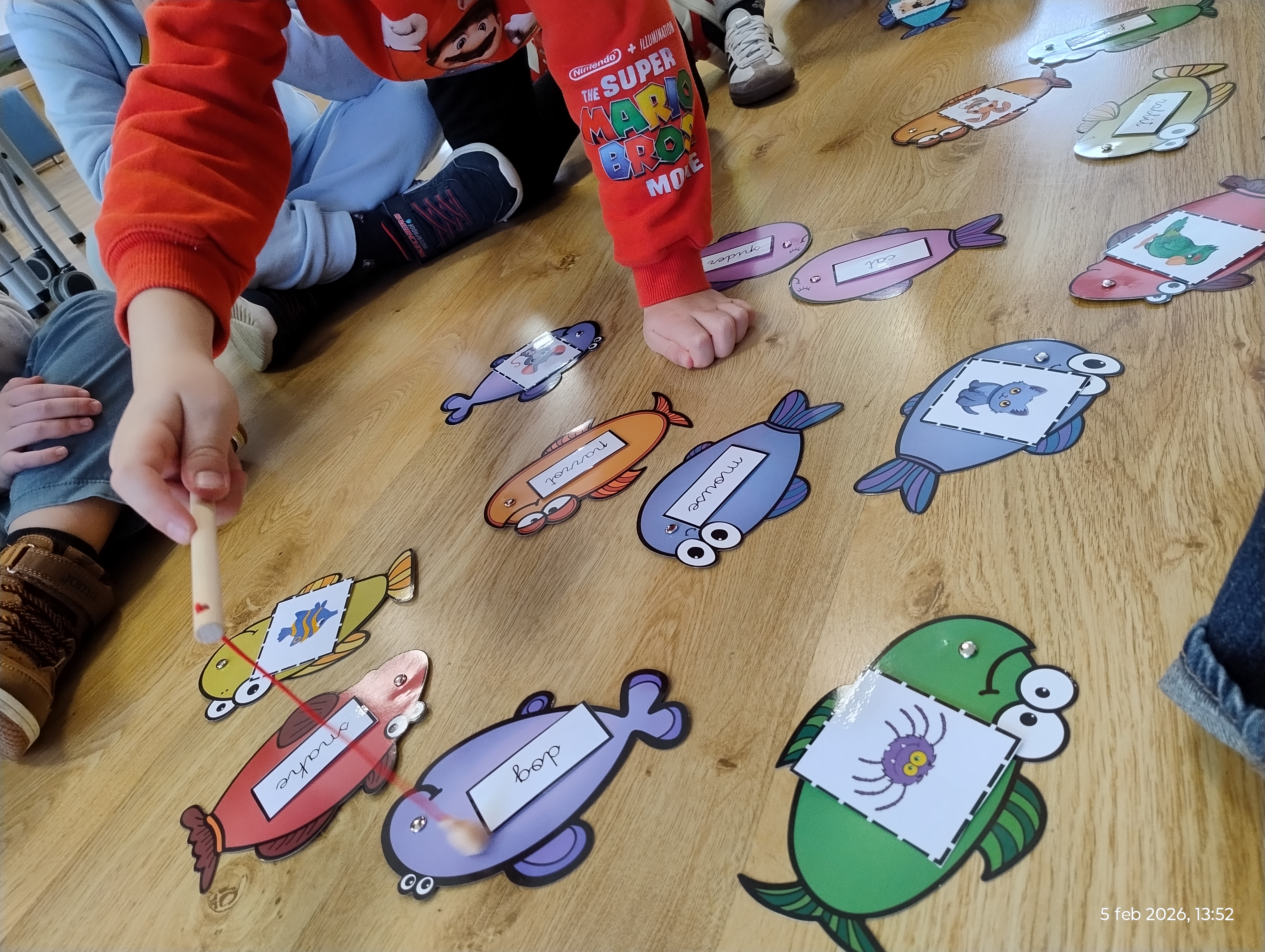 During the activity, the teacher names an animal , and the children “fish” the correct cards using the magnetic fishing game. This helps improve listening skills and early reading, allowing students to link sounds, images, and words. This method uses active and multisensory learning, which enhances attention, memory, and understanding in young children.