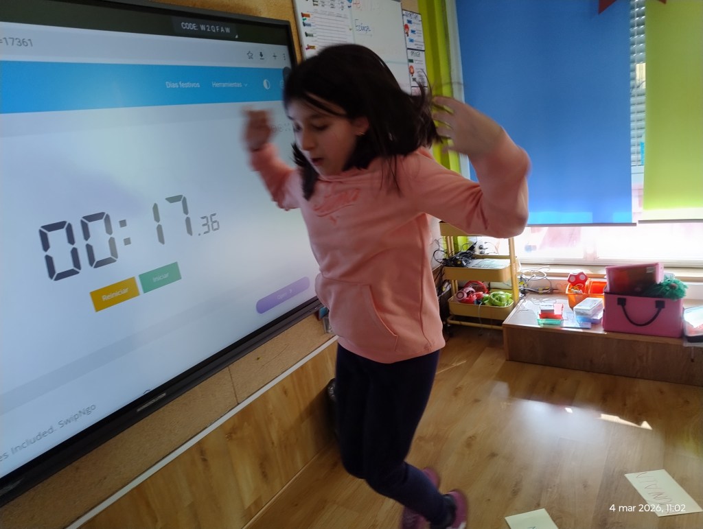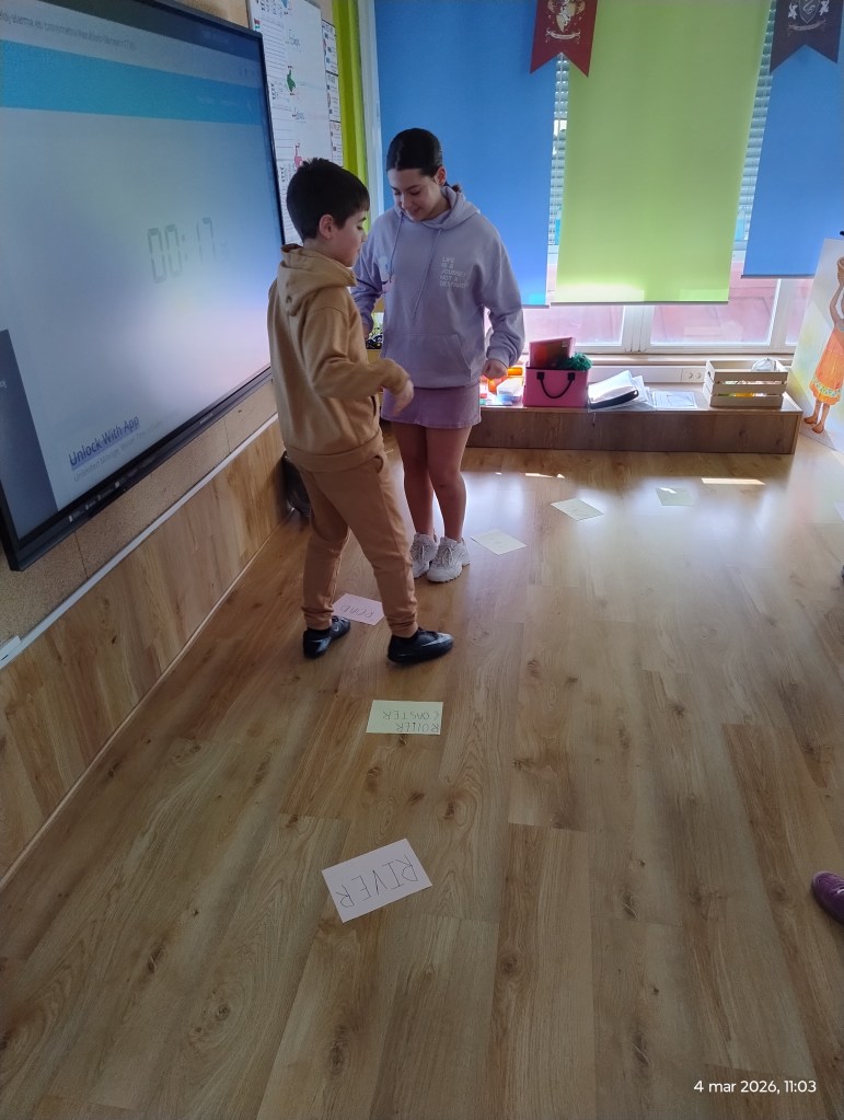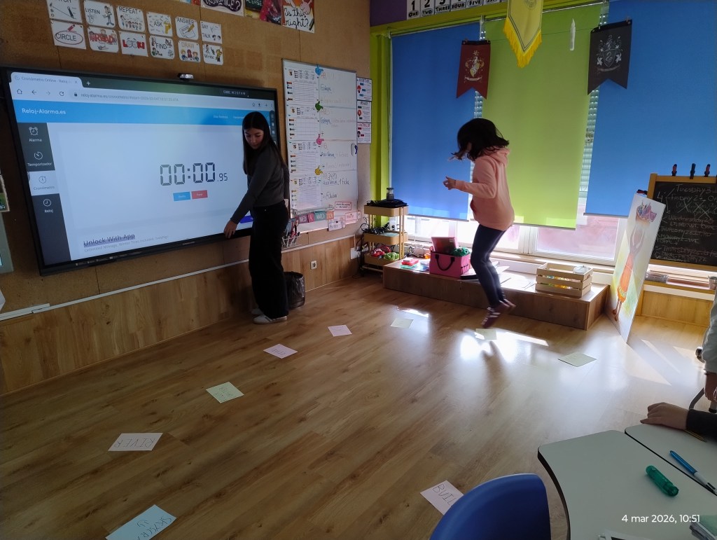 No primeiro xogo, as tarxetas estaban no chan e o alumnado saltaba sobre elas dicindo palabras en voz alta, cronometrados por un compañeiro; gañaba quen o facía máis rápido, practicando vocabulario, pronunciación e fluidez, e introducindo o superlativo.