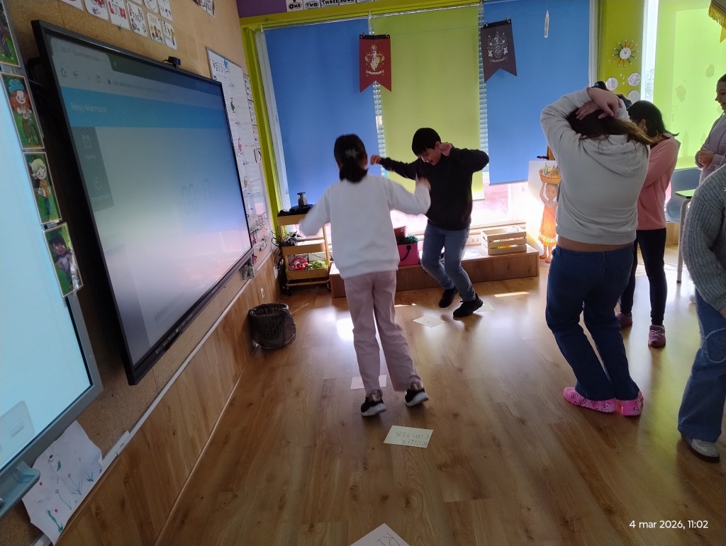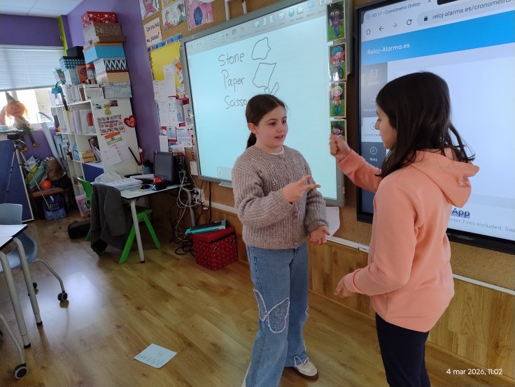 We also played a very exciting team game based on stone, paper, scissors. The class was divided into two teams, with one team on each side of the cards. Students moved forward by jumping on the flashcards and saying the words aloud. When two players met, they played rock, paper, scissors. The winner continued moving forward, while the loser went back to the end of the line and a new teammate started. The first team to reach the end of the cards won the game.