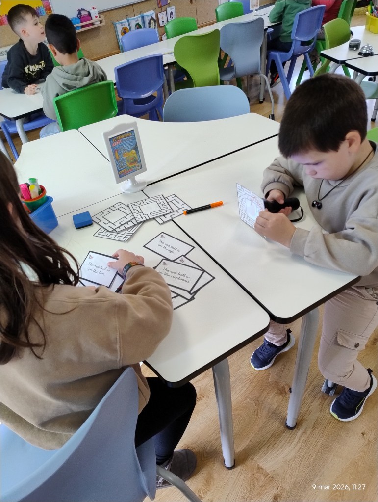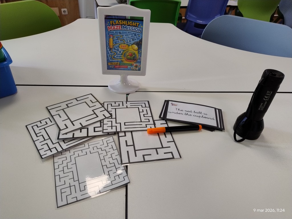 Flashlight Maze Mission 🔦 This was the favorite! Students navigated a paper maze. When they reached the center, they used a flashlight to reveal a secret image. Then, they had to find the matching sentence card. Total mystery!