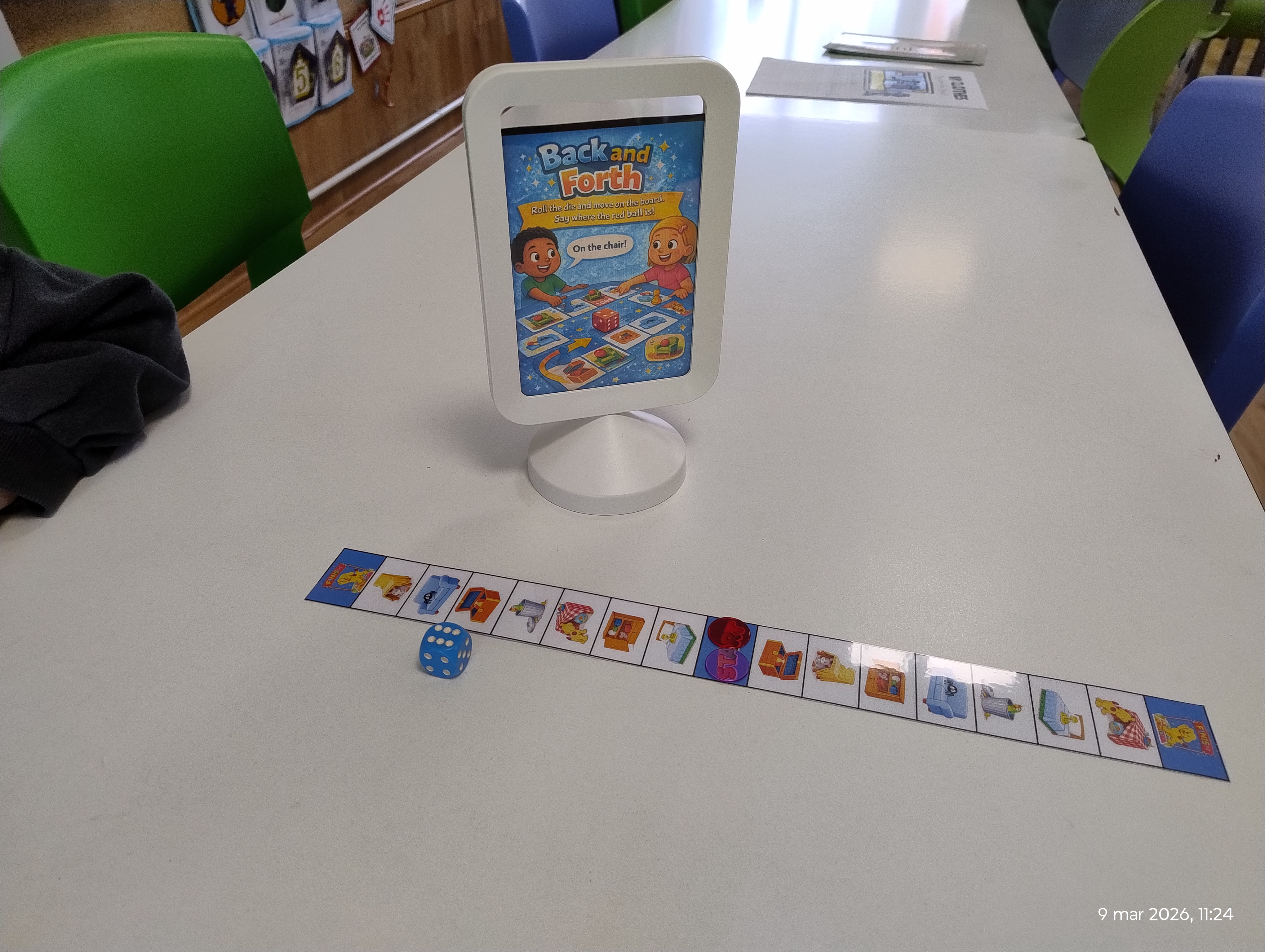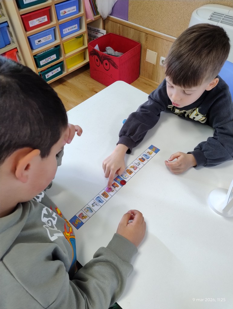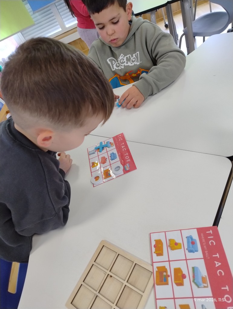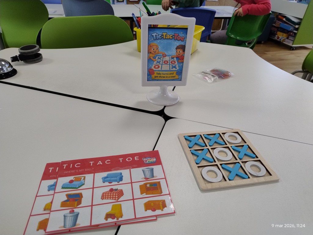 Tic-Tac-Toe (Noughts and Crosses) ❌⭕ A classic game with an English twist! To place their mark, students had to say a full sentence, like: “The red ball is on the table.” 3. Back and Forth: The Board Game 🎲 Students rolled the dice and raced to the finish line. Every square had a hidden surprise. They practiced sentences like: “The spider is on the sofa” or “The cat is under the bed.”