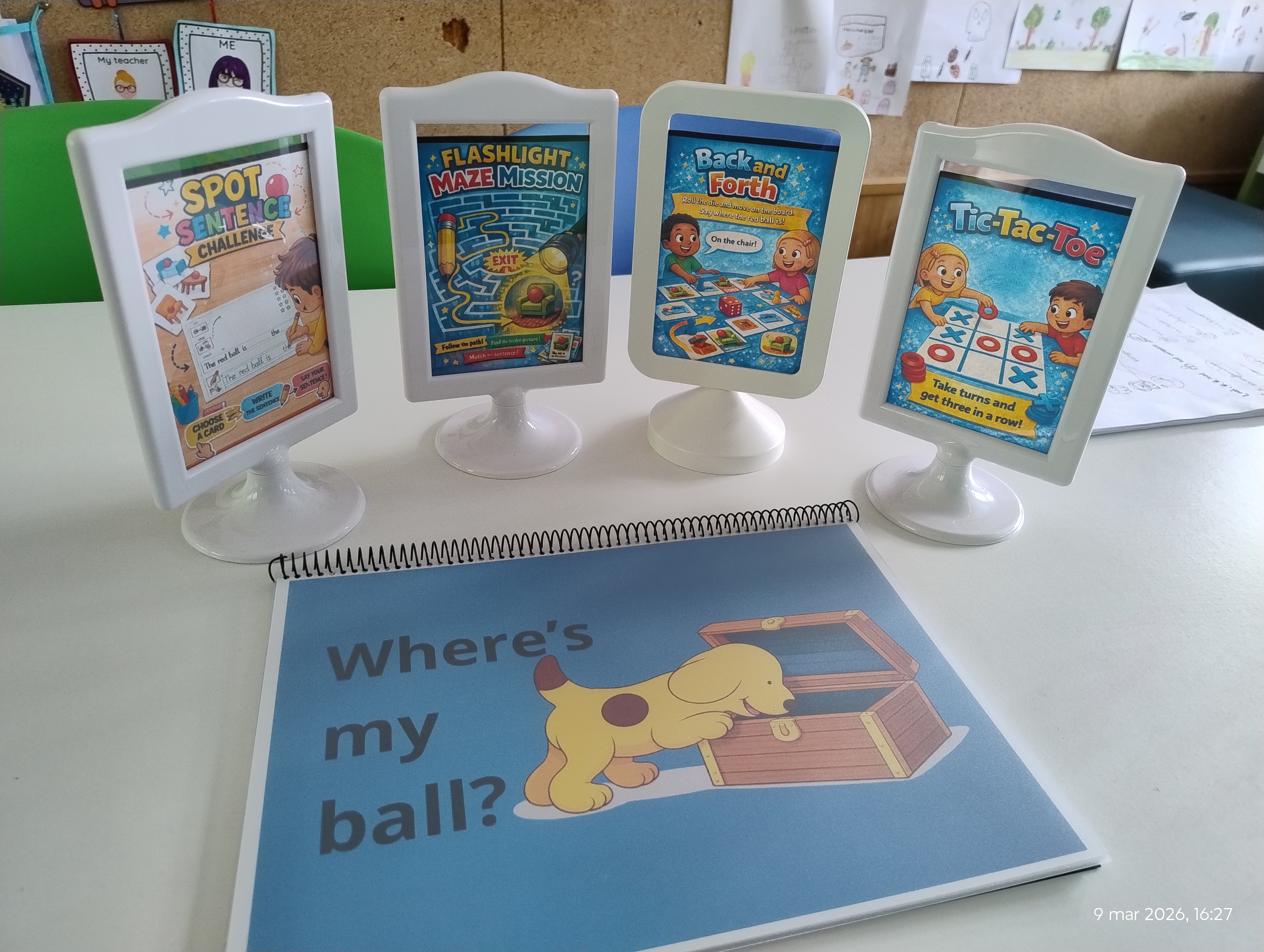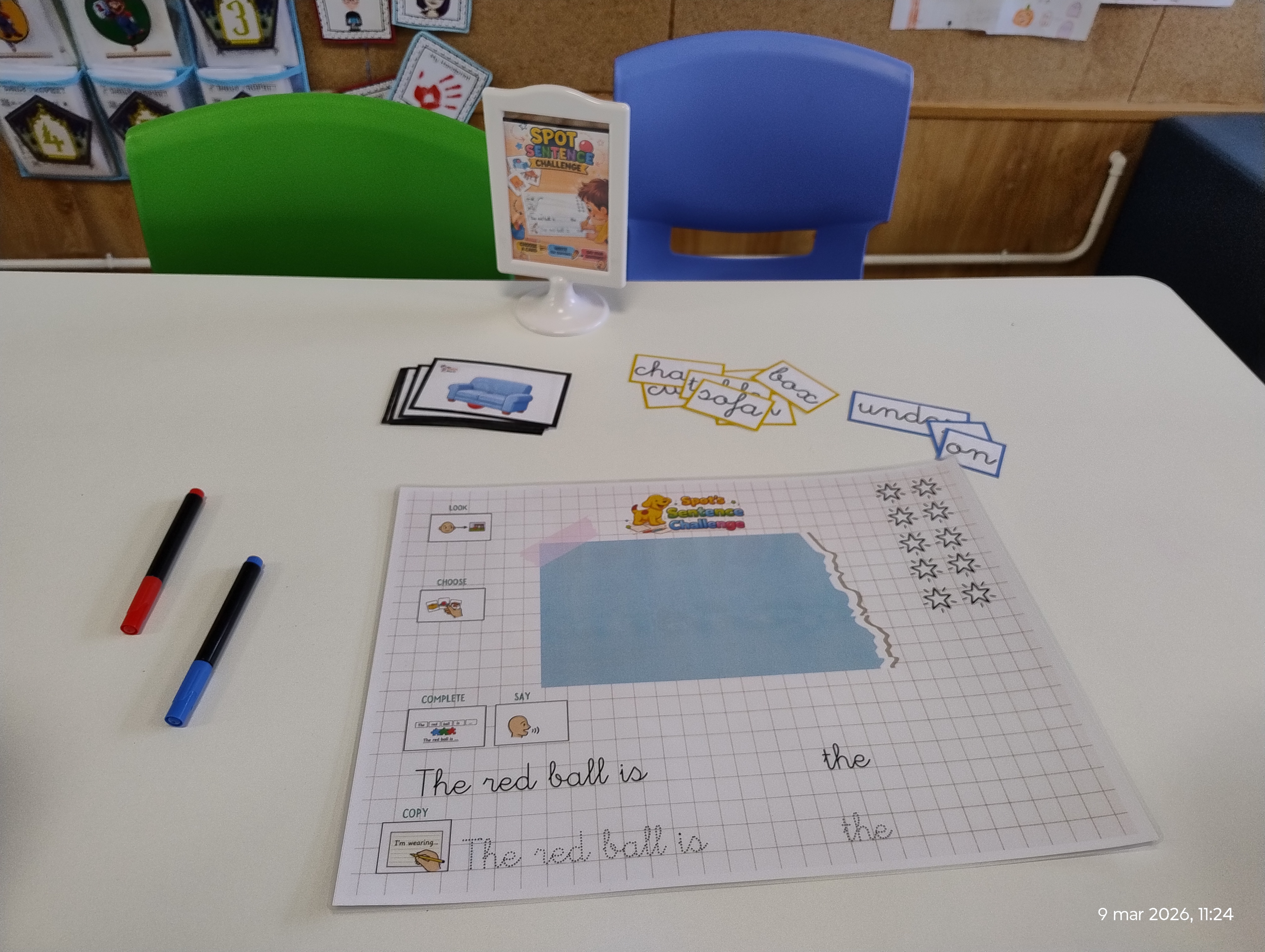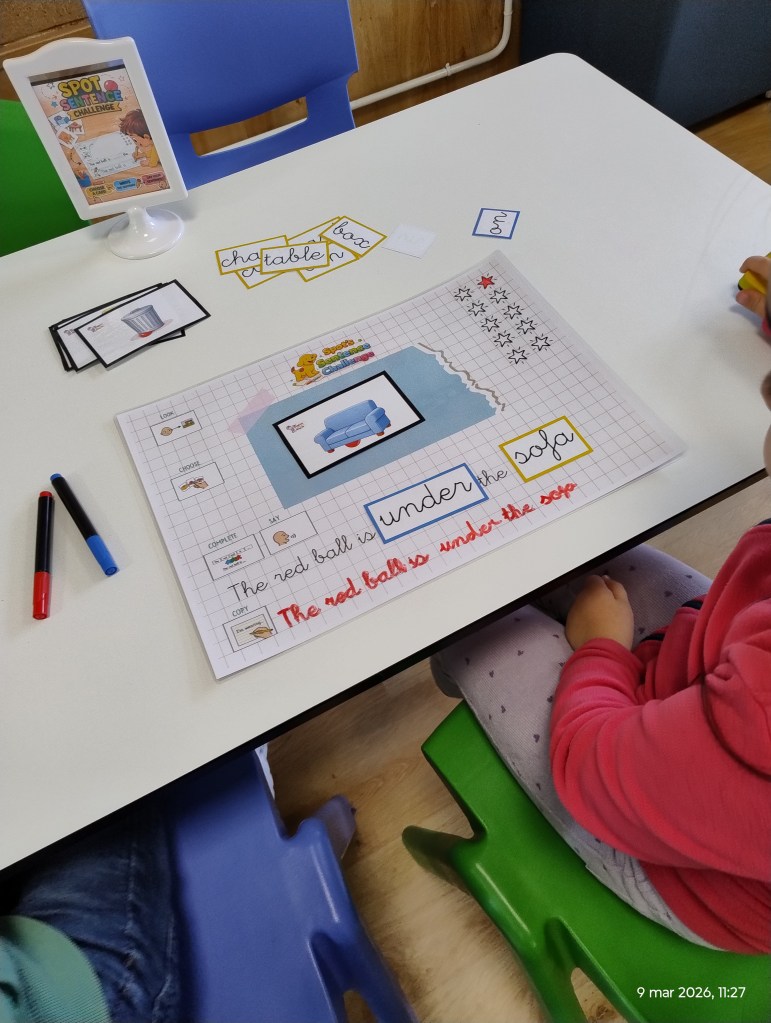 Spot Sentences Challenge 📝 In this station, students picked a card and looked for the red ball. One student said the location out loud, while the partner used word cards to build the sentence and write it down. Great teamwork!