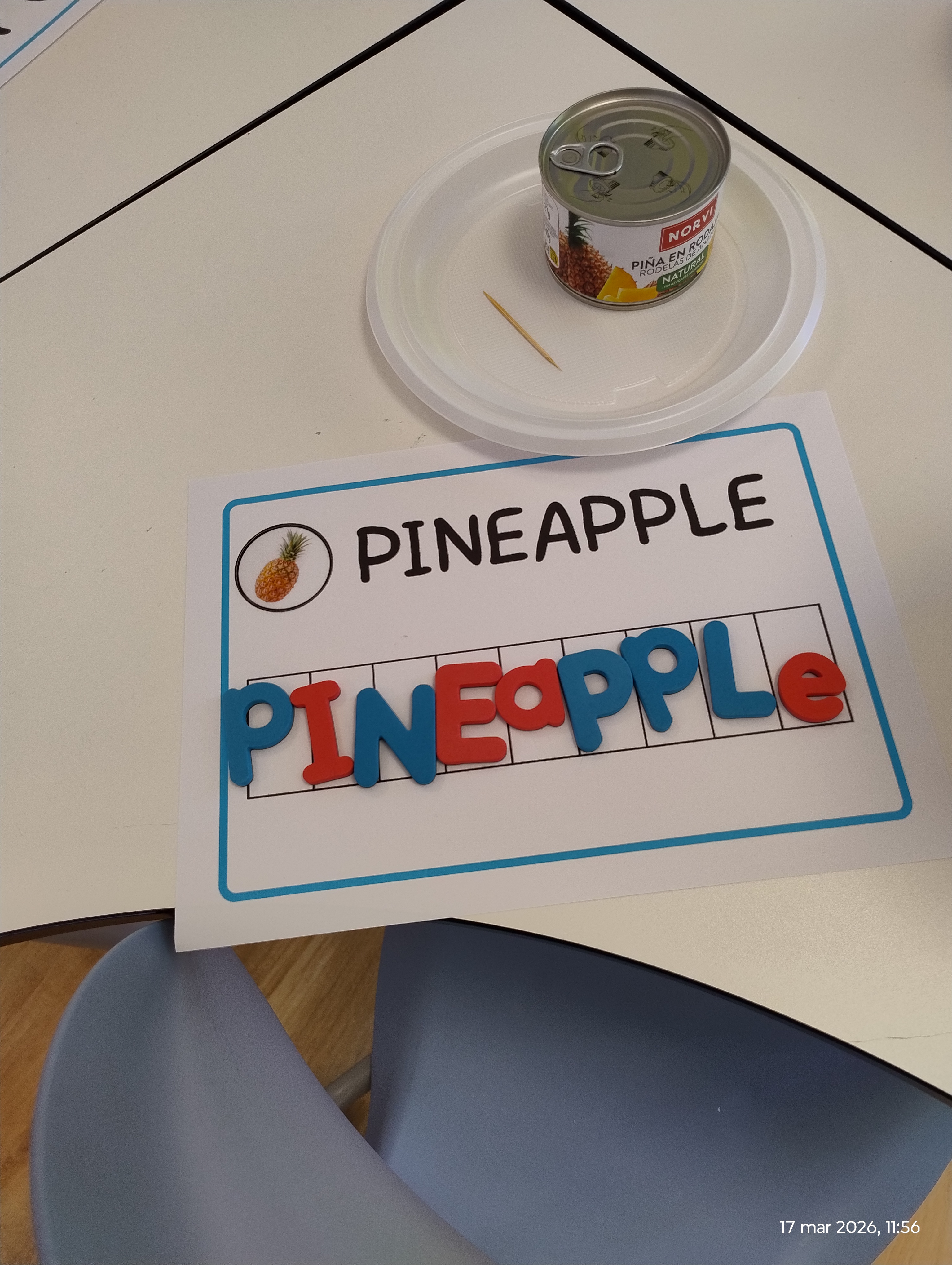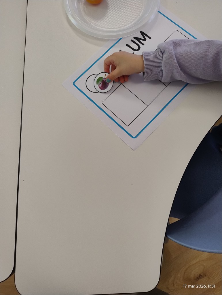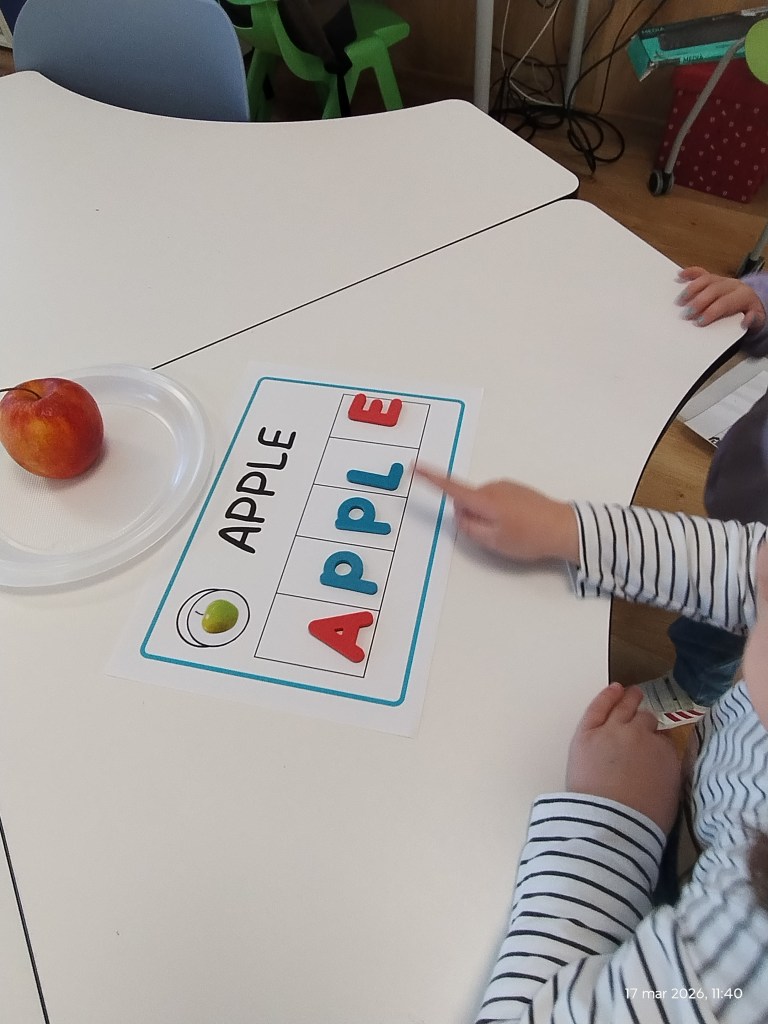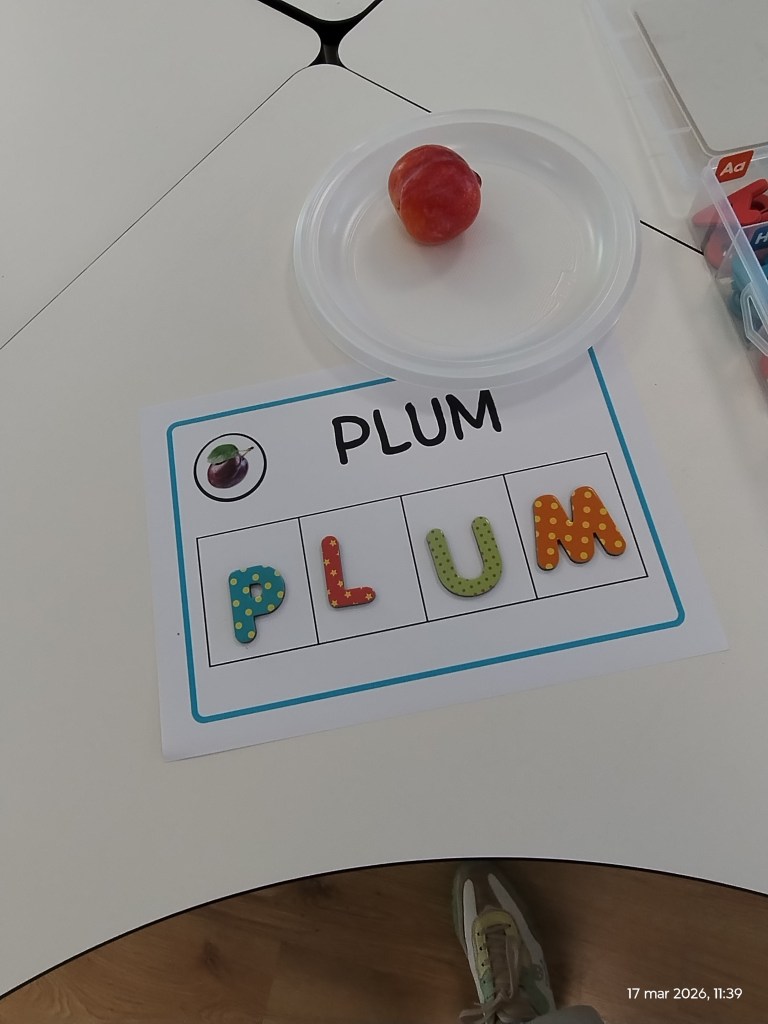One of the most valuable parts of this experience was its clear playful dimension. Movement instructions, real fruits, letter manipulation and colouring activities made the lesson feel like a game.