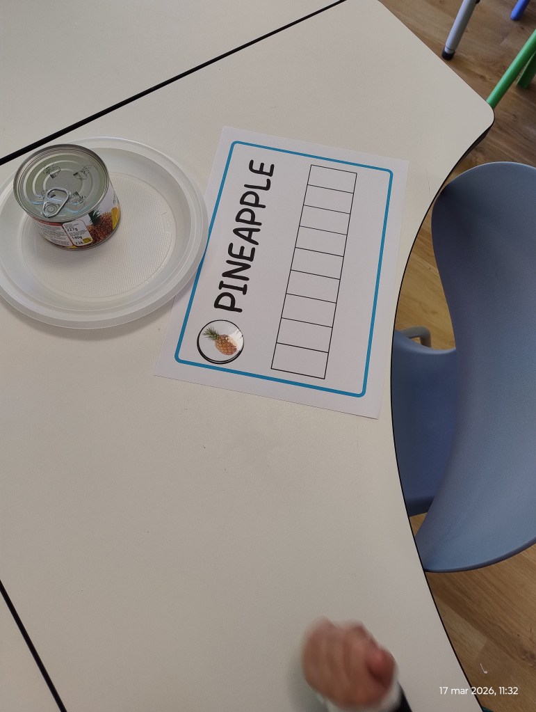 Hoxe fixemos unha sesión de inglés para aprender o vocabulario das froitas e a estrutura “I like…” dun xeito divertido, activo e significativo.