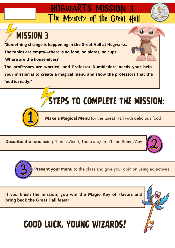 Nesta misión, o alumnado de 6º de Primaria creou menús máxicos, practicou expresión escrita e oral en inglés e empregou vocabulario e estruturas gramaticais dun xeito creativo e significativo. Foi unha actividade moi motivadora na que tamén desenvolveron a súa imaxinación e compartiron os seus traballos coa clase.